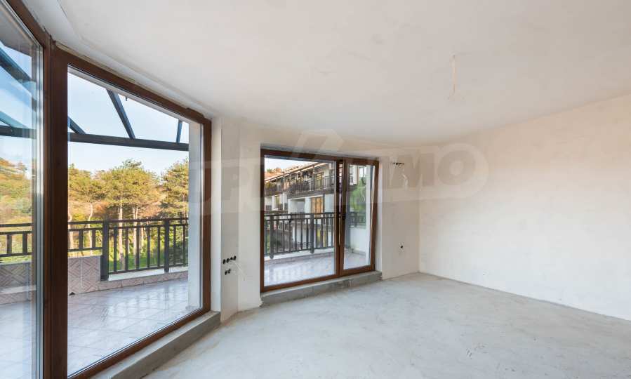 Недвижимость расположена на 3 этаже и состоит из коридора, гостиной с кухней, 2 спален, совмещенного санузла, большой панорамной террасы 35,96 кв. метров., с видом на бассейн, сосновый лес и море.