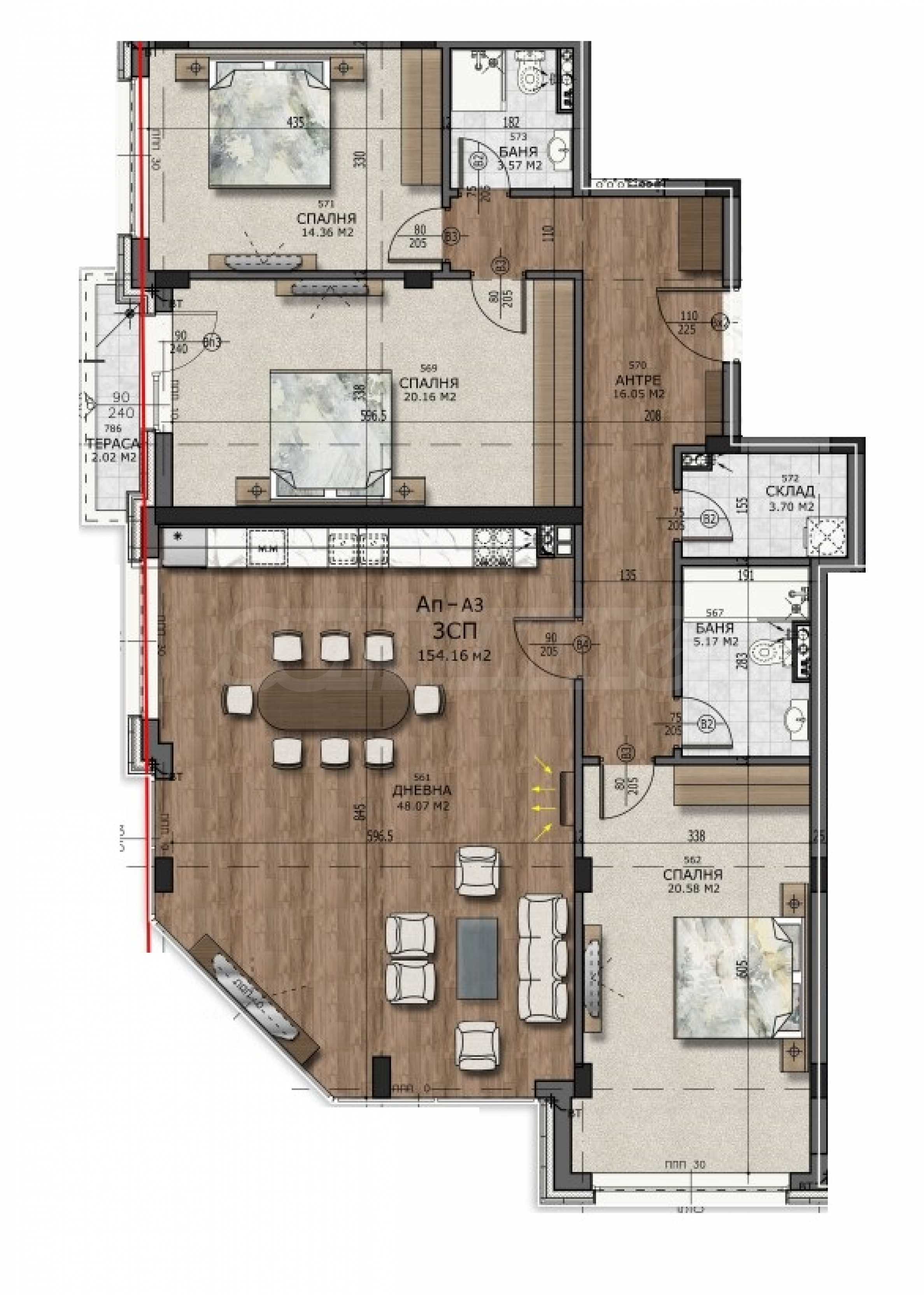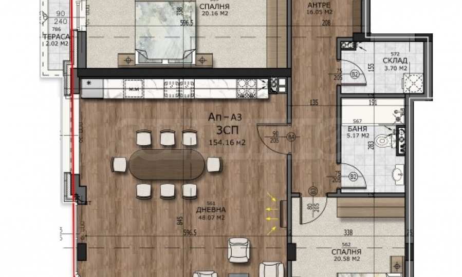 Квартира расположена на 4 этаже и предлагает площадь 183,16 квадратных метров, функционально разделенную на прихожую, просторную гостиную с кухней, три спальни, две ванные комнаты с туалетом, кладовую и террасу. Предлагается с качественной отделкой в соответствии с Болгарским Госстандартом.