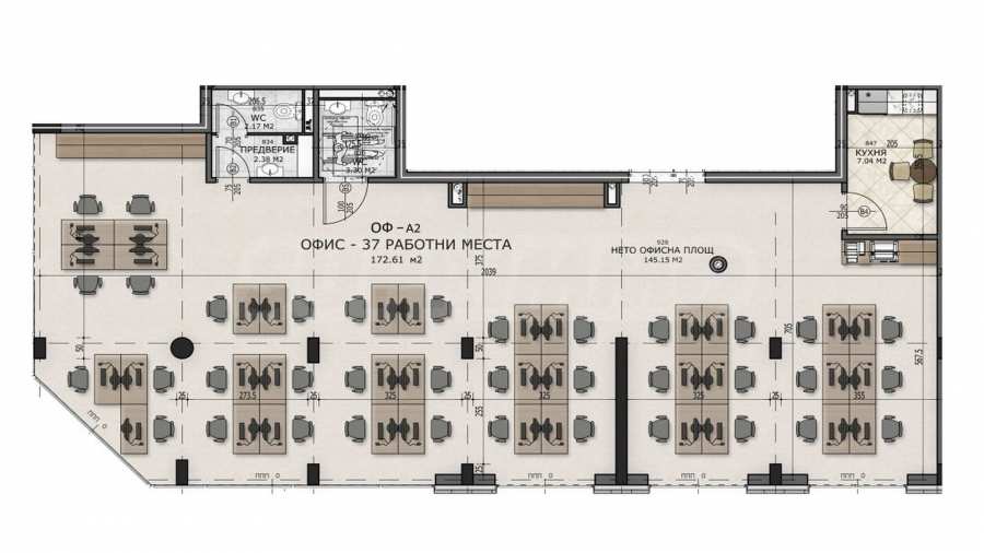 Недвижимость расположена на 2 этаже и предлагает много места и света. Благодаря своей площади 210,47 квадратных метров офис функционален и может разделять разные зоны в соответствии с потребностями вашего успешного бизнеса. Состоит из основного зала и соответствующих ему вспомогательных и служебных помещений – кухонной зоны и двух санузлов.
