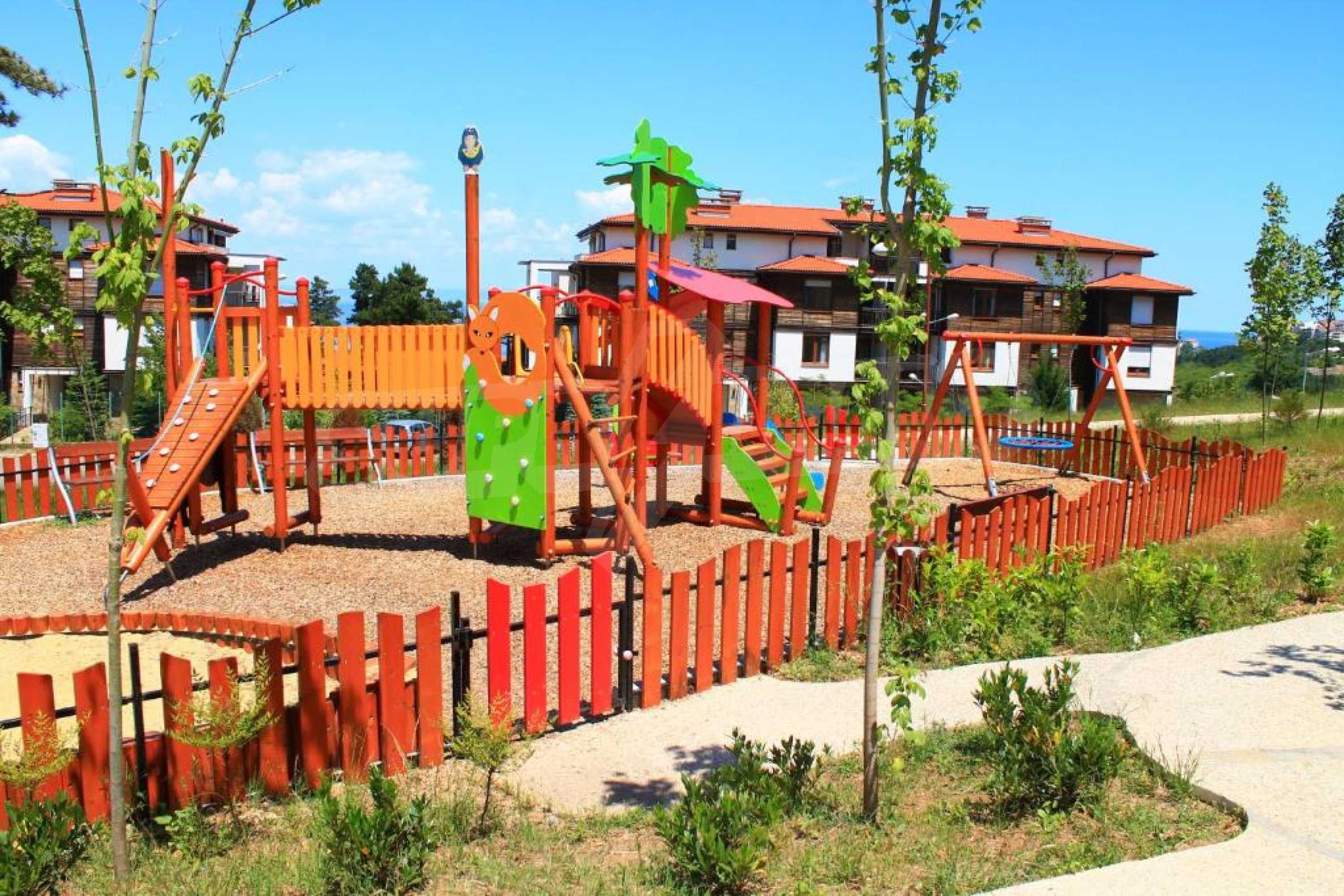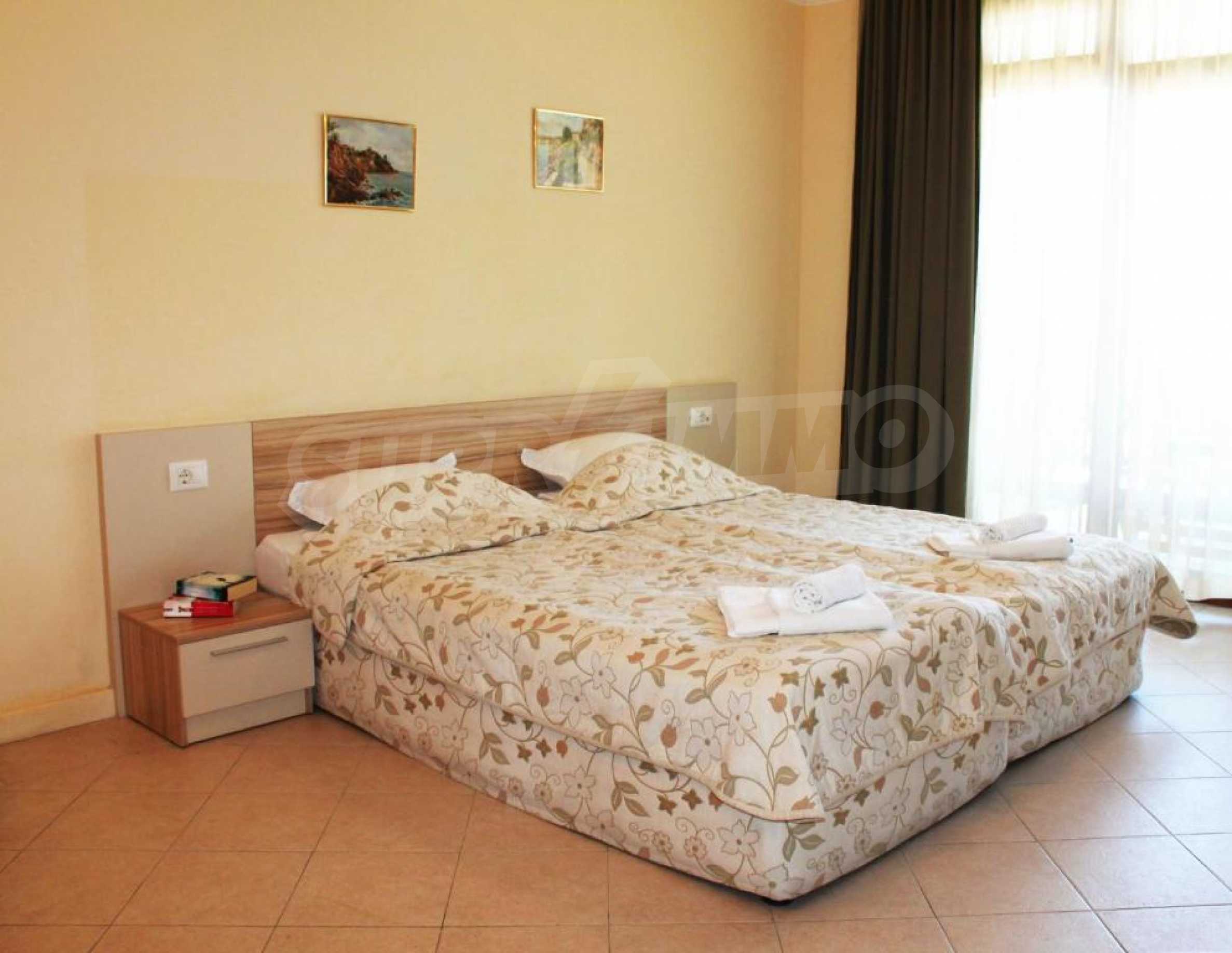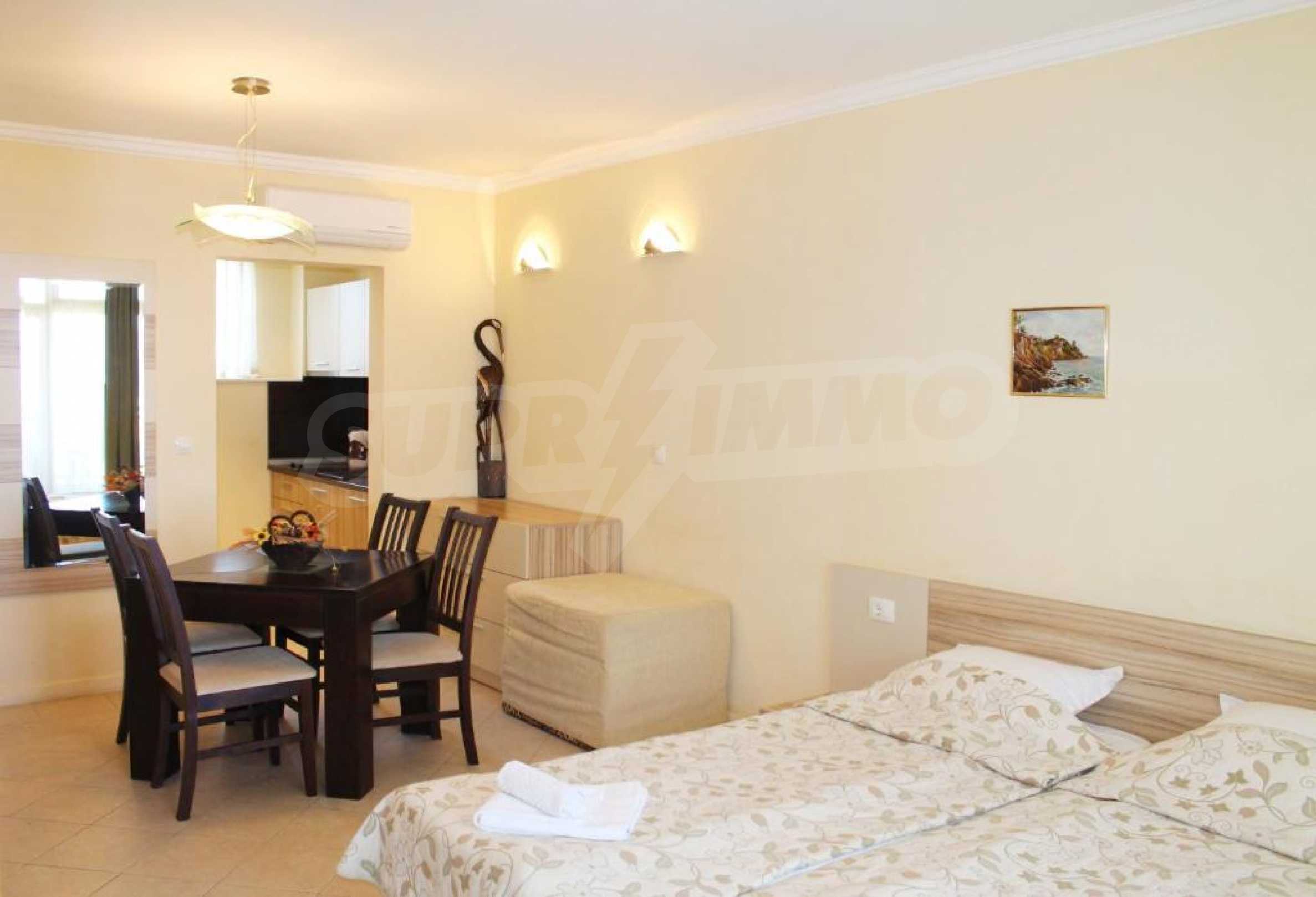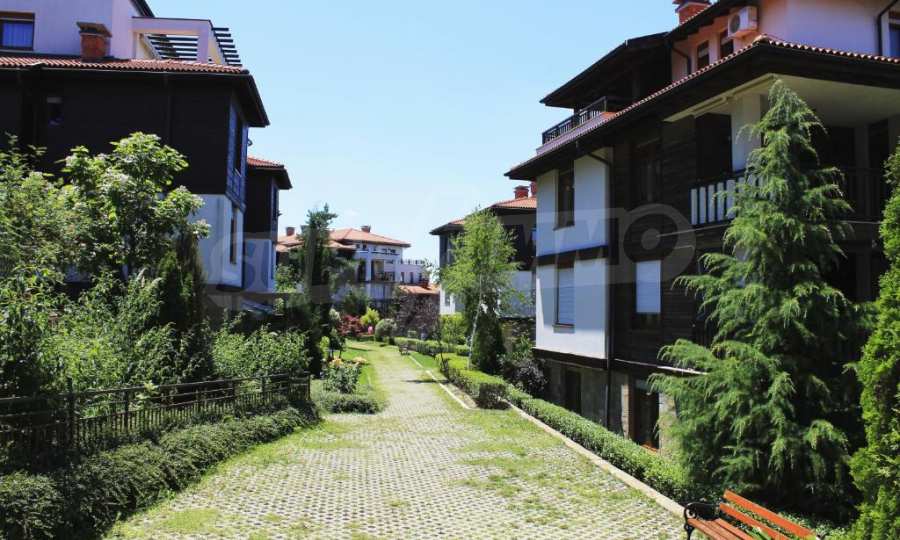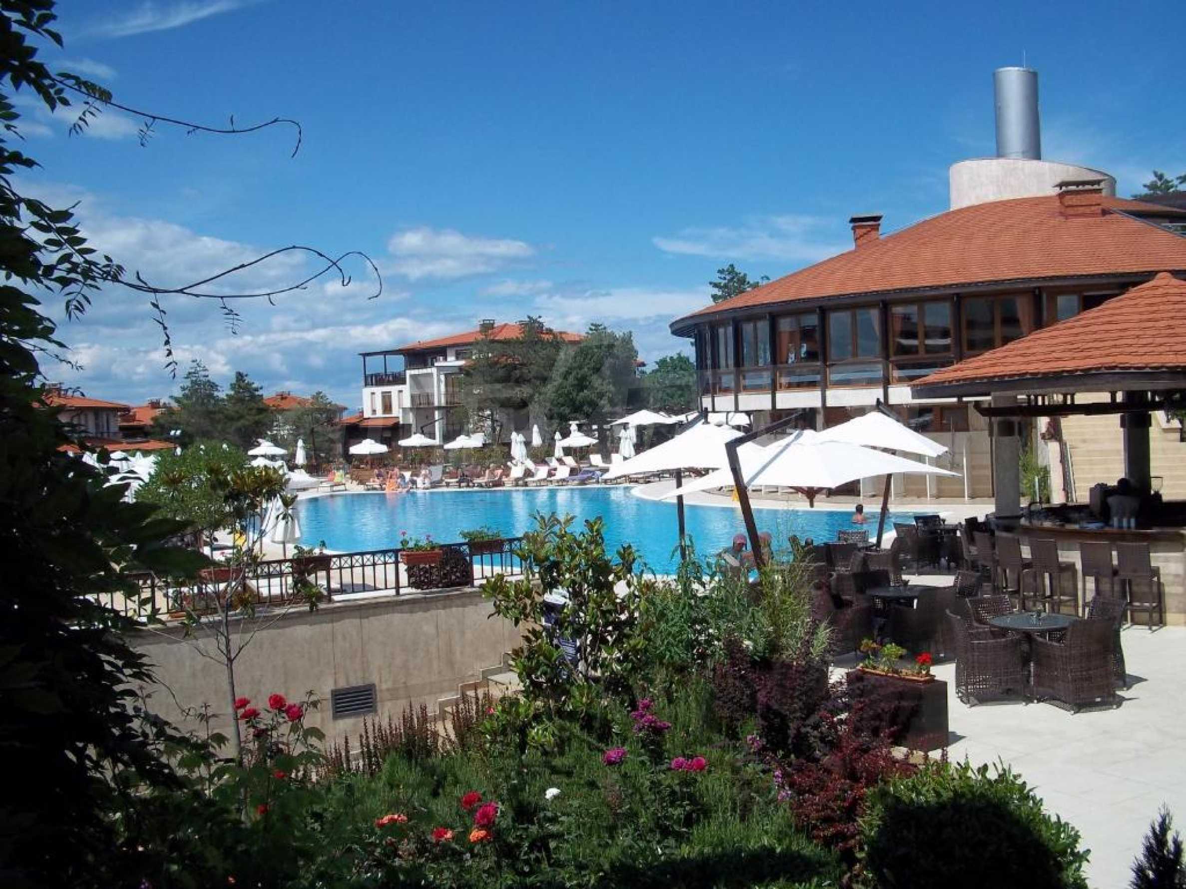 Предлагаем в аренду комфортабельную студию с кухней и террасой в популярном дачном поселке с первоклассными удобствами и бассейнами, расположенном в зеленом парке и красивом саду недалеко от города Созополь.