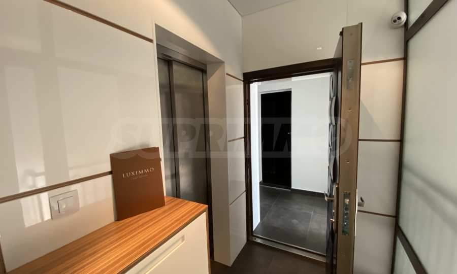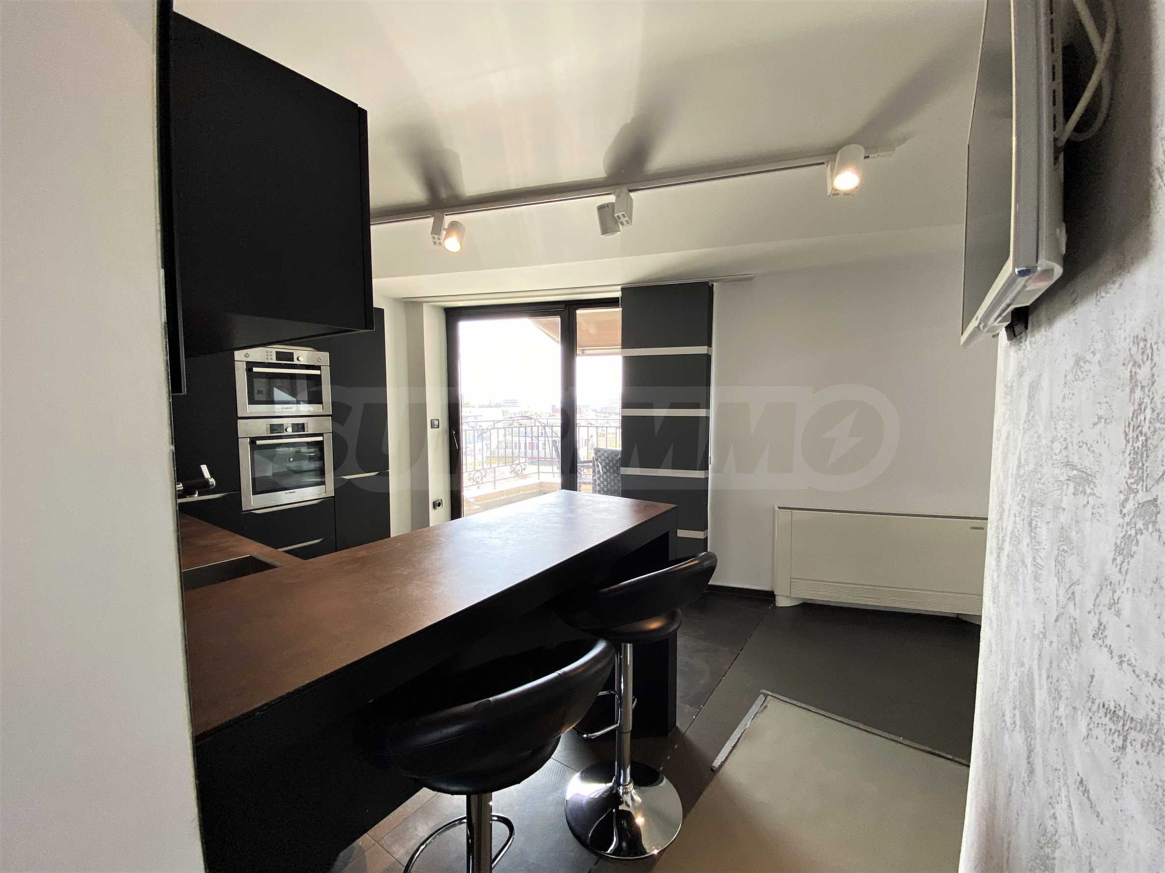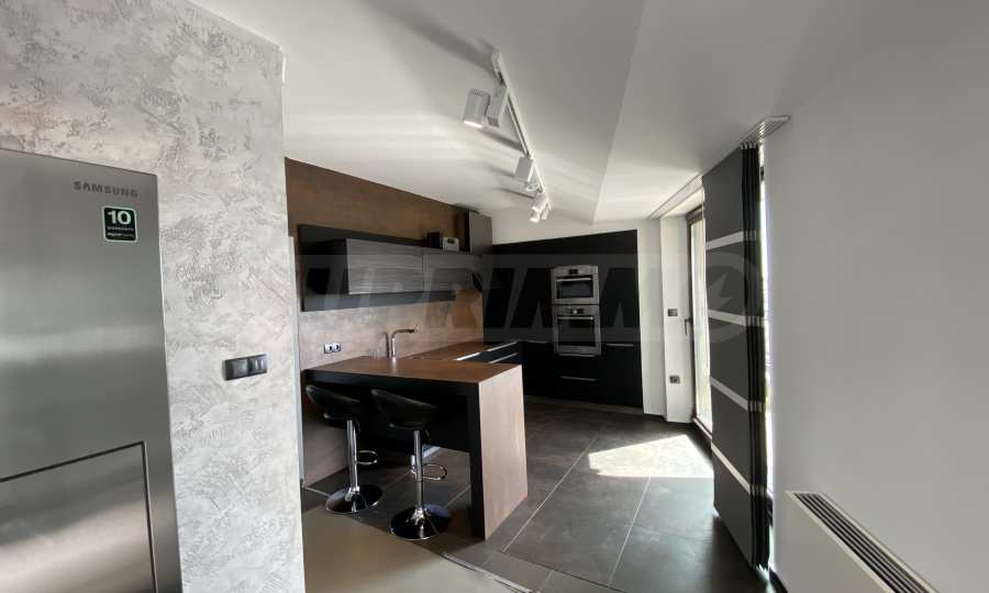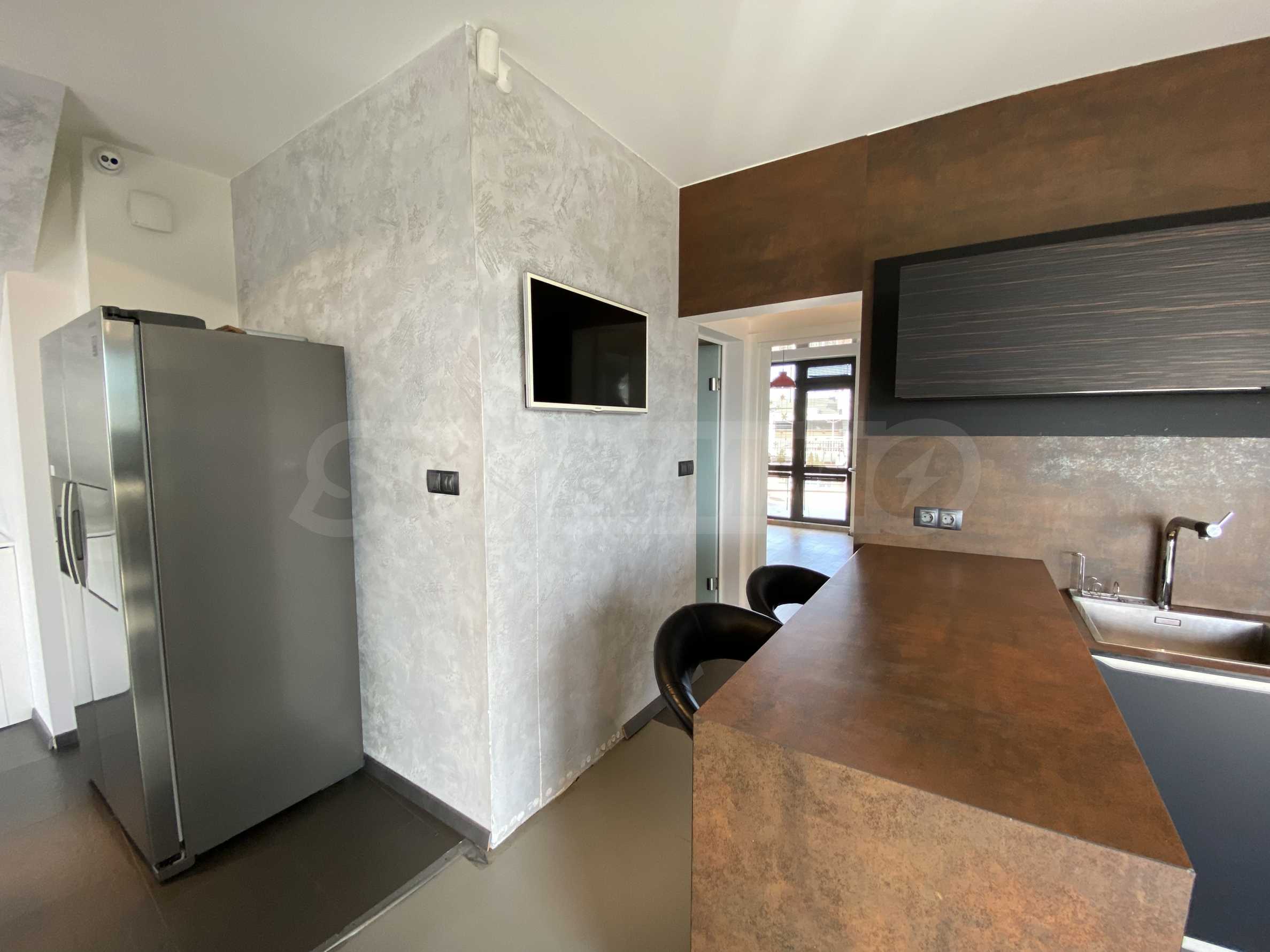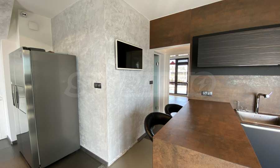 Квартира меблирована и оборудована высококачественной чёрно-белой техникой, сигнализацией, видеонаблюдением, аудиосистемой и другими современными удобствами. Квартира предлагается с полной меблировкой и оборудованием, включая дизайнерскую кухню SYKORA (Чехия), меблировку производства MORATO MEBEL. Отделочные работы в квартире дополняют современный интерьер, выполненный в серо-бело-коричневых тонах с использованием отборных материалов, таких как японский облицовочный камень.