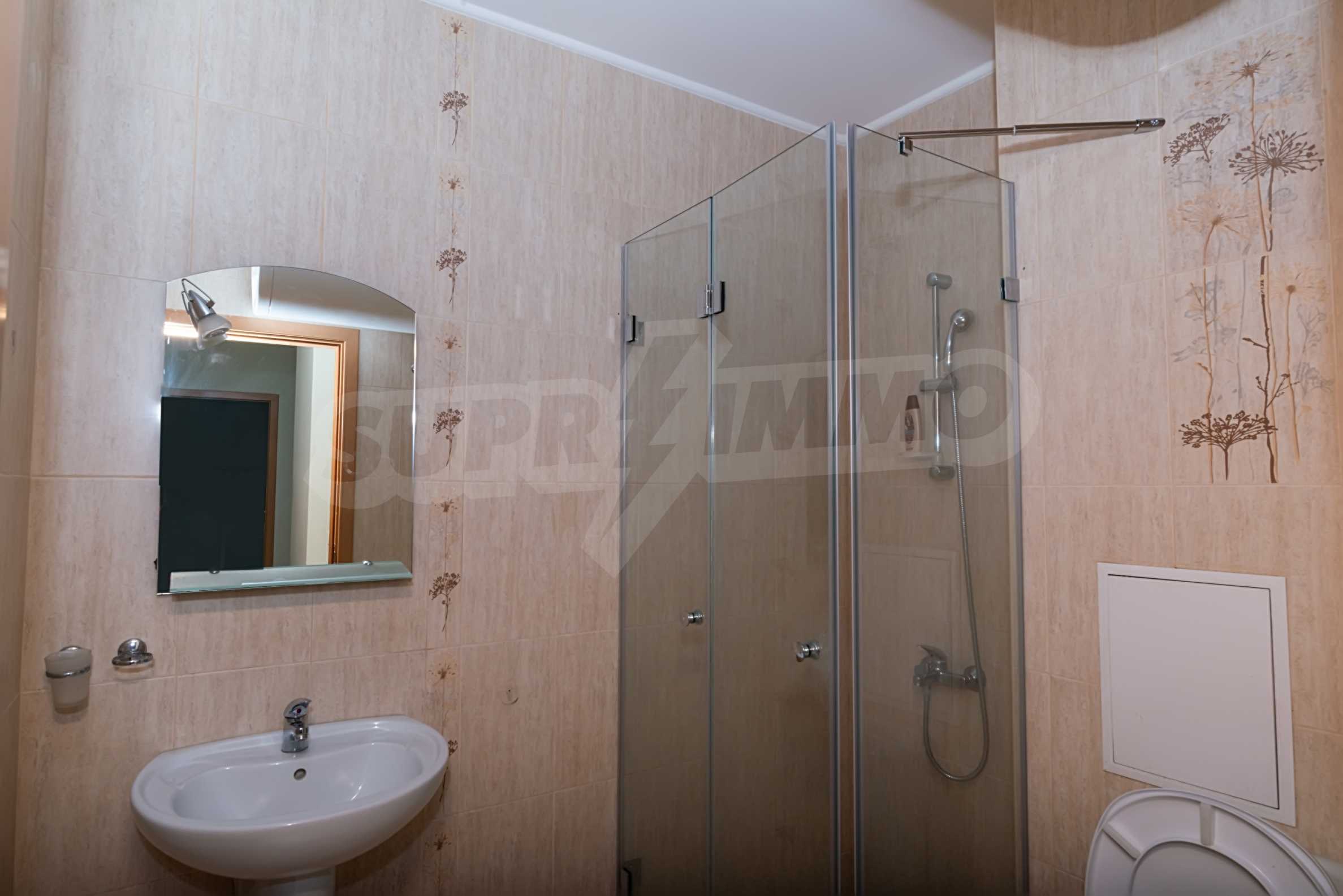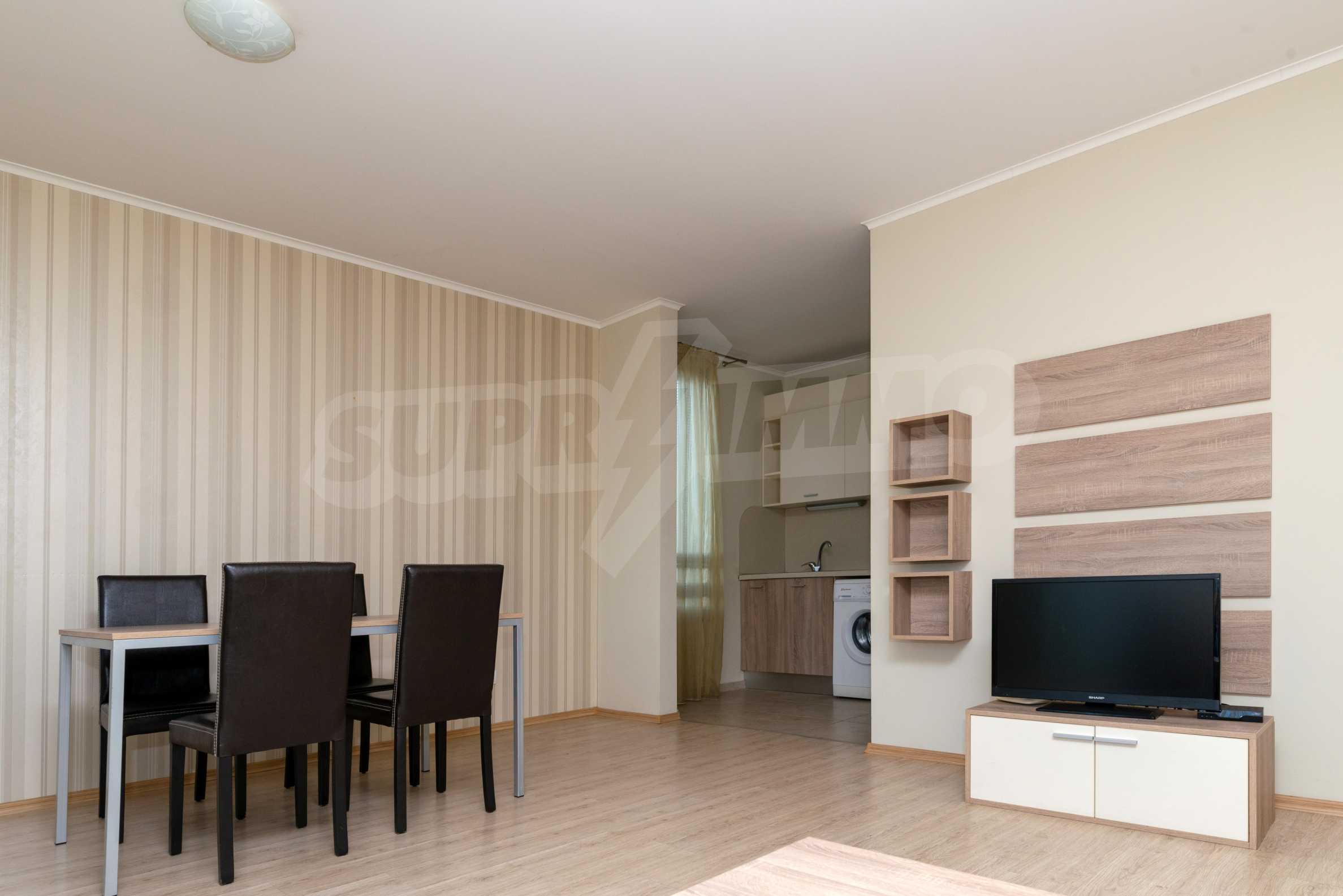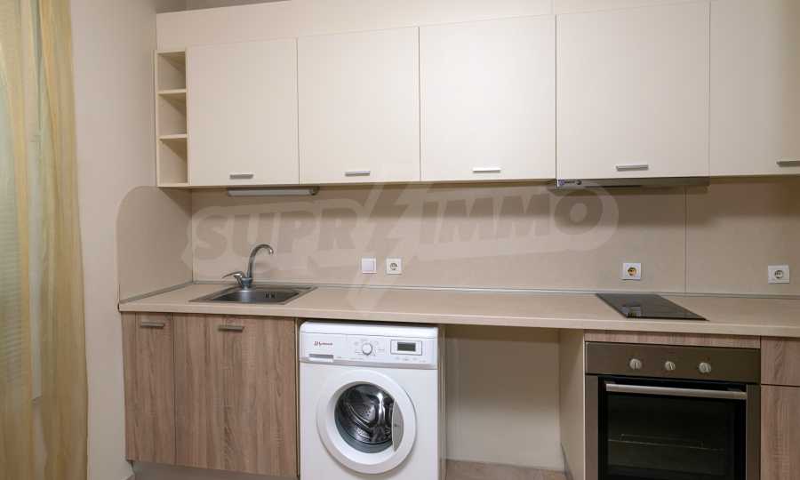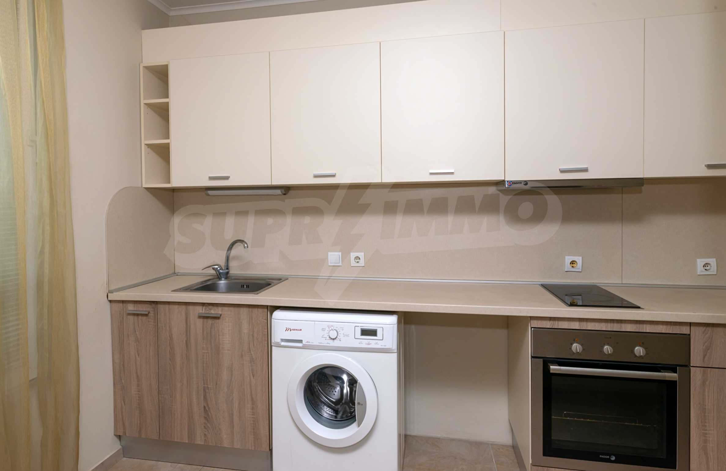 В гостиной две зоны отдыха. Низкая меблировку - угловой диван с низким столиком и тумбой с телевизором и высокий обеденный стол с четырьмя стульями. Кухня удобная и полностью оборудована холодильником, стиральной машиной, плитой и духовкой. В спальне есть большой гардероб, а в ванной комнате есть отдельная часть для душевой кабины.