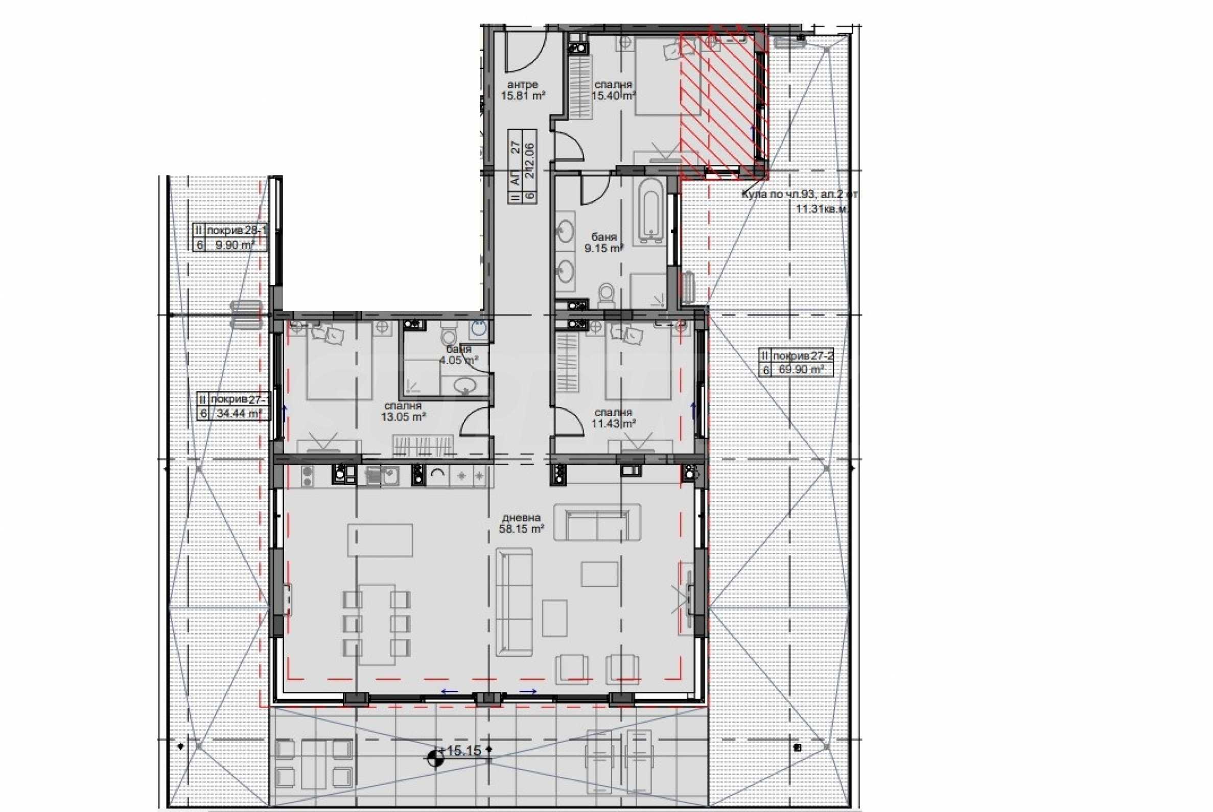 Квартира расположена на 5-м этаже и имеет общую площадь 212,06 кв. м. Она состоит из прихожей, гостиной, террасы, трех спален и ванной комнаты с туалетом. Квартира также имеет две террасы на крыше общей площадью 104,34 кв. м.