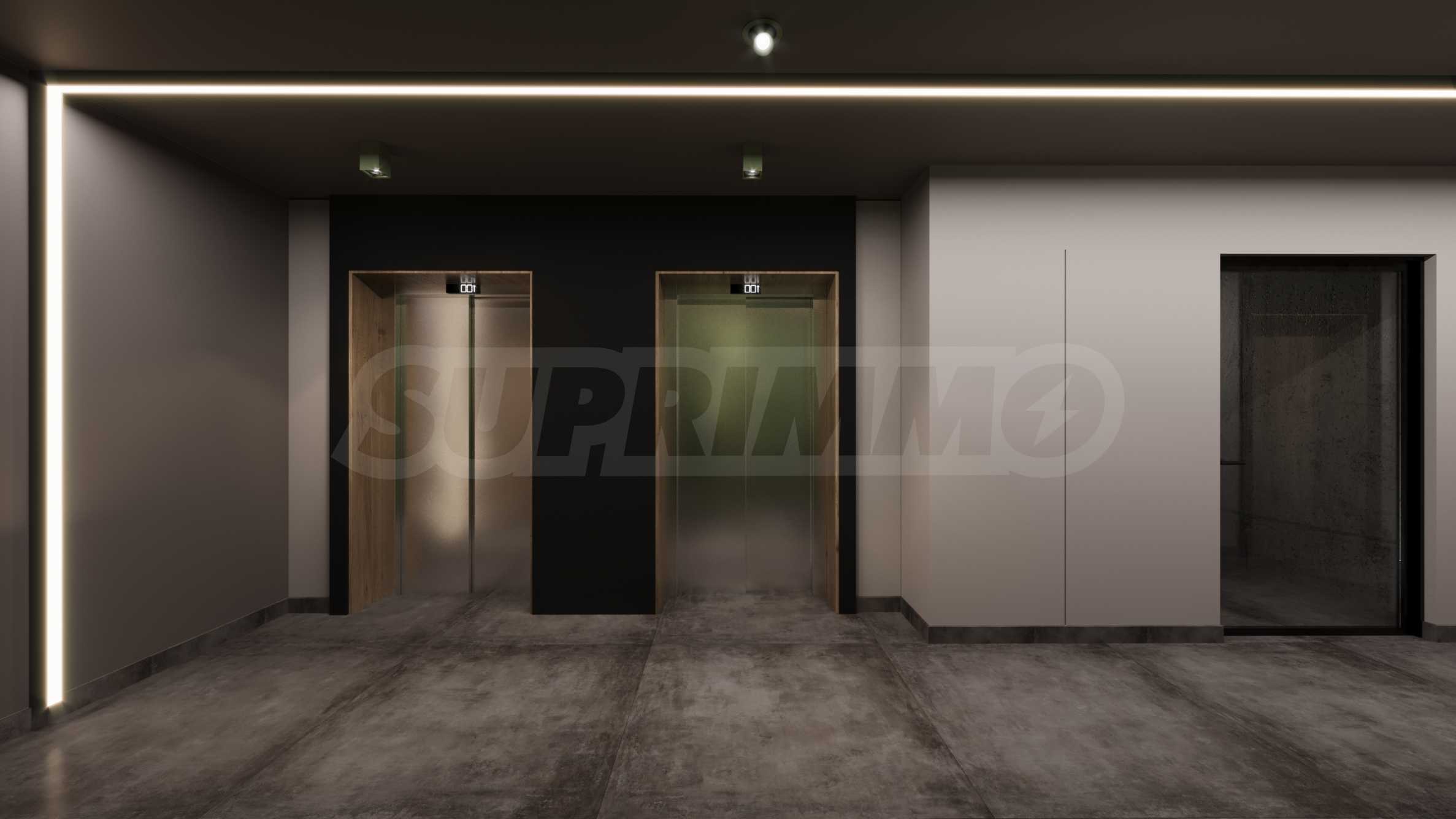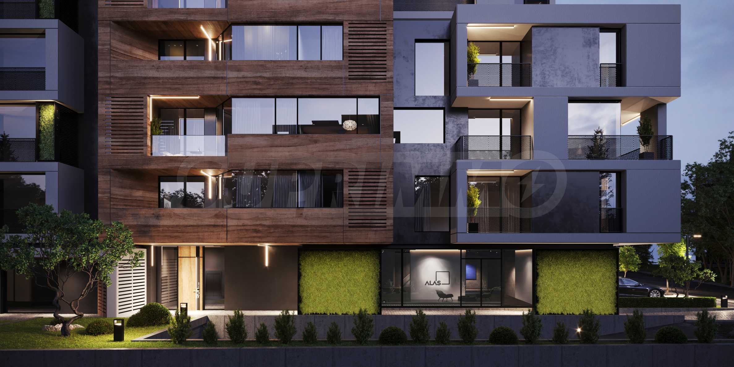 Понятие динамики в городской среде ищется в объемно-пространственном и фасадном плане. Проект представляет собой композицию 9-, 8-, 6- и 4-этажных объемов в общей ступенчатой структуре, спускающейся на восток в сторону будущего парка «Лозенец». Дополнительными акцентами в композиции являются объемы пентхаусов в виде своеобразных коробок, заполненных HPL-панелями ореха FUNDERMAX, в которых размещены роскошные апартаменты с большей светлой высотой этажа (3,30 м).