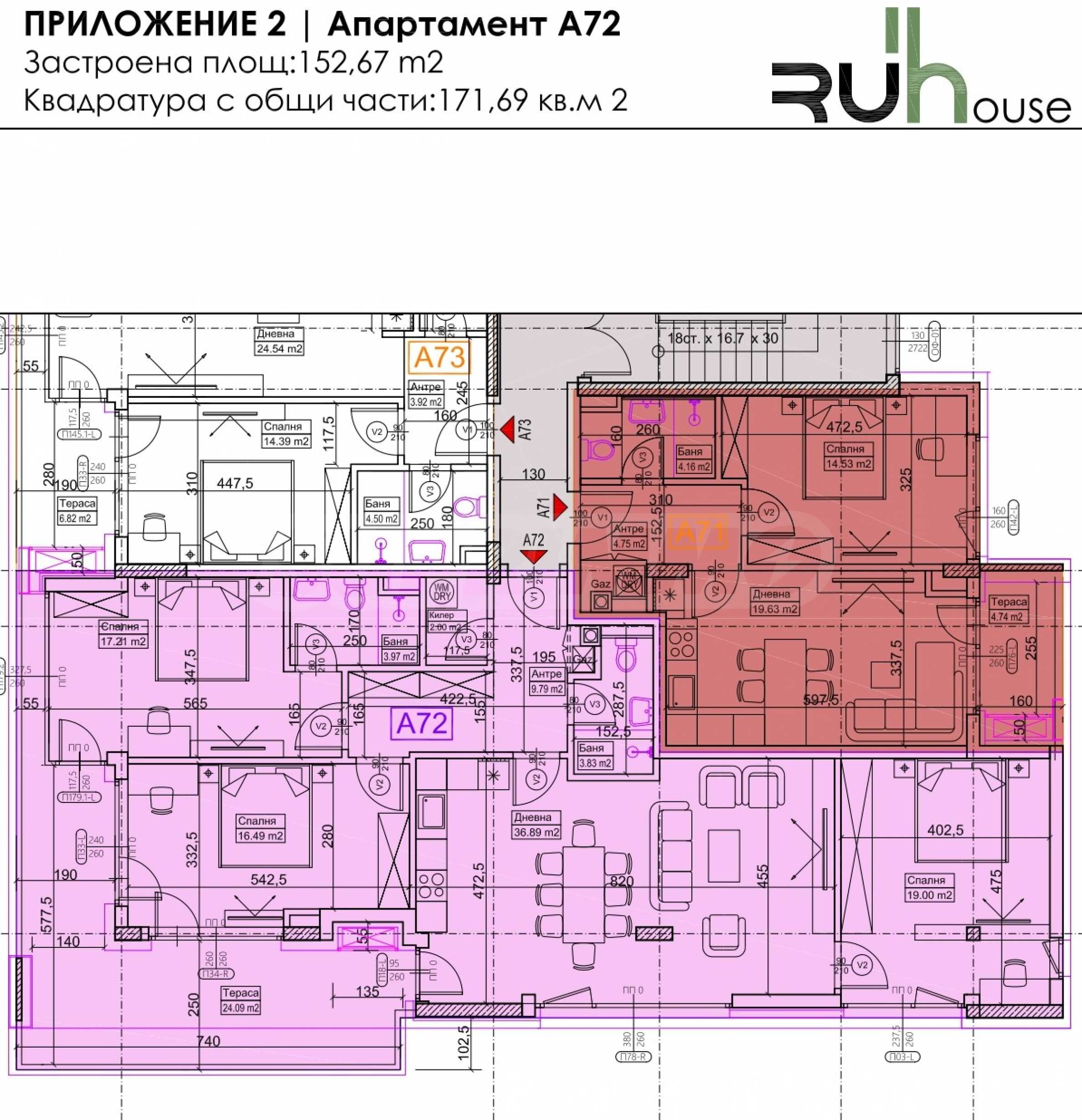 На чистой площади 152,67 кв. м расположены удобная прихожая, кладовая/мокрое помещение, 2 ванные комнаты с туалетами, 3 спальни, гостиная с кухней и столовой, большая панорамная терраса с видом на гору Витоша и населенный пункт. В одной спальне есть собственная ванная комната. Из гостиной и двух спален есть выход на террасу.