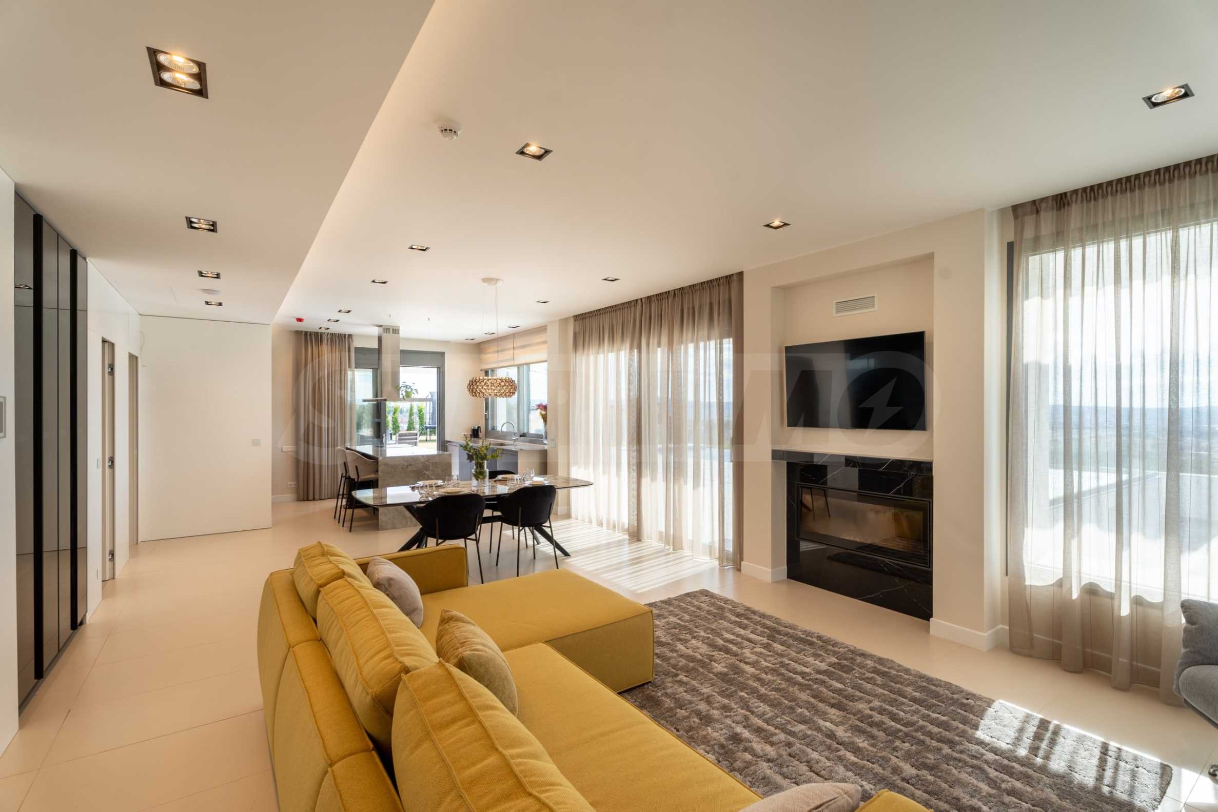 На первом этаже площадью 100м2 расположены гостиная, столовая и кухонная зона. Функциональная и эргономичная кухня оснащена техникой и фурнитурой известных брендов. Дизайнерская меблировку приносит эстетику и повышает комфорт. Эстетичность и теплоту интерьеру придает современный камин Piazetta: когда на улице становится холодно, здесь будет уютно и тепло! Все это образует пространство, где семья может комфортно проводить много времени. На первом этаже есть еще одна гостиная, которая может служить кабинетом или комнатой для гостей.