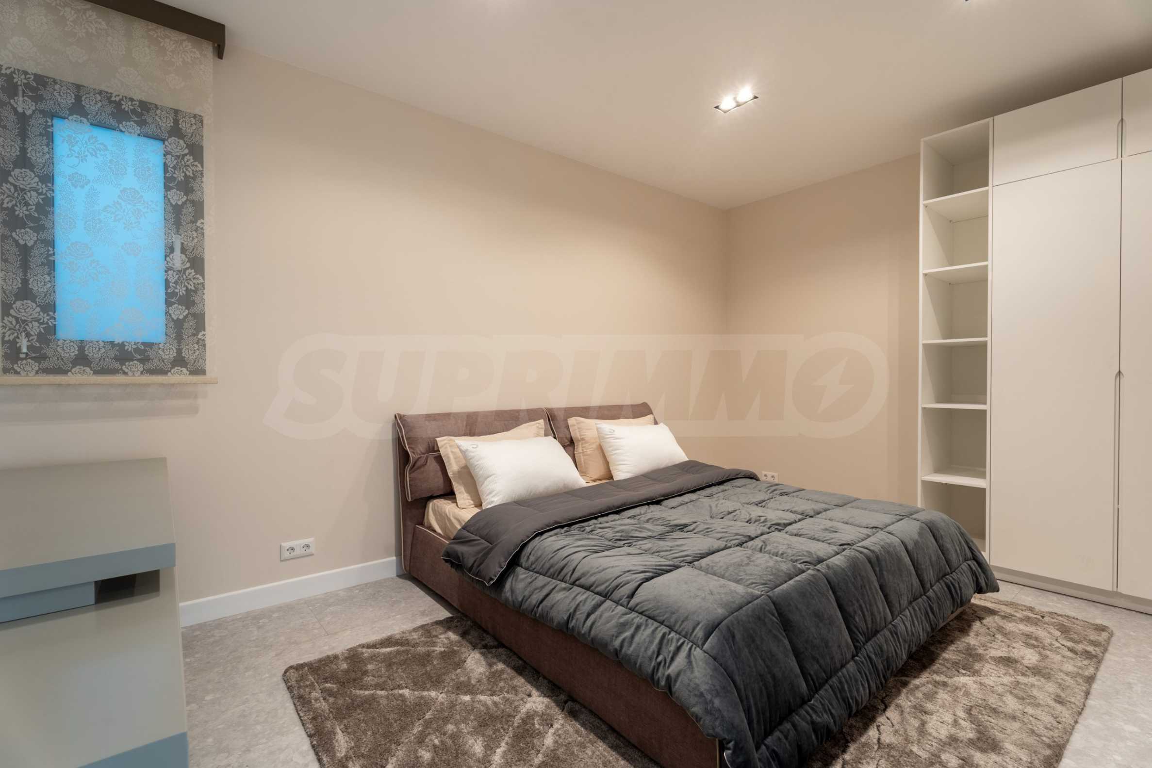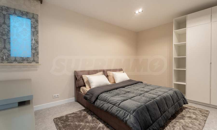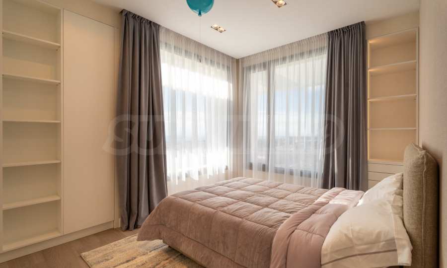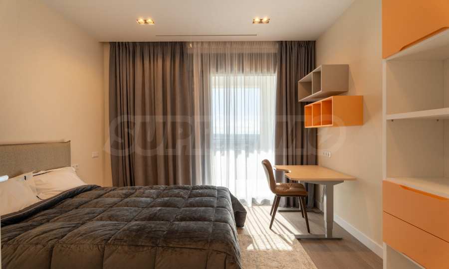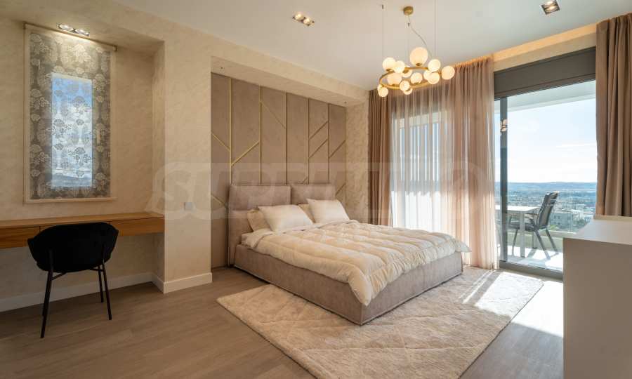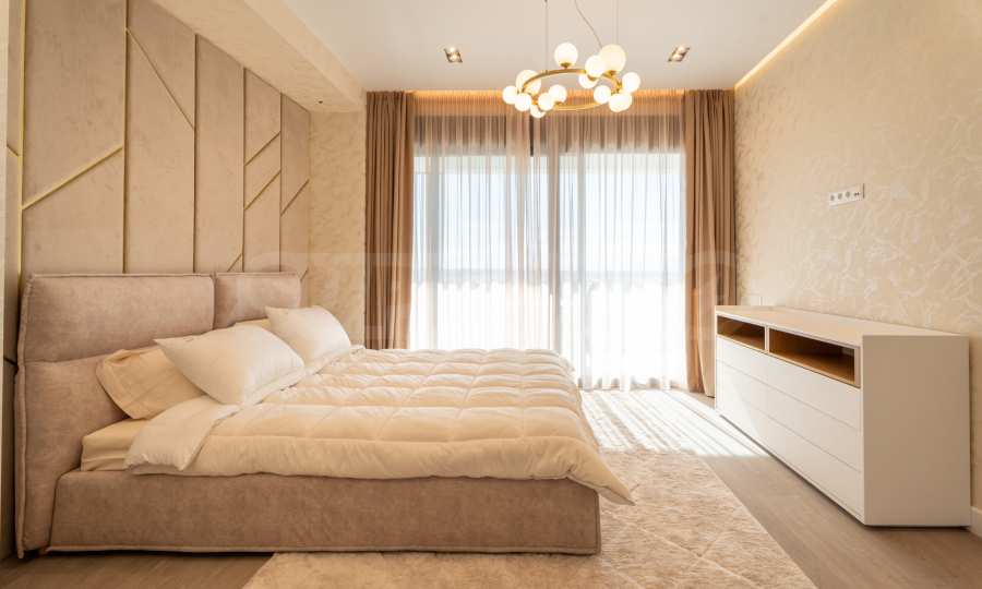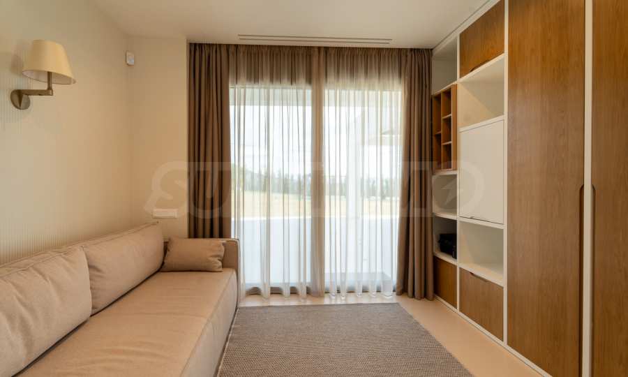 На втором этаже площадью 100 м2 расположены три спальни и две ванные комнаты. Главная спальня имеет выход в отдельную ванную комнату и большой гардероб. Также имеется терраса 16 кв. метров., которую можно использовать как дополнительное пространство для работы, отдыха или занятий спортом. Пол в спальнях покрыт дубовым паркетом. Во всех спальнях панорамные окна, из которых открывается невероятный вид на море.