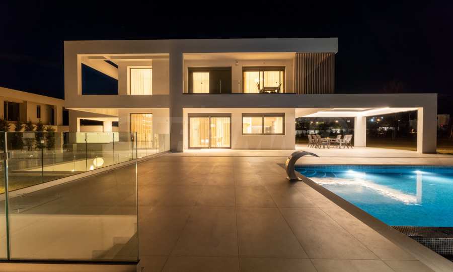 Вилла оборудована видеонаблюдением и охраной. Есть автоматические ворота и крытая парковка на две машины. Внешнее освещение создает комфорт и безопасность передвижения в темное время суток. Он также выгодно подчеркивает современный силуэт дома.