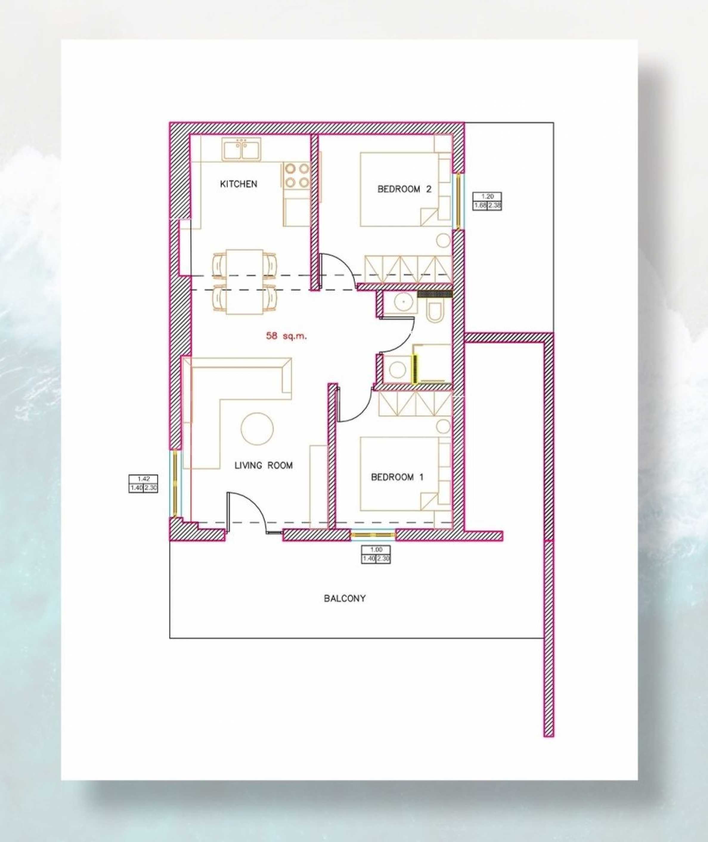 Квартира имеет чистую полезную площадь 58 кв. метров., с кладовой (9 кв. метров.), террасой площадью 17,2 кв. метров., закрытый двор, примыкающий к собственности с площадью 32,8 кв. метров., а также собственное парковочное место.