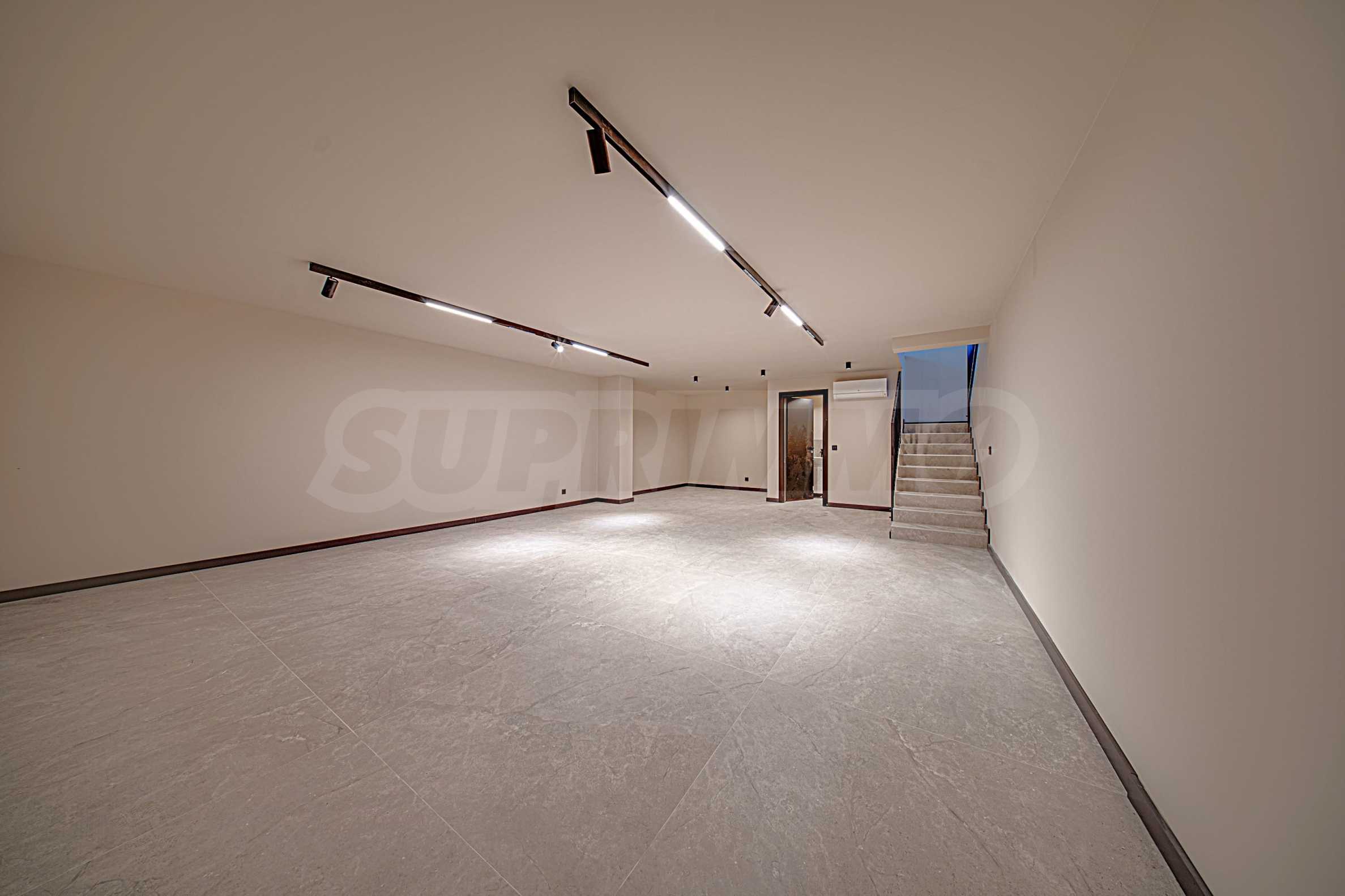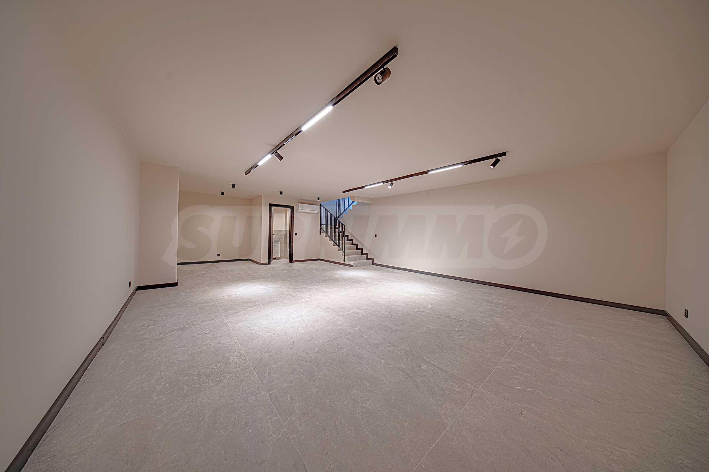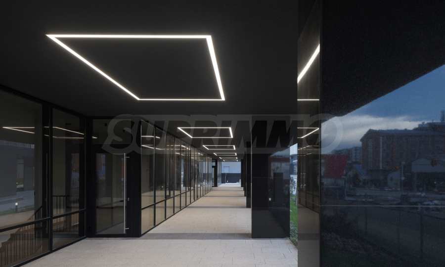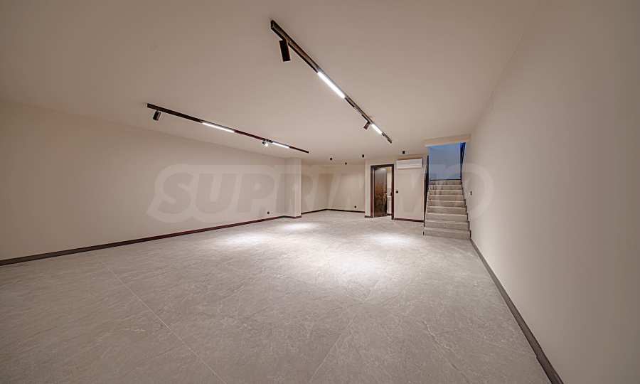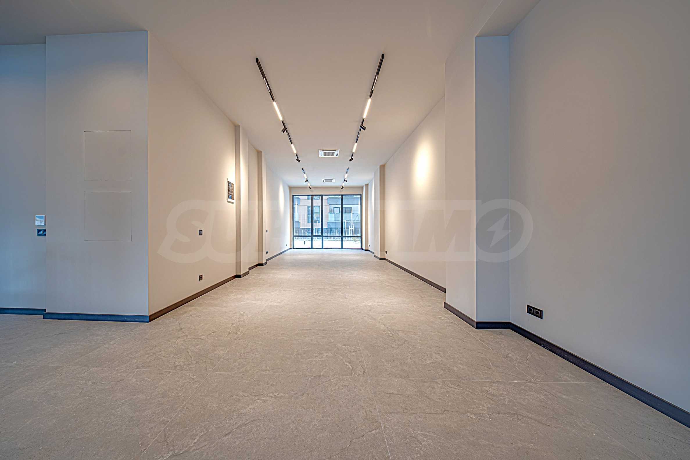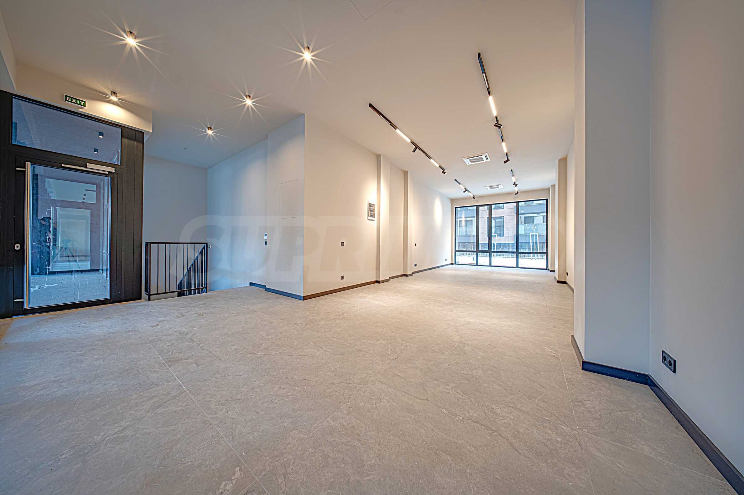 В коммерческой зоне здания расположено 5 торговых точек. Они расположены на двух уровнях (за исключением самой маленькой, которая расположена на одном уровне). Верхний уровень расположен на первом этаже здания (этаж «0»), а нижний – на первом подземном уровне здания (этаж «-1»). Два уровня соединены внутренней лестницей, индивидуальной для каждой торговой точки. Каждый из входов в торговые точки расположен непосредственно на первом этаже здания и имеет прямой доступ с улицы. Сама торговая зона отделена от входов в жилую и офисную части здания. Площадь доступных магазинов варьируется от 106,32 кв. м до 259,76 кв. м, включая помещения общего пользования. Основные и наиболее крупные витрины торговых точек расположены на первом этаже, обращены к западному фасаду здания, со стороны бульвара Симеоновско шоссе. Объекты также имеют небольшие витрины с другой, восточной стороны здания, так что обзор на них возможен с обоих длинных фасадов здания (восточного и западного).