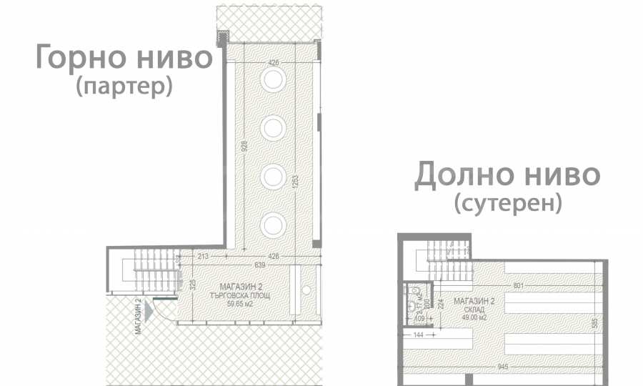 • По желанию покупателя/арендатора верхний уровень может быть использован как выставочная площадь, а нижний — как склад. Использование нижнего уровня в качестве выставочной площади также не ограничено, в соответствии с пожеланиями владельца/арендатора магазина;