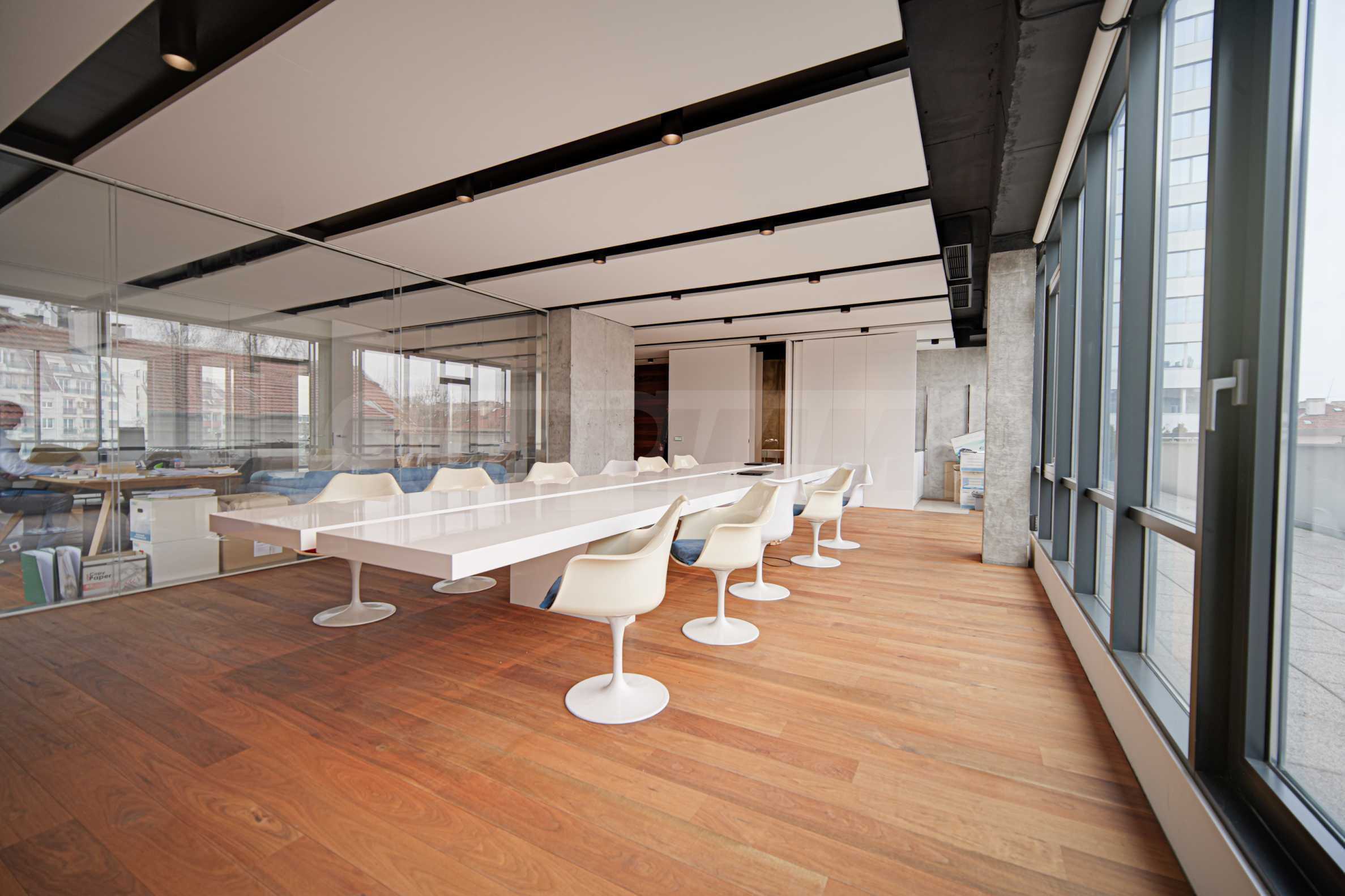 Имеет просторное открытое пространство, в котором есть возможность разместить ресепшн, рабочие места и зону отдыха. Здесь есть четыре отдельных кабинета и место для работы или переговорная комната с изготовленным на заказ рабочим столом со скрытой проводкой, что позволяет разместить 16 рабочих мест.