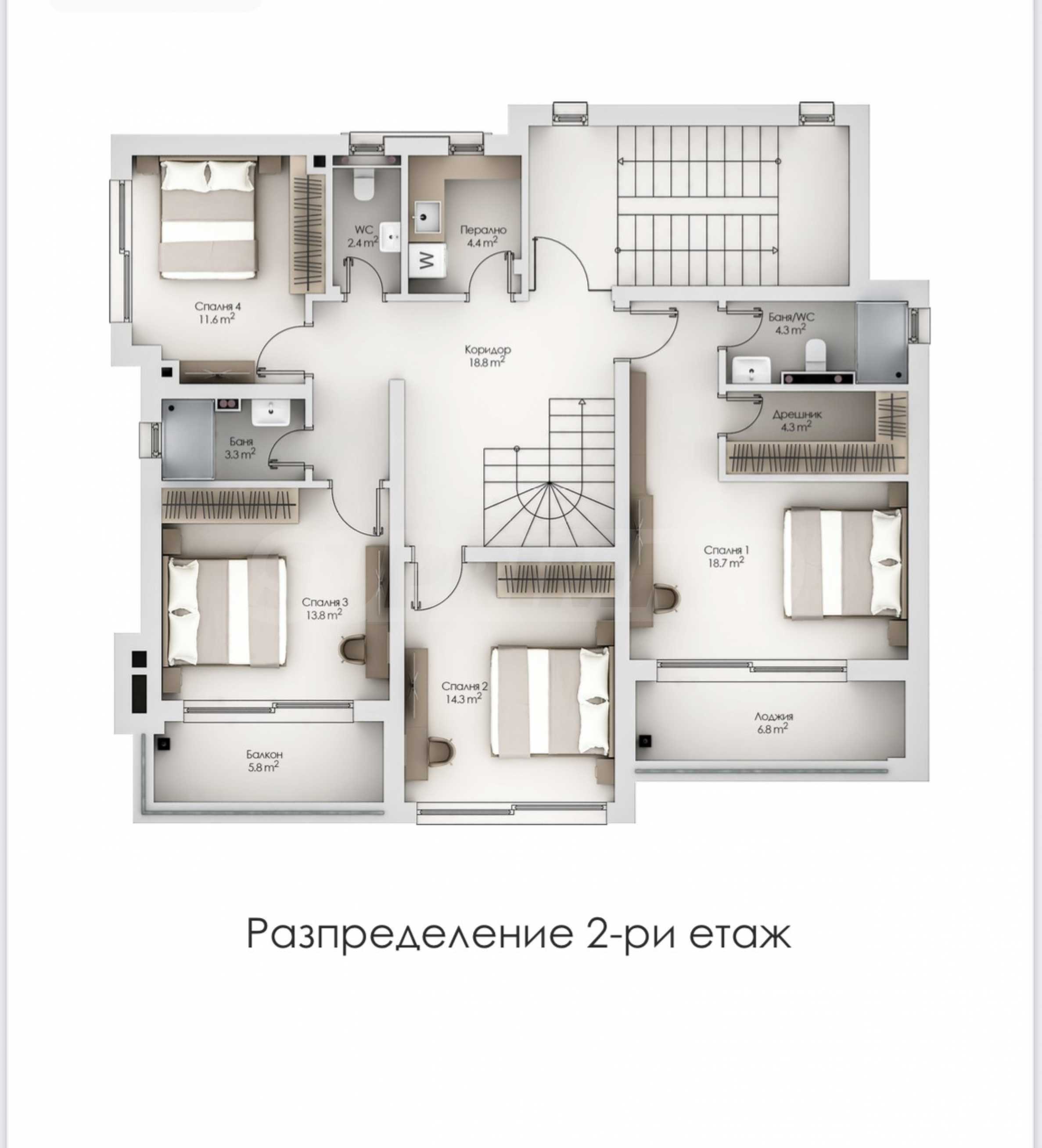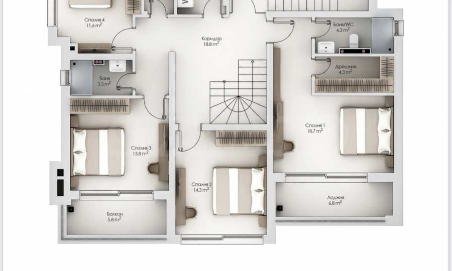 - 2 этаж - 4 спальни, гардеробная, 3 ванные комнаты, прачечная;