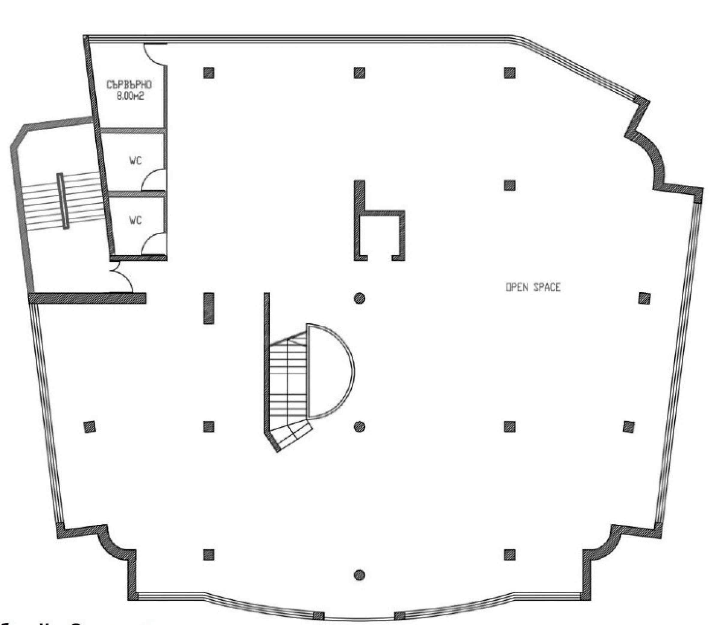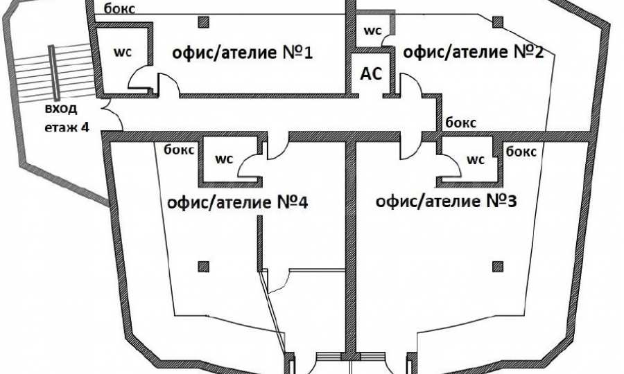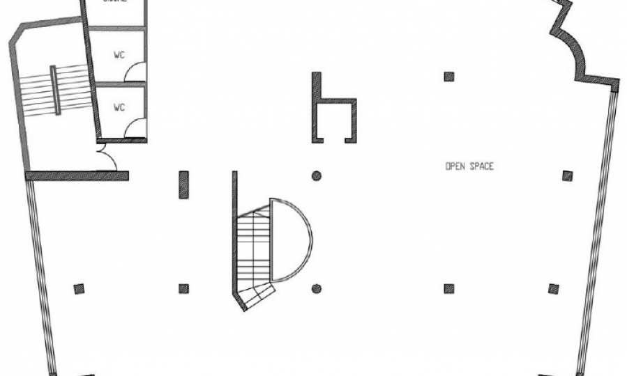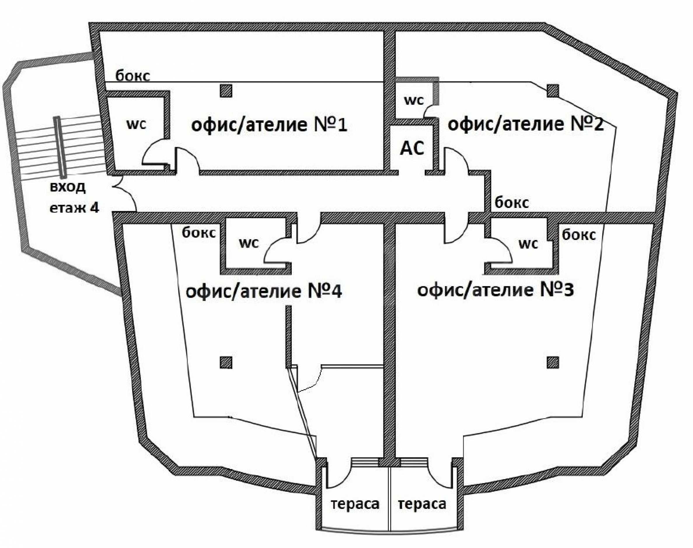 Большой, светлый и открытый офис площадью 576,31 м2., два санузла, серверная комната, лифт, две лестницы (внешняя и внутренняя).