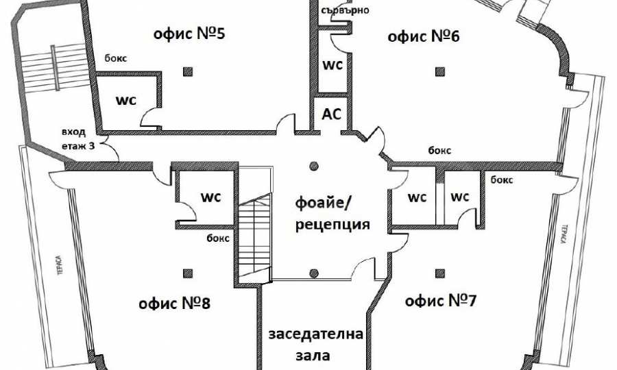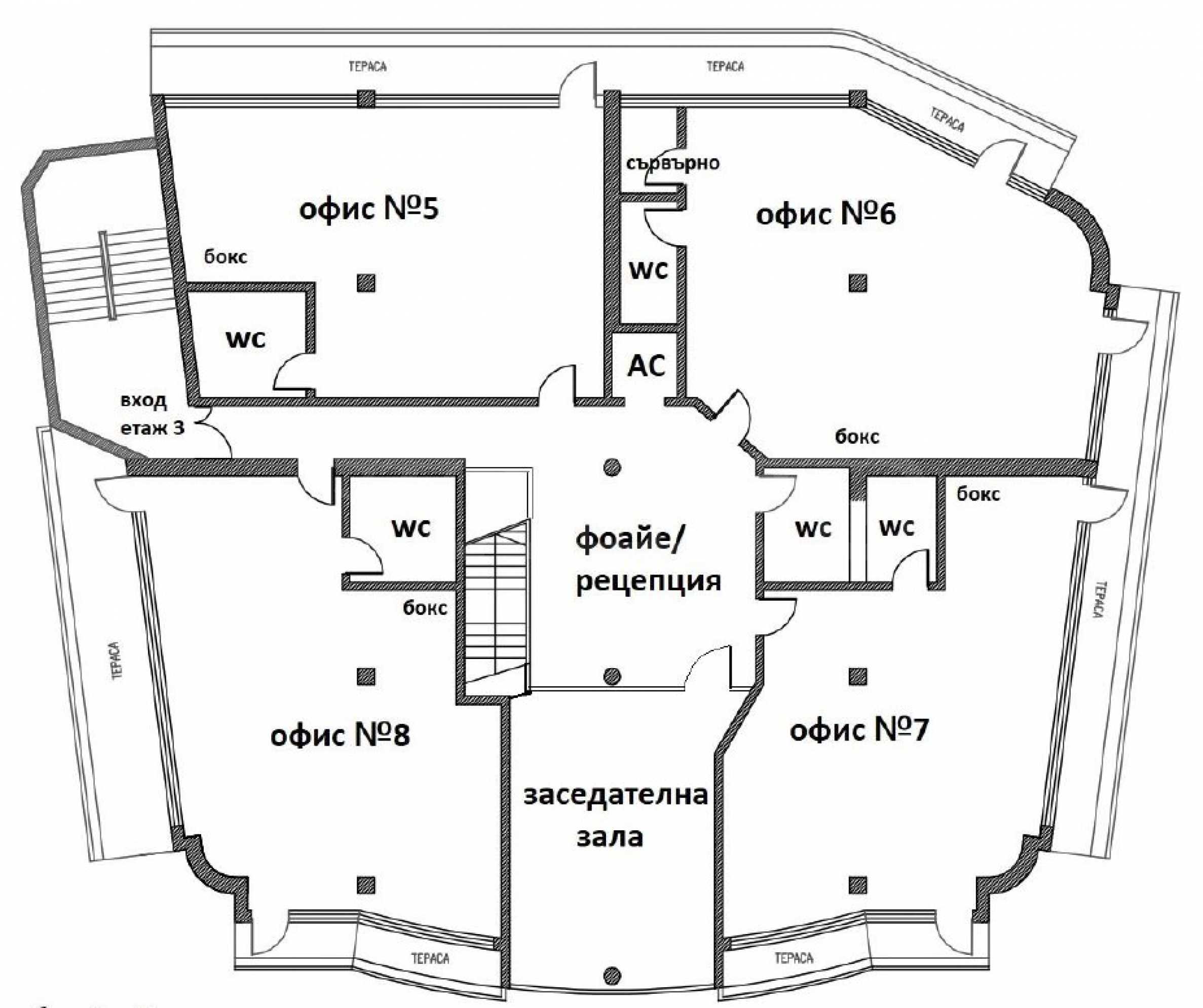 4 просторных офисных помещения площадью: 121,16 м2.; 144,50 квадратных метров; 131,84 квадратных метра; 133,99 м2., каждый со своим санузлом; конференц-зал площадью 36 м2., вестибюль/ресепшн.