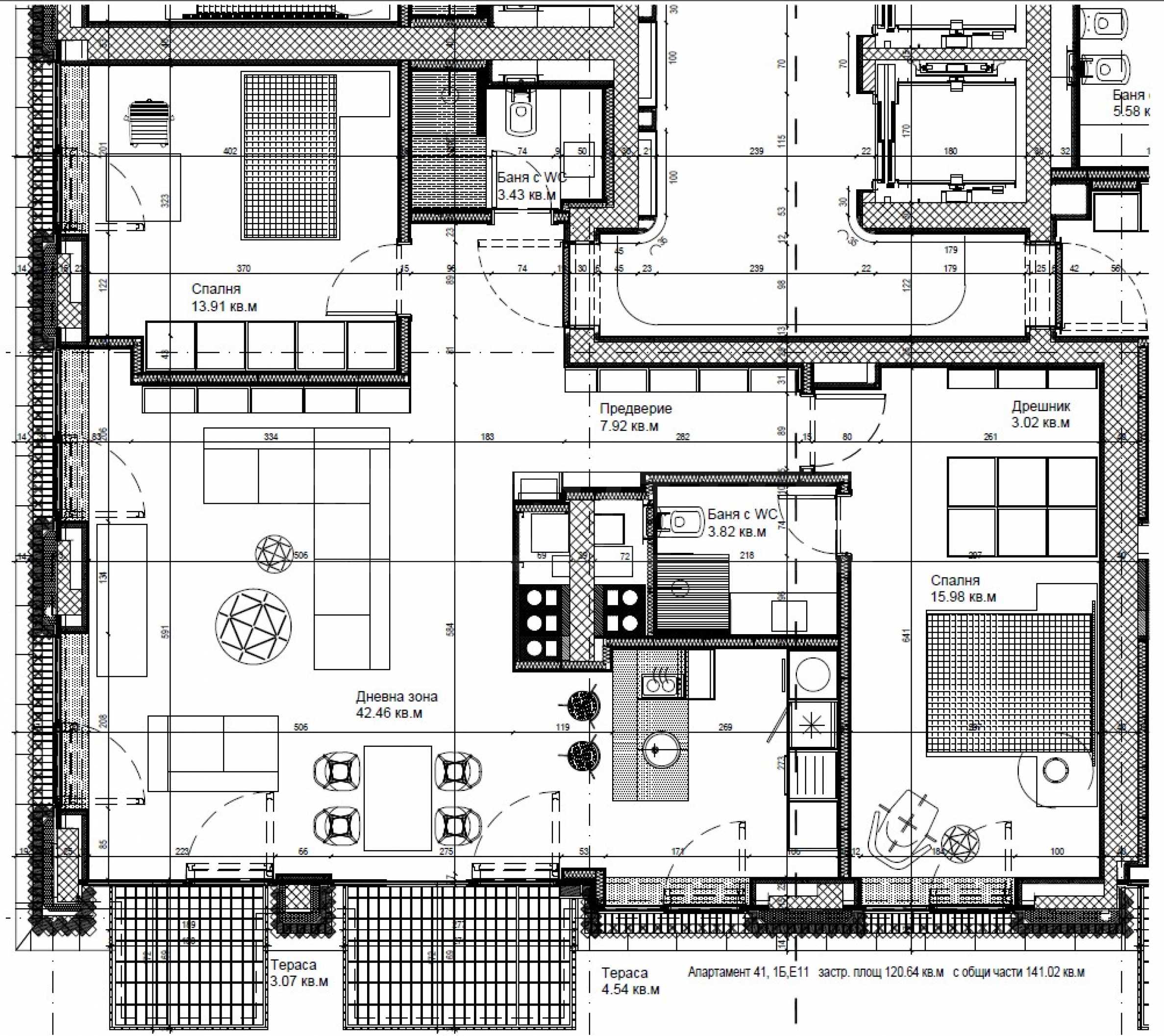Трехкомнатная квартира общей площадью 141,02 кв. метров, чистой площадью 120,64 кв. метров имеет следующую планировку: