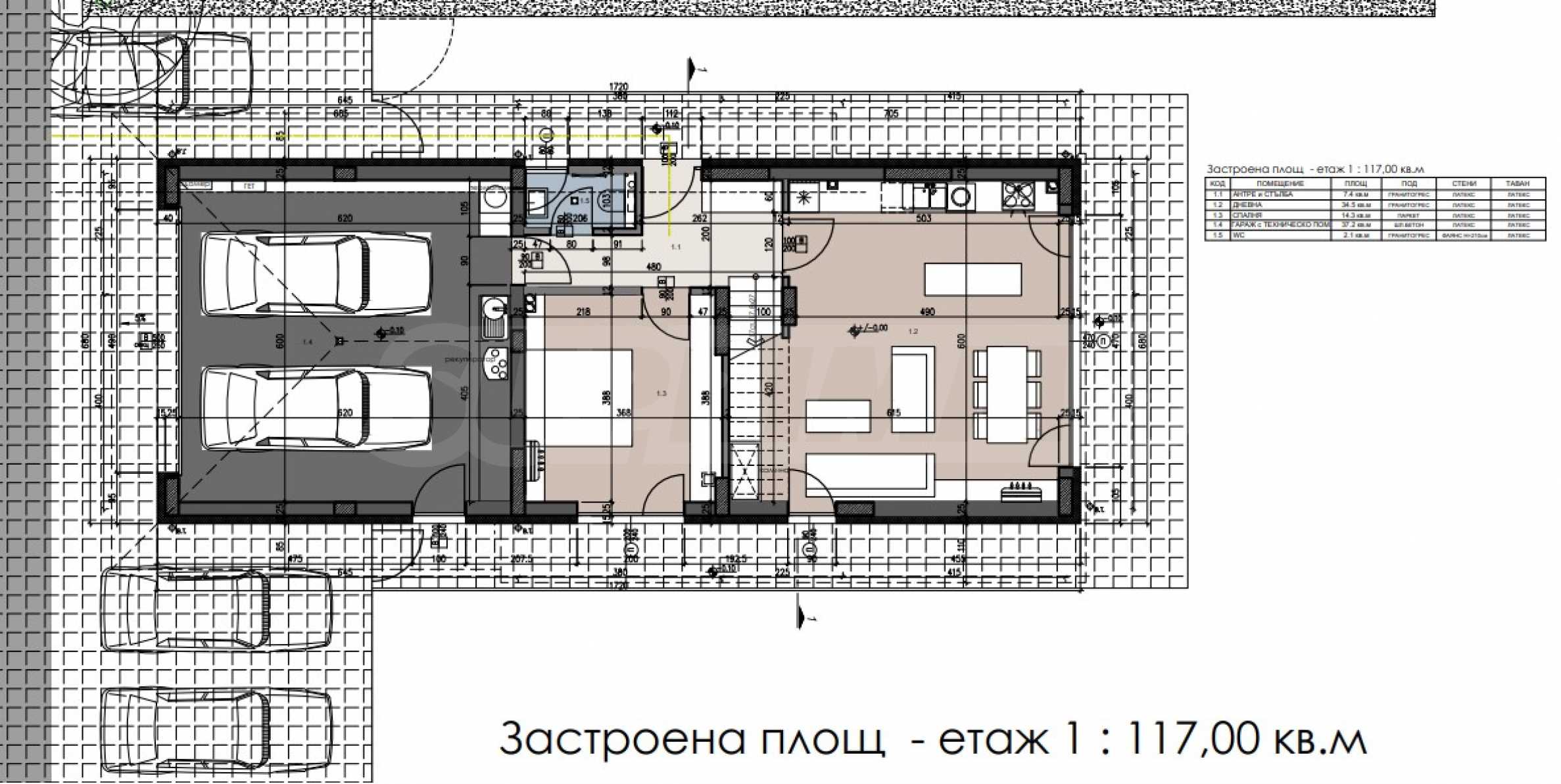 - первый этаж площадью 117 квадратных метров состоит из прихожей, гостиной, спальни, туалета, гаража с техническим помещением;