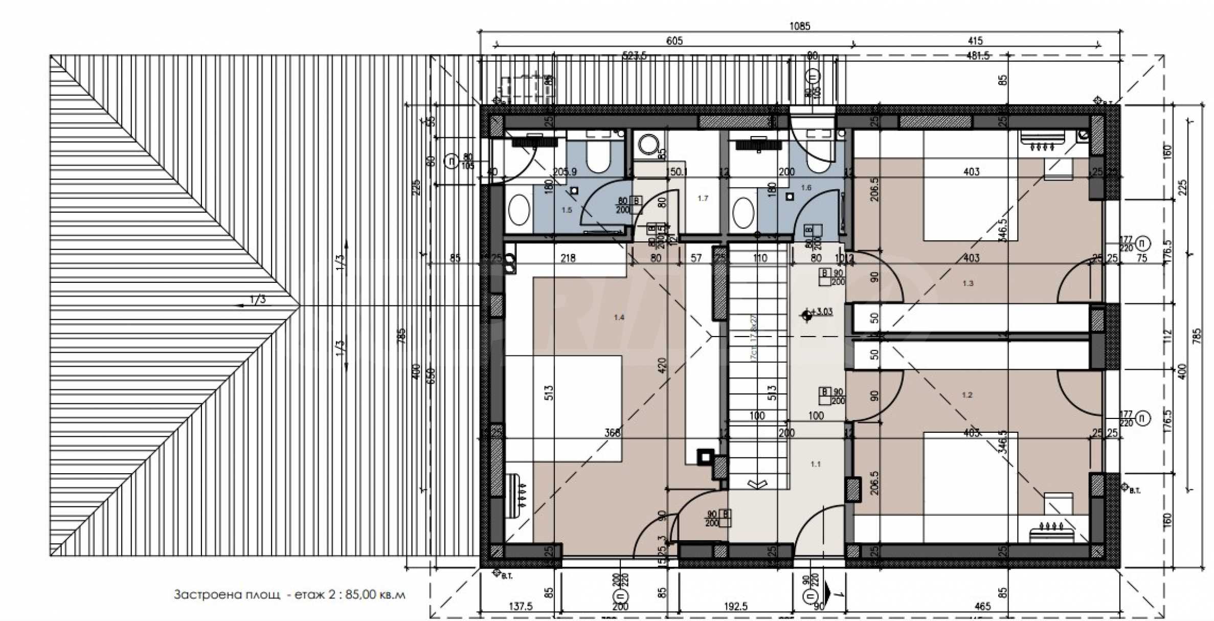 - Второй этаж площадью 85 квадратных метров имеет коридор, три спальни, две ванные комнаты с туалетом, кладовую и террасу.