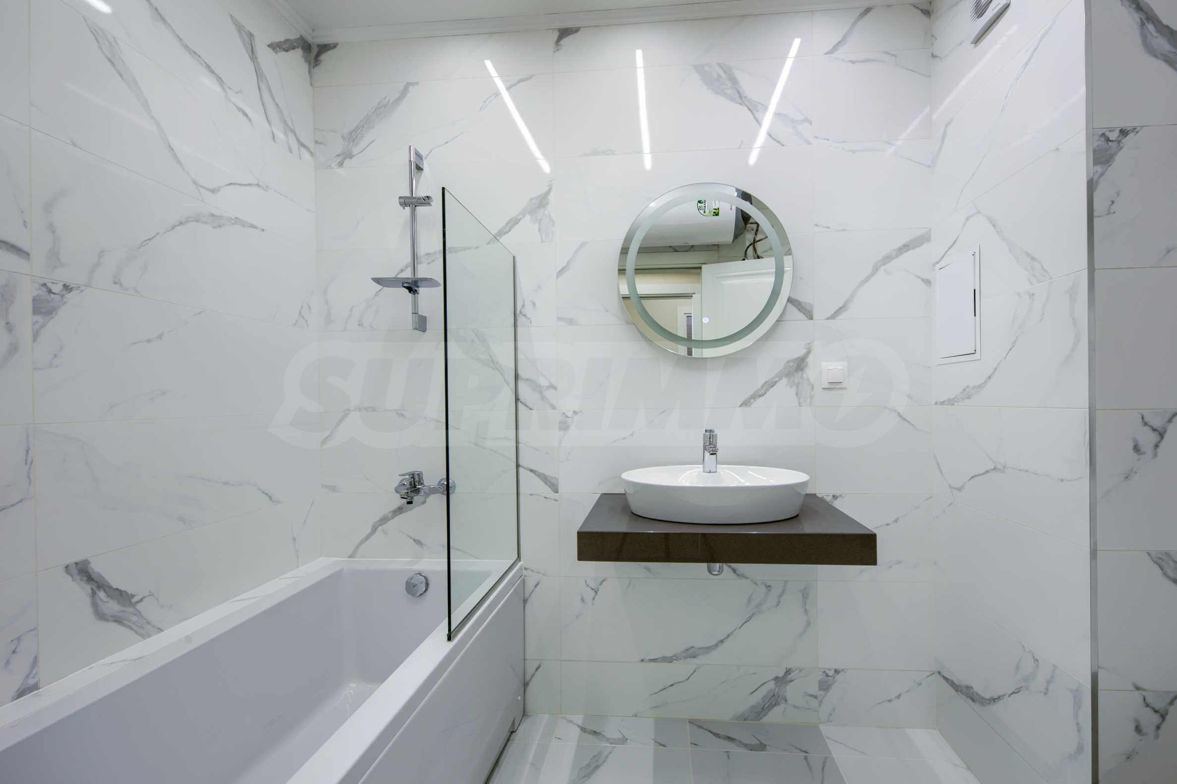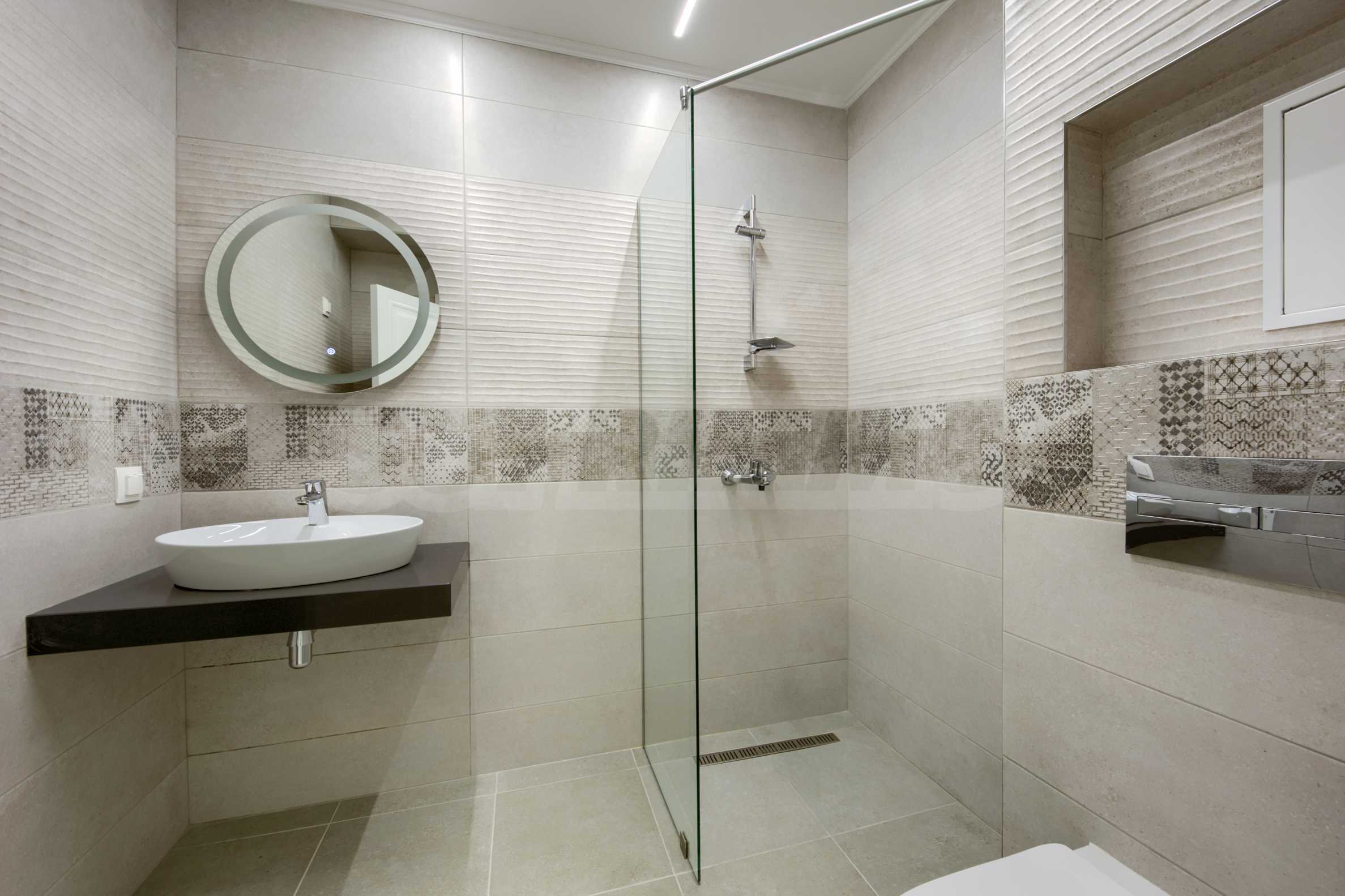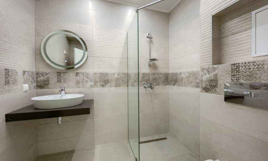 - сантехника в ванных комнатах – Roca, испанские настенные и напольные покрытия, стеклянные перегородки, освещение и аксессуары;