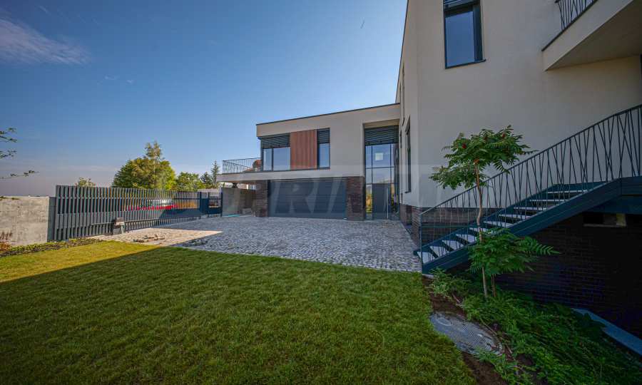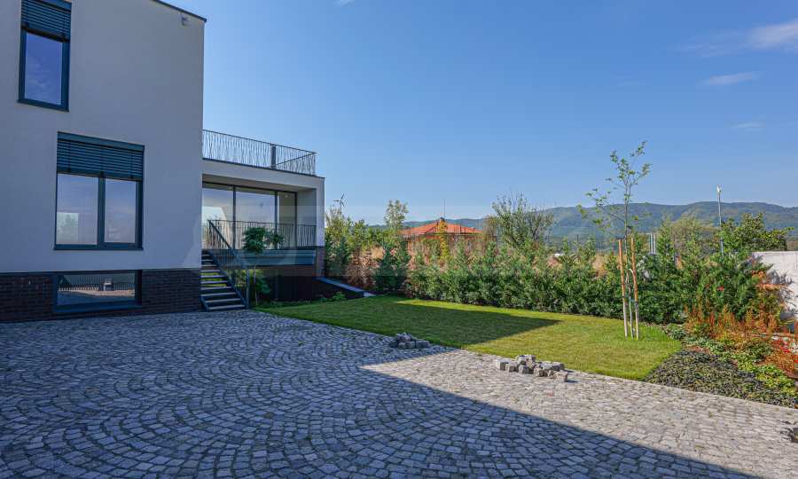 Первый этаж: гостиная и столовая на уровне двора с юга и с видом на юг, кухня, туалет, барбекю, на полууровне: два гаража на две машины, гардеробная, входной тамбур, еще одно крытое парковочное место во дворе. двор;