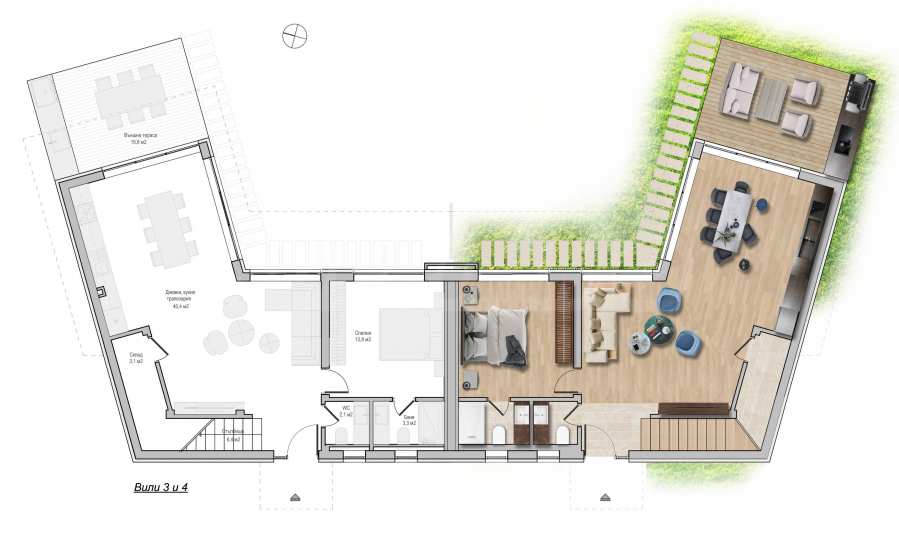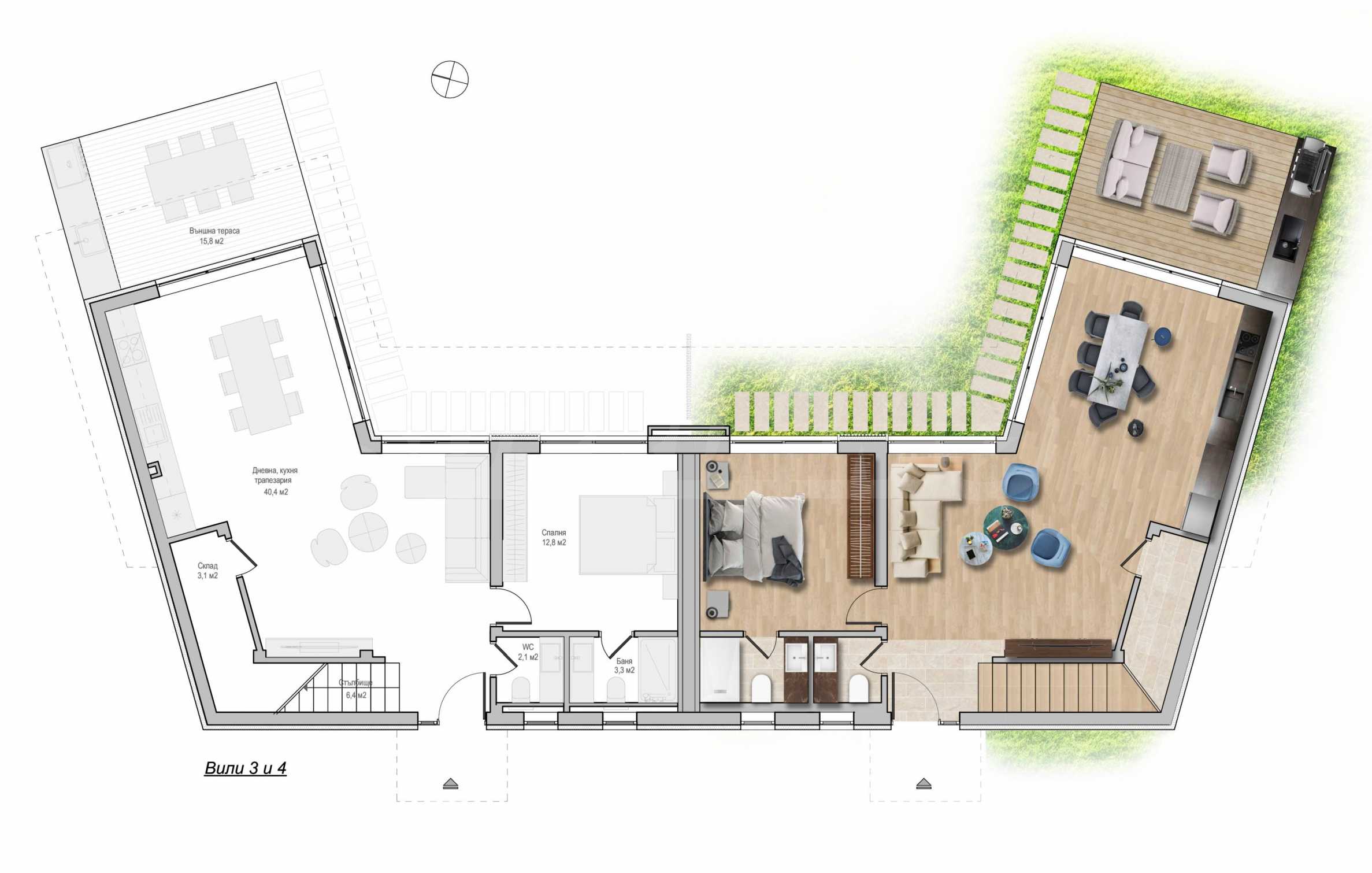 - Этаж 1 - 81 кв. метров - прихожая, гостиная с открытой кухней, столовая и гостиная, туалет, гардеробная, спальня/кабинет с отдельной ванной комнатой с туалетом;