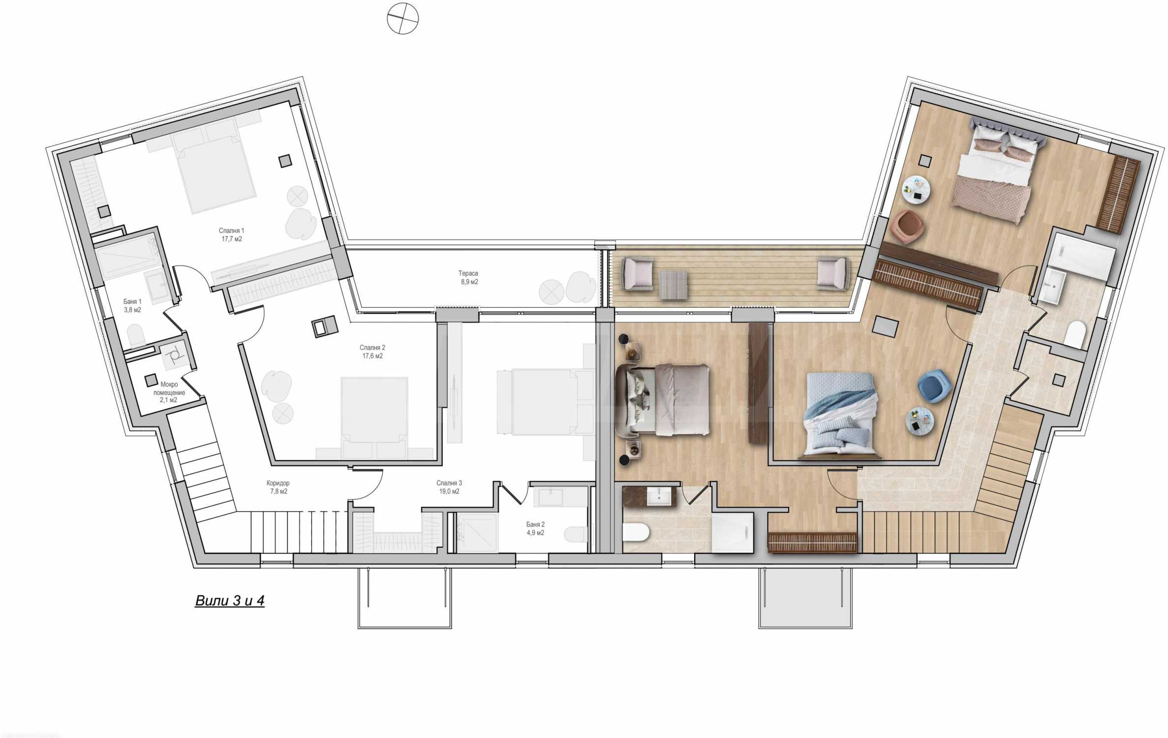 - 2 этаж - 107,30 кв. метров - три спальни, одна со своей ванной комнатой, терраса, кладовая/прачечная, ванная с туалетом.