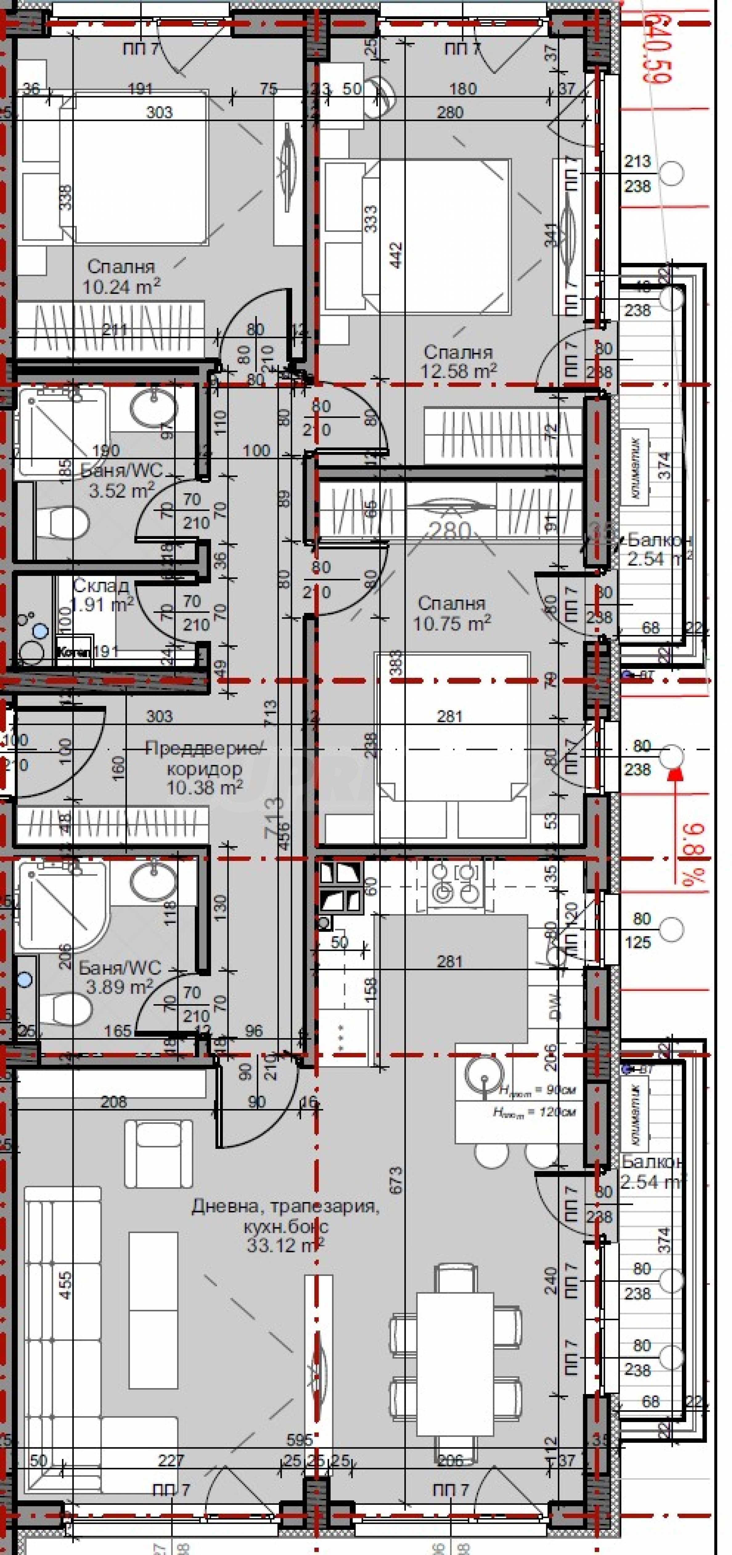 Квартира предлагается к продаже с высококачественной отделкой в соответствии с болгарскими стандартами, с использованием штукатурки и стяжки.