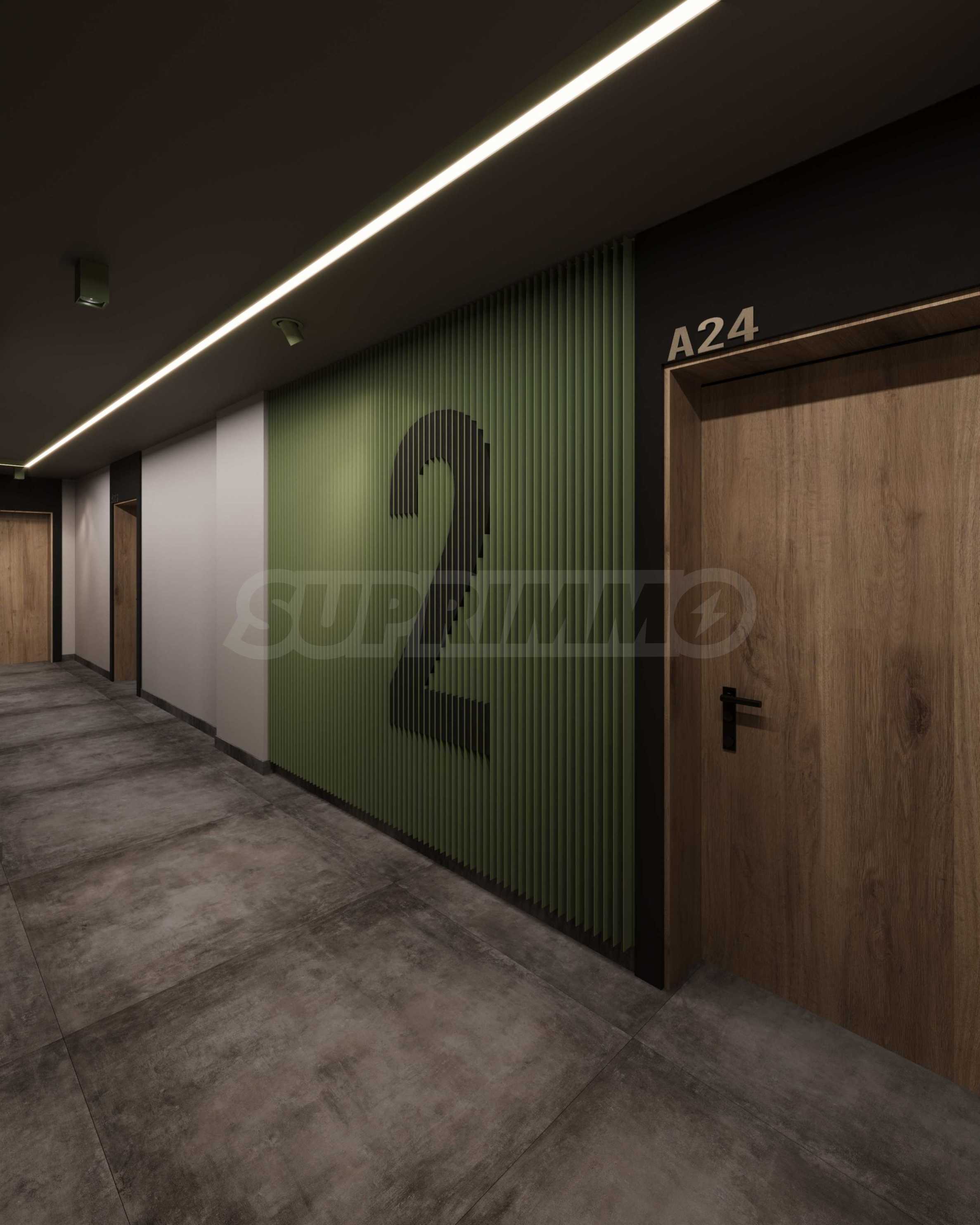 • Лестницы и площадки – пол – цементная стяжка и гранитное покрытие, металлические перила и поручни, стены – окрашены латексной краской на гипсовой шпаклевке, потолки – окрашены латексной краской на гипсовой шпаклевке, с дизайнерским освещением в соответствии с проектом.