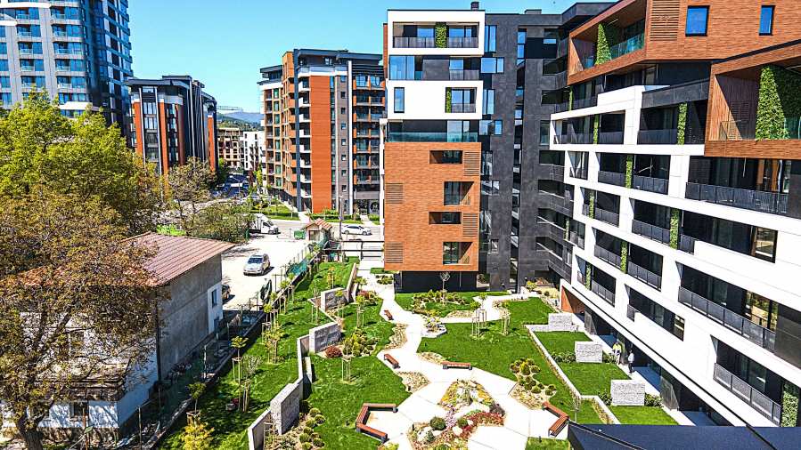 Концепция динамики городской среды рассматривается с точки зрения объема, пространства и фасада. Проект представляет собой композицию из 9-, 8-, 6- и 4-этажных объемов в общей ступенчатой структуре, спускающихся на восток в сторону будущего парка Лозенец. Дополнительными акцентами в композиции являются объемы пентхаусов, выполненные в виде своеобразных коробок, заполненных панелями HPL FUNDERMAX «орех», в которых расположены роскошные апартаменты с большей высотой потолков (3,30 м).