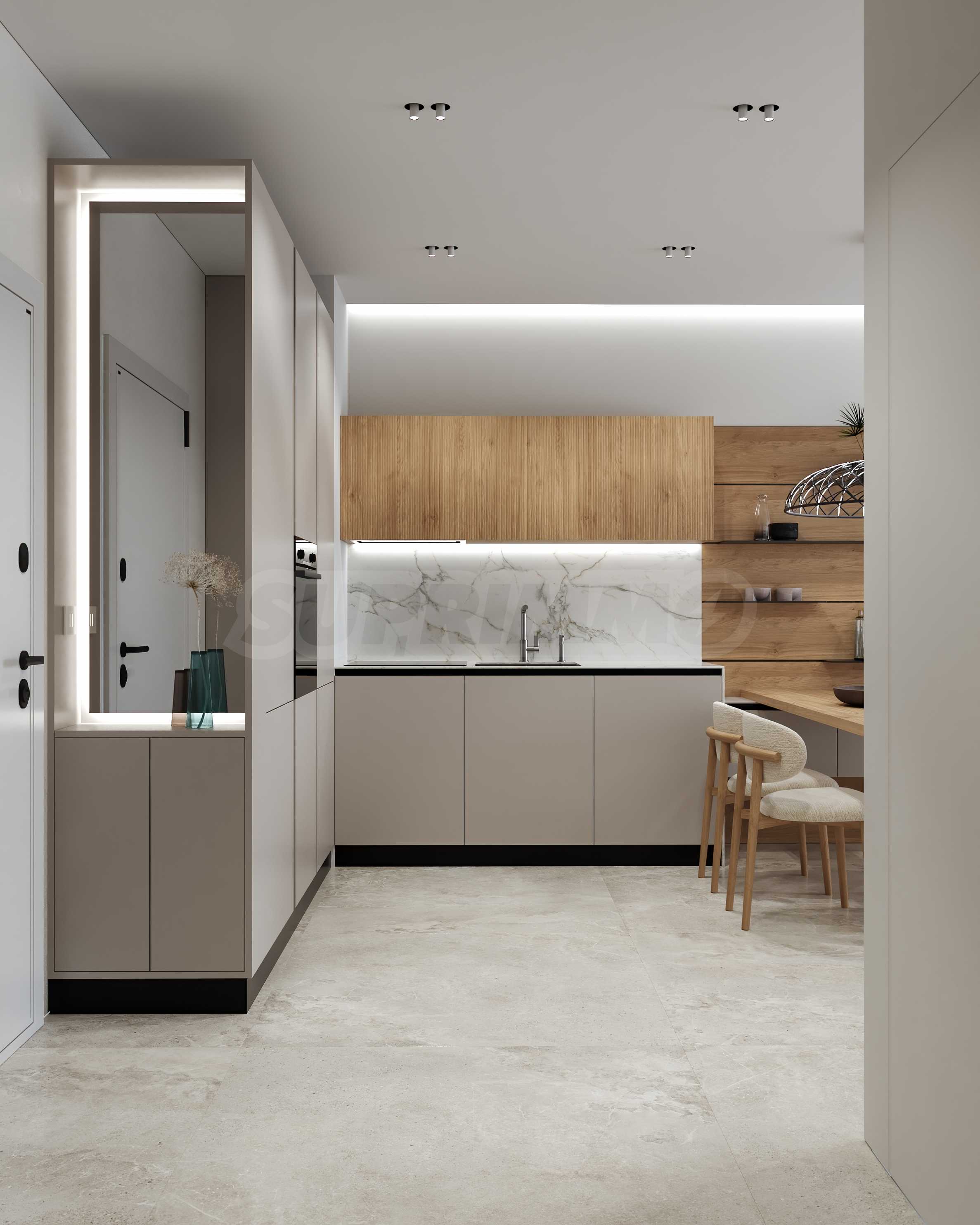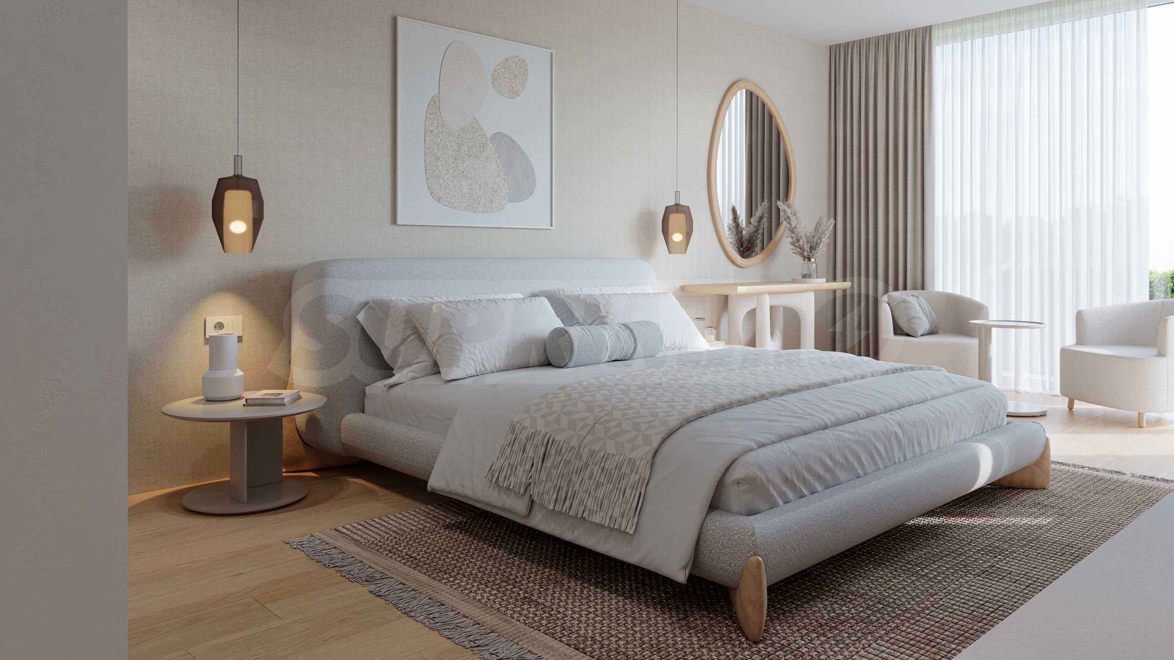 На четвертой линии моря, всего в 200 метрах по прямой от моря, спроектировано 5 зданий с бассейнами, каждое из которых имеет 4 этажа + террасы, с квартирами меньшей площади – студиями и двухкомнатными квартирами, в состоянии завершенности, соответствующем болгарским строительным нормам, с возможностью меблировки.