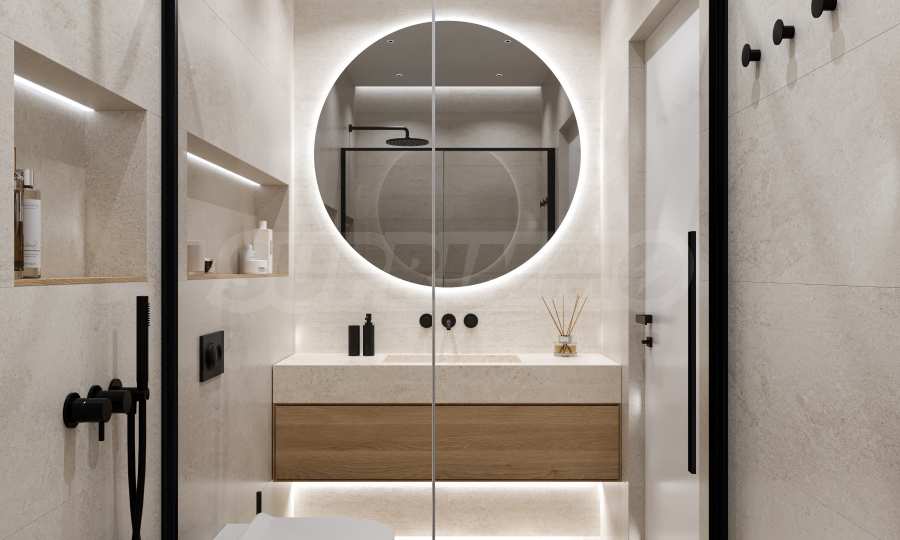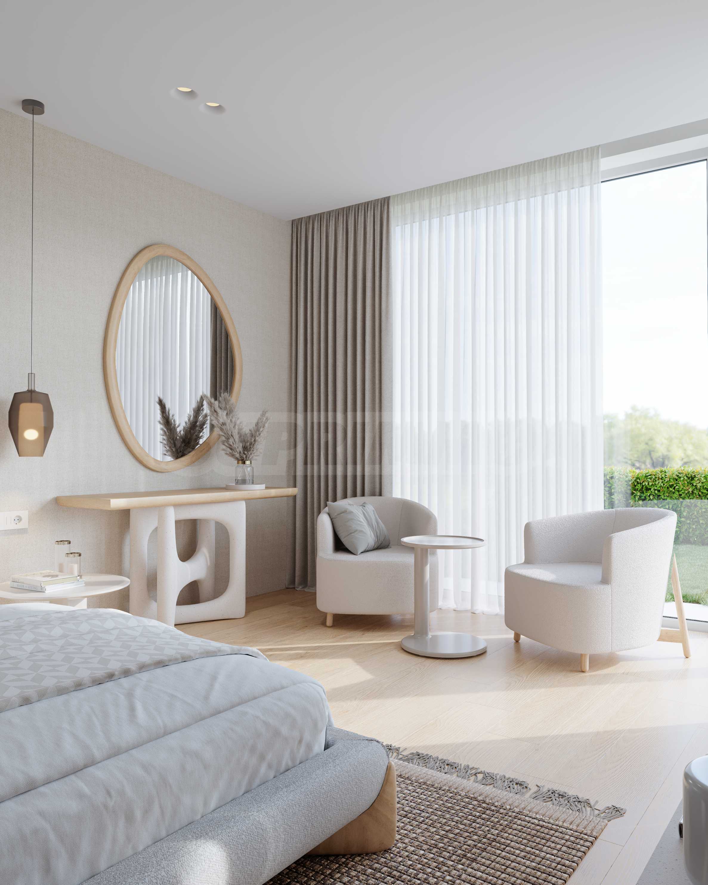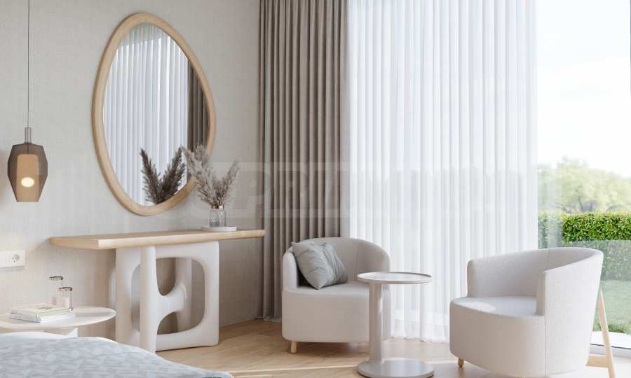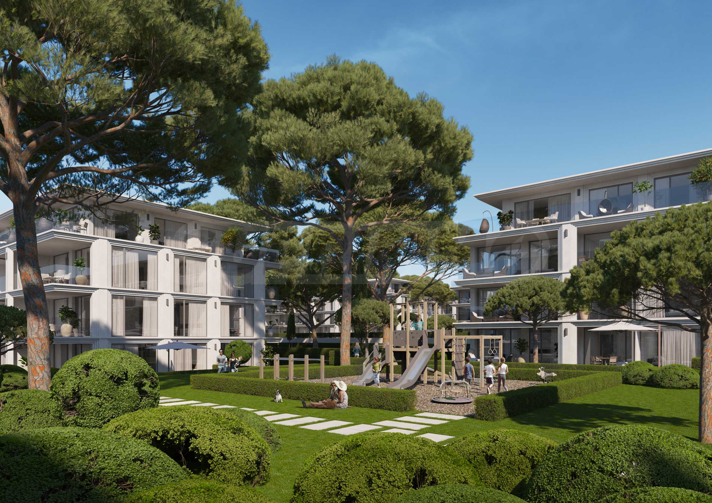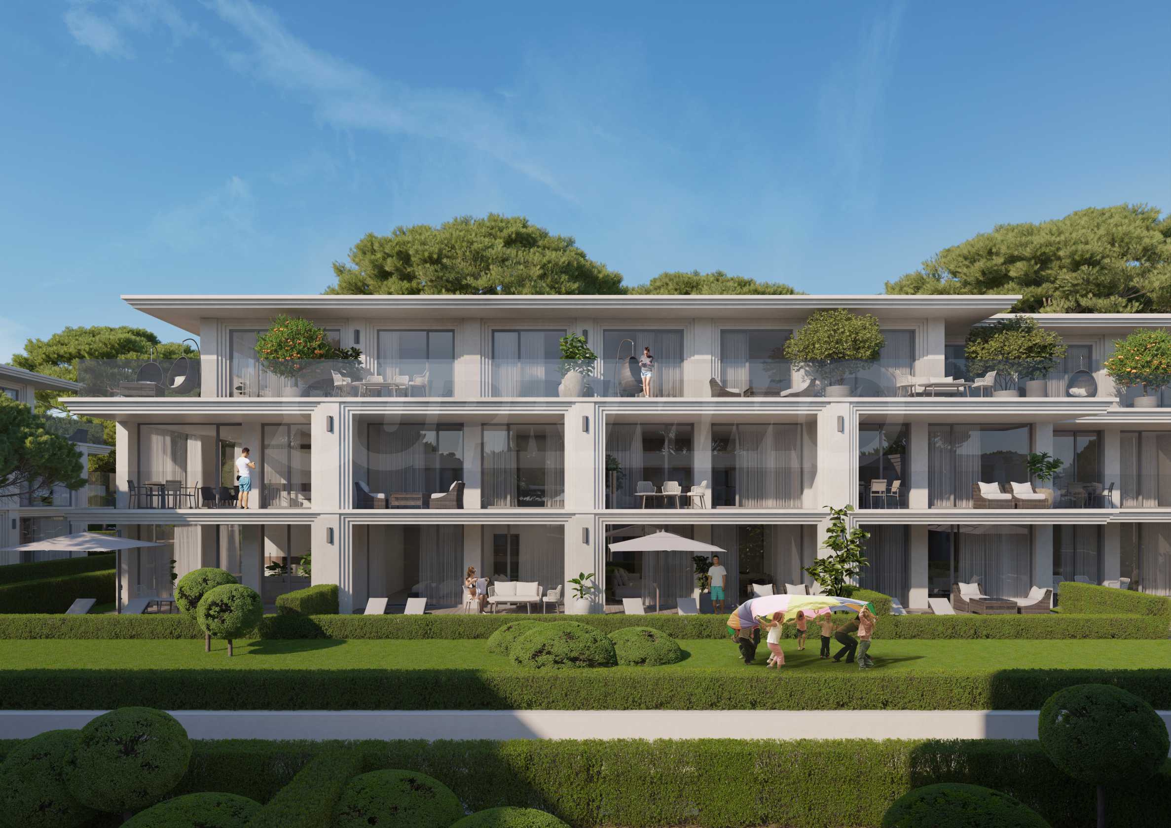 На четвертой линии моря, всего в 200 метрах по прямой от моря, спроектировано 5 зданий с бассейнами, каждое из которых имеет 4 этажа + террасы, с квартирами меньшей площади – студиями и двухкомнатными квартирами, в состоянии завершенности, соответствующем болгарским строительным нормам, с возможностью меблировки.