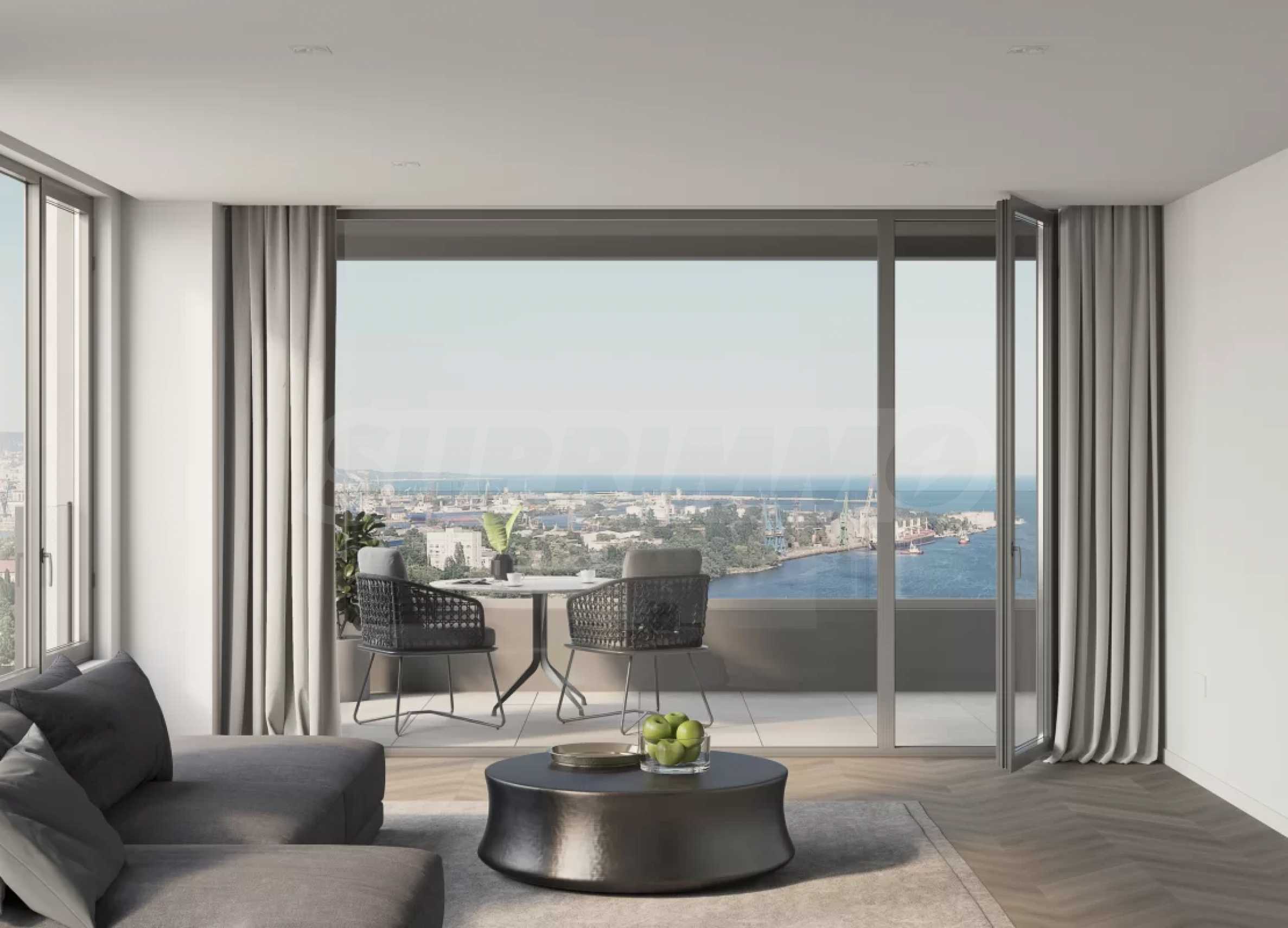 В апартаментах предусмотрены потолки высотой 3 м и французские окна, обеспечивающие беспрепятственный панорамный вид и ощущение связи с природой. Перила выполнены из стекла, что вместе с французскими окнами обеспечивает максимальное естественное освещение квартир.