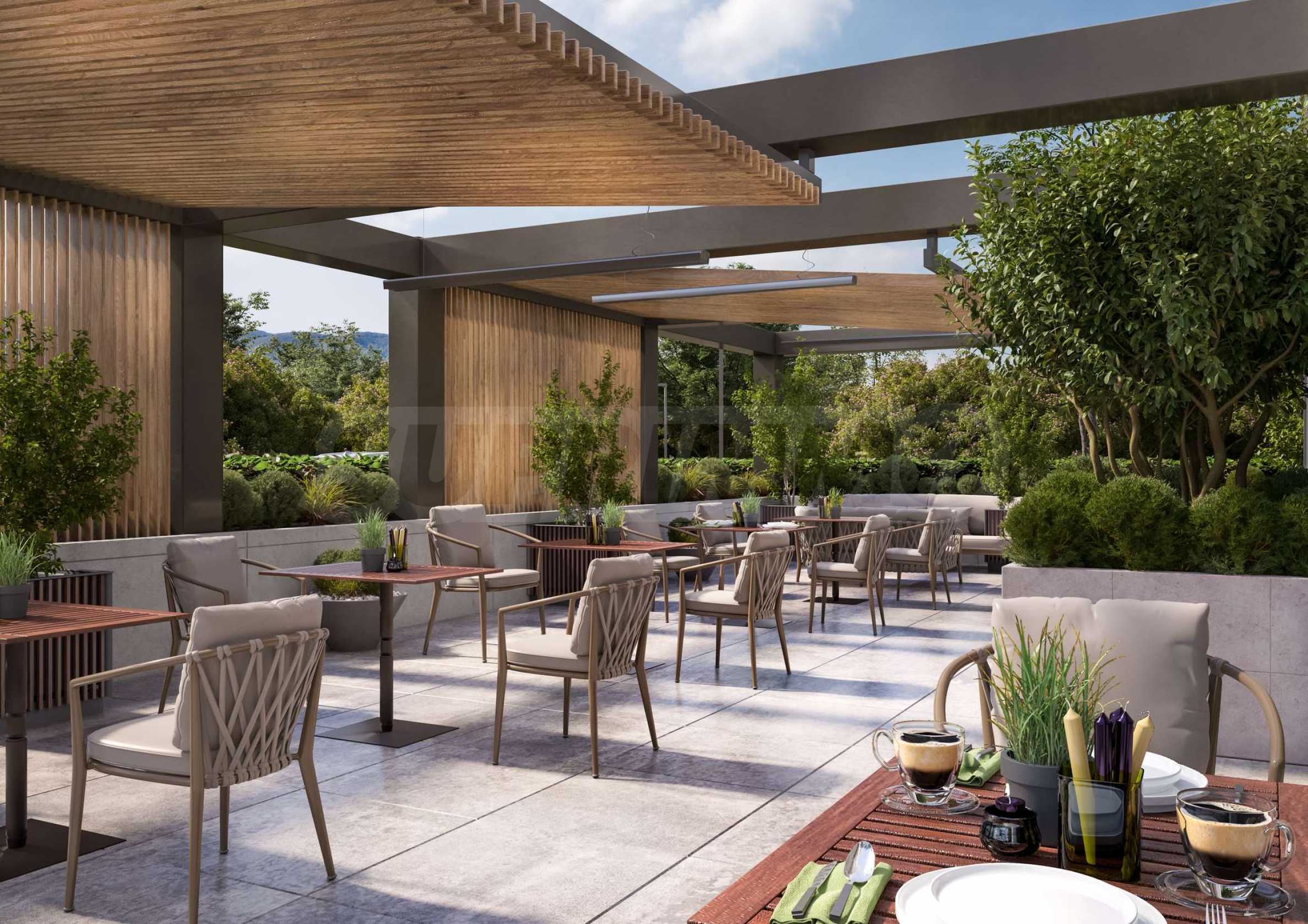Концепция проекта заключается в обеспечении будущих жильцов спокойной и комфортной средой обитания в одном из самых популярных районов столицы. Два здания объединены парковыми террасами, что создает ощущение целостности и естественной среды с обилием зелени. В парке предусмотрены зоны отдыха, спортивные площадки и детские игровые площадки, что позволит удовлетворить потребности как семей, так и людей, ведущих активный образ жизни. Внутренний двор между зданиями создает естественный фильтр и помогает жилому комплексу гармонично вписаться в окружающую среду. Озеленение территории занимает 40% территории: газоны, живые изгороди, вечнозеленые и листопадные кустарники, а также высокие лиственные и хвойные породы.