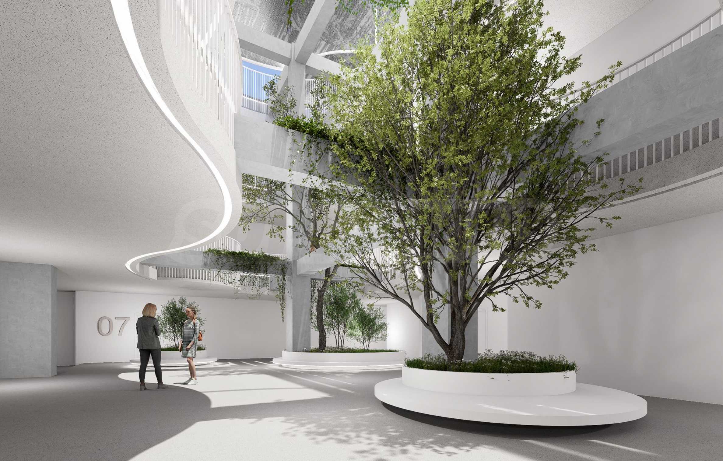 В здании четыре уровня, три из которых жилые, а на последнем расположен сад для отдыха. Всего на этажах 33 квартиры, каждая из которых имеет кладовую на цокольном этаже. Дизайн резиденций задуман с большими окнами, чтобы максимально использовать естественный свет, гармонично сочетаясь с существующей архитектурой и предлагая современные и функциональные пространства. В здании имеется впечатляющий атриум, сочетающий в себе эстетику и функциональность. Благодаря своей органичной форме и стратегическому расположению он оптимизирует естественное освещение и вентиляцию, создавая уютное пространство для встреч. Жителям дома доступны два лифта для облегчения перемещения между этажами.