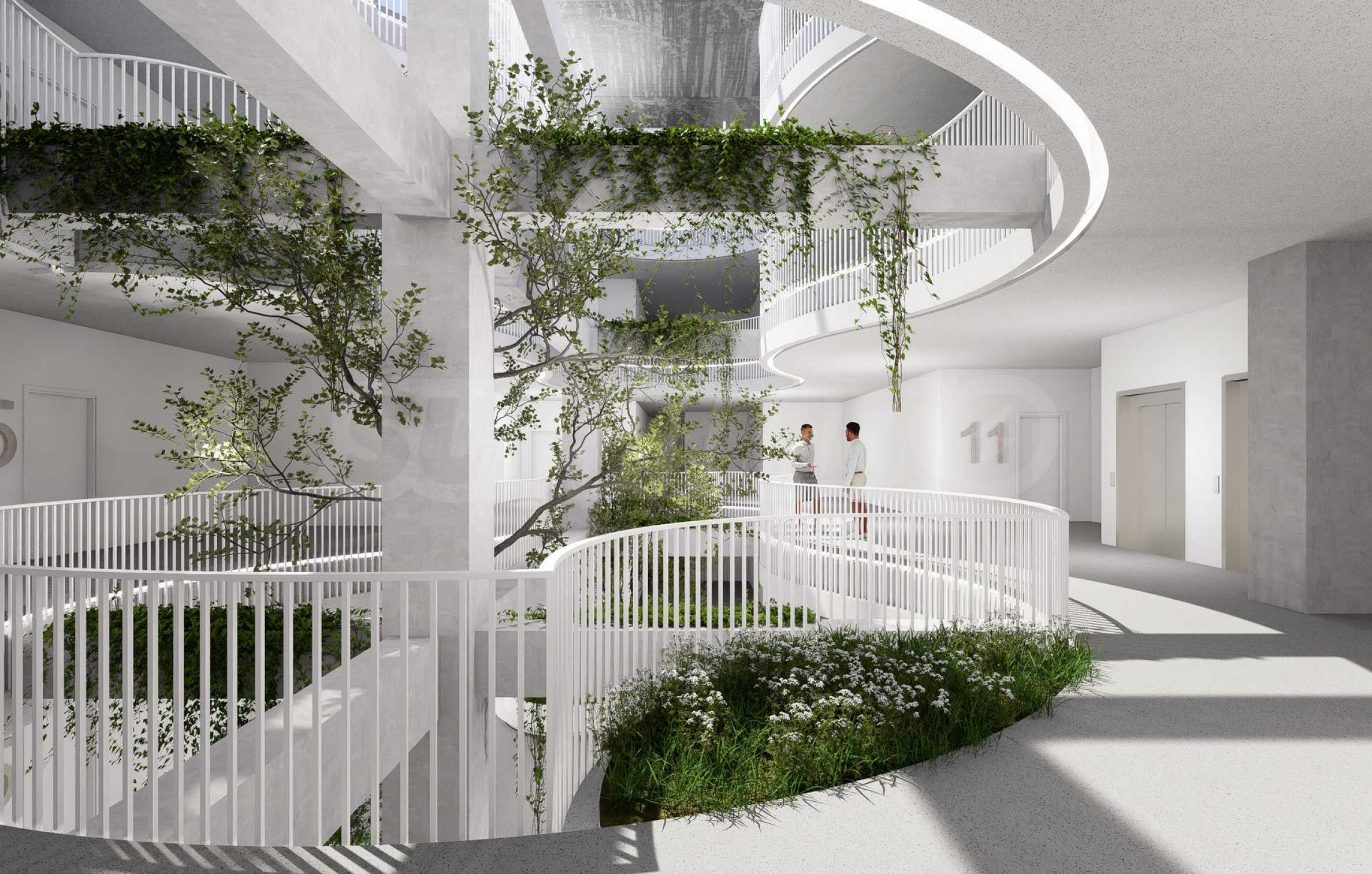 В здании четыре уровня, три из которых жилые, а на последнем расположен сад для отдыха. Всего на этажах 33 квартиры, каждая из которых имеет кладовую на цокольном этаже. Дизайн резиденций задуман с большими окнами, чтобы максимально использовать естественный свет, гармонично сочетаясь с существующей архитектурой и предлагая современные и функциональные пространства. В здании имеется впечатляющий атриум, сочетающий в себе эстетику и функциональность. Благодаря своей органичной форме и стратегическому расположению он оптимизирует естественное освещение и вентиляцию, создавая уютное пространство для встреч. Жителям дома доступны два лифта для облегчения перемещения между этажами.