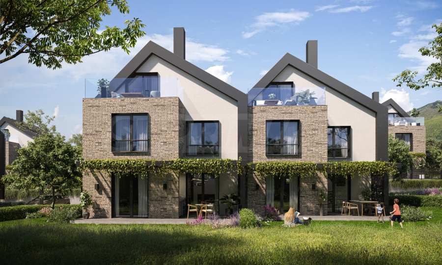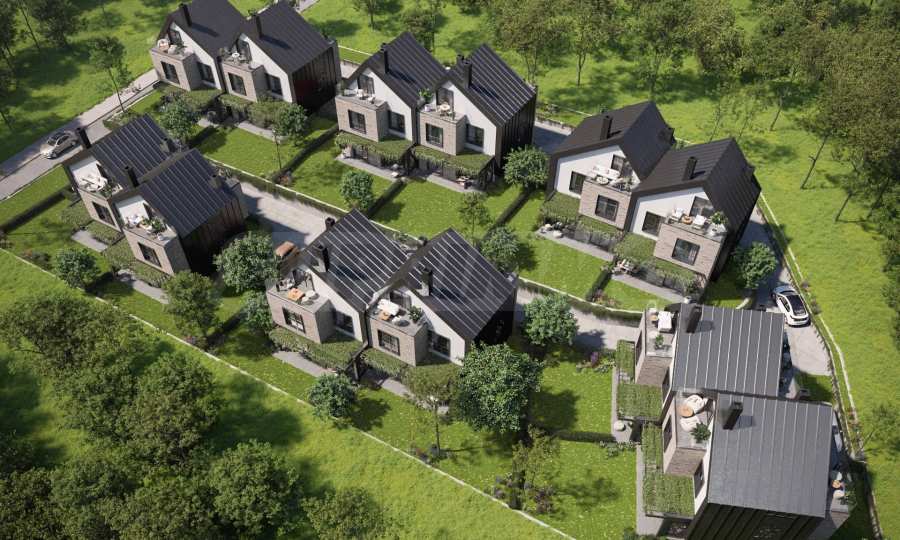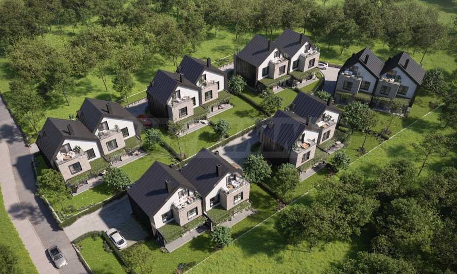 Он состоит из 12 сблокированных односемейных домов, объединенных в шесть элегантных жилых зданий в альпийском стиле, общей застроенной площадью 2506 кв. м. Он имеет собственный просторный зеленый двор и абсолютно новую инфраструктуру, а также совершенно новую частную асфальтированную дорогу.