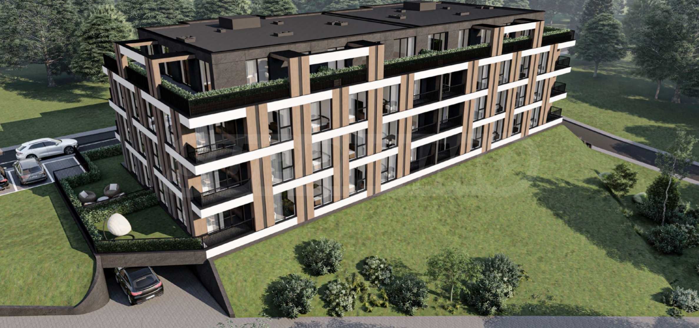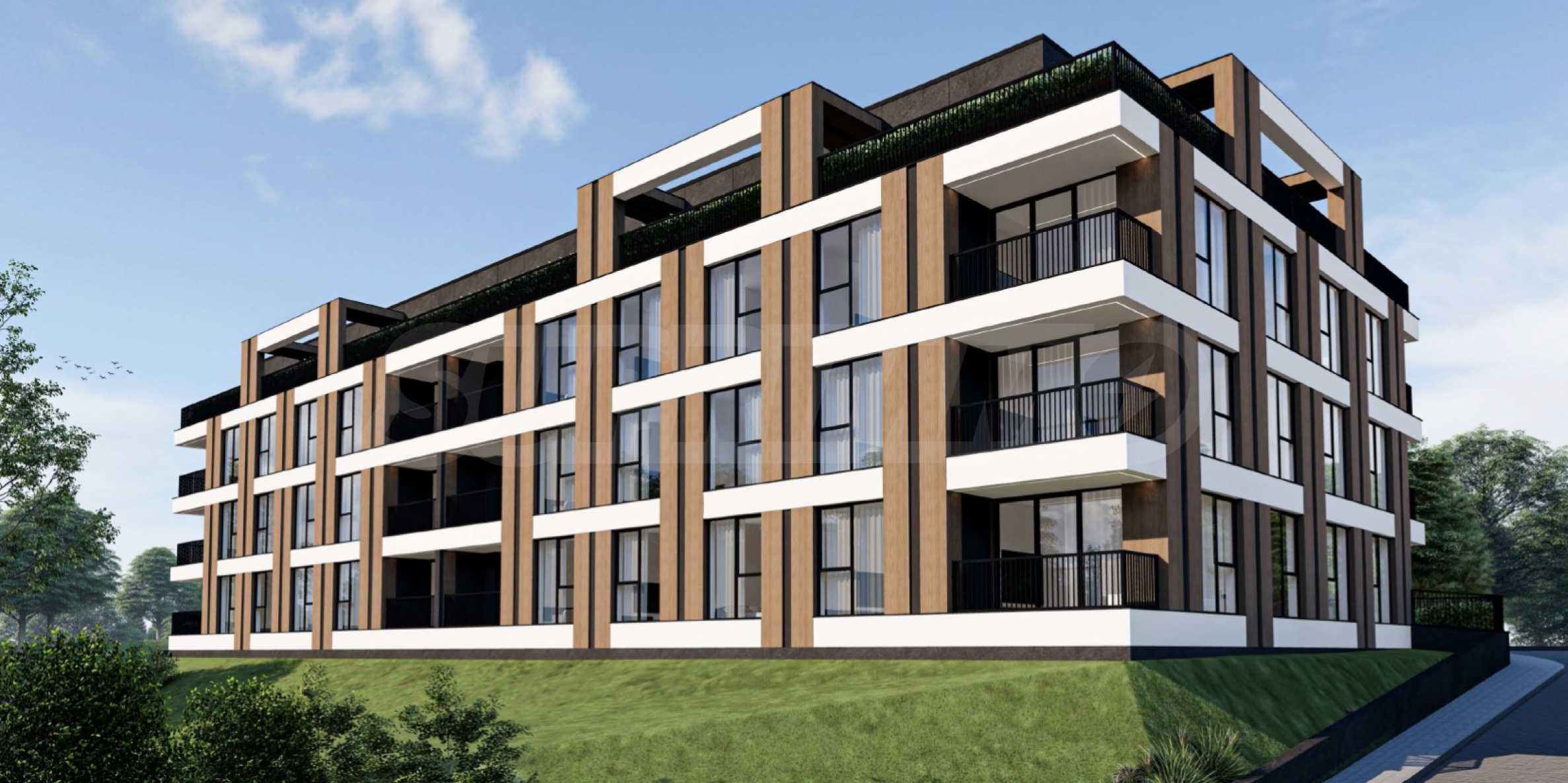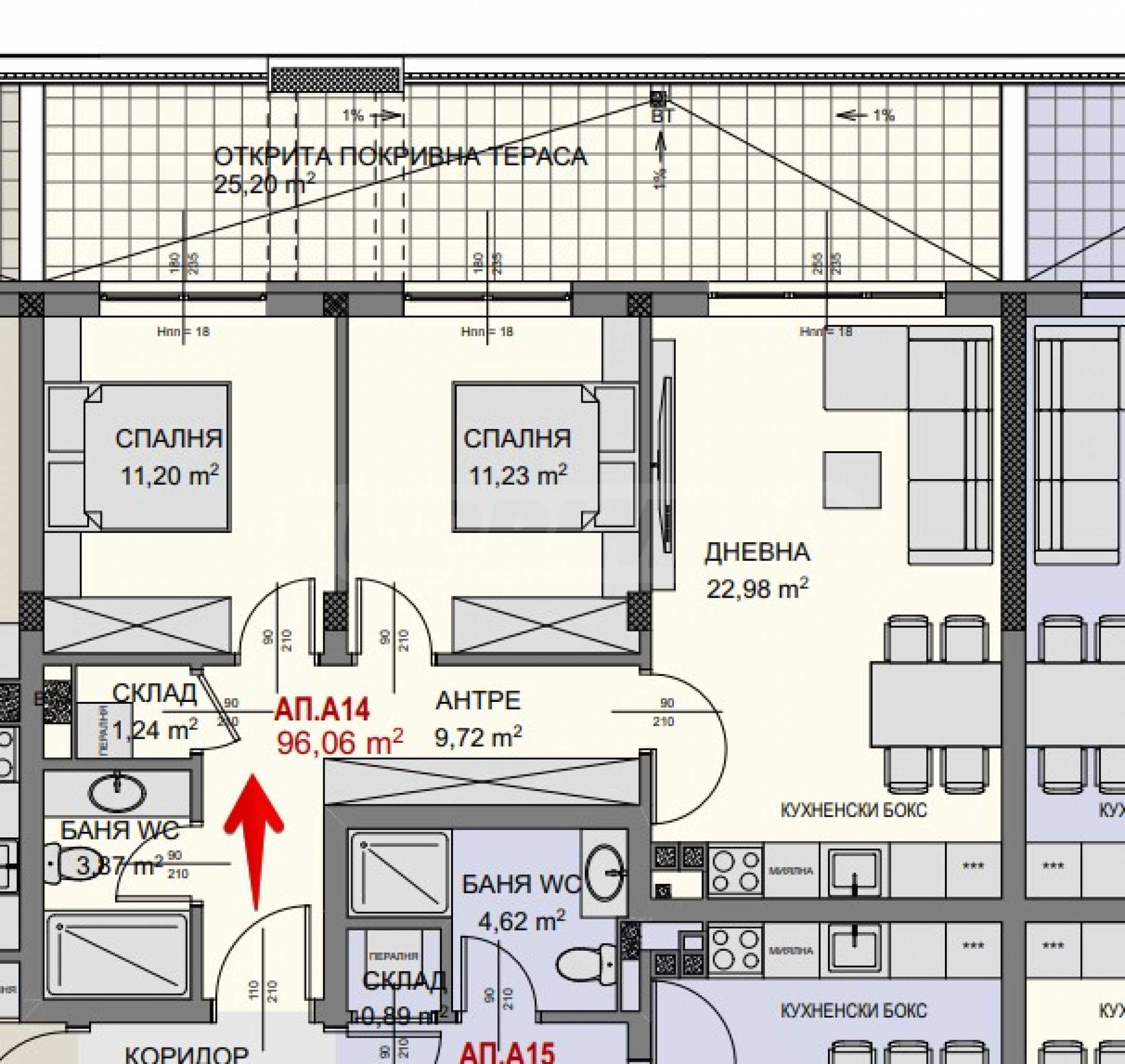 Недвижимость расположена на 4 этаже в секции «А» и имеет общую площадь 107,35 м2. Состоит из прихожей, ванной комнаты/туалета, кладовой, гостиной с кухней, двух спален, большой террасы площадью 25 кв. м. Предлагается в степени завершенности согласно болгарским строительным нормам (со шпатлевкой и стяжкой), с алюминиевыми окнами с немецким многокамерным профилем и тройным остеклением, бронированной входной дверью.