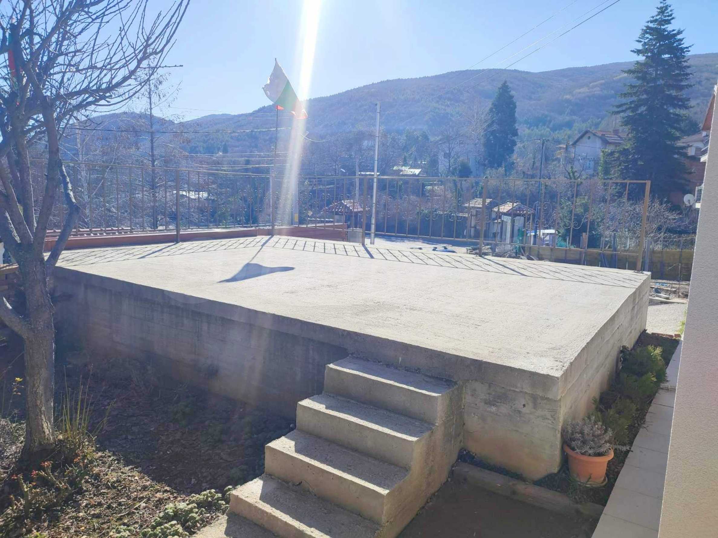В собственности имеется террасный двор площадью 430 м2 с прекрасным видом на горы, а также монолитный гараж, над которым расположена терраса и уличный фонтан.