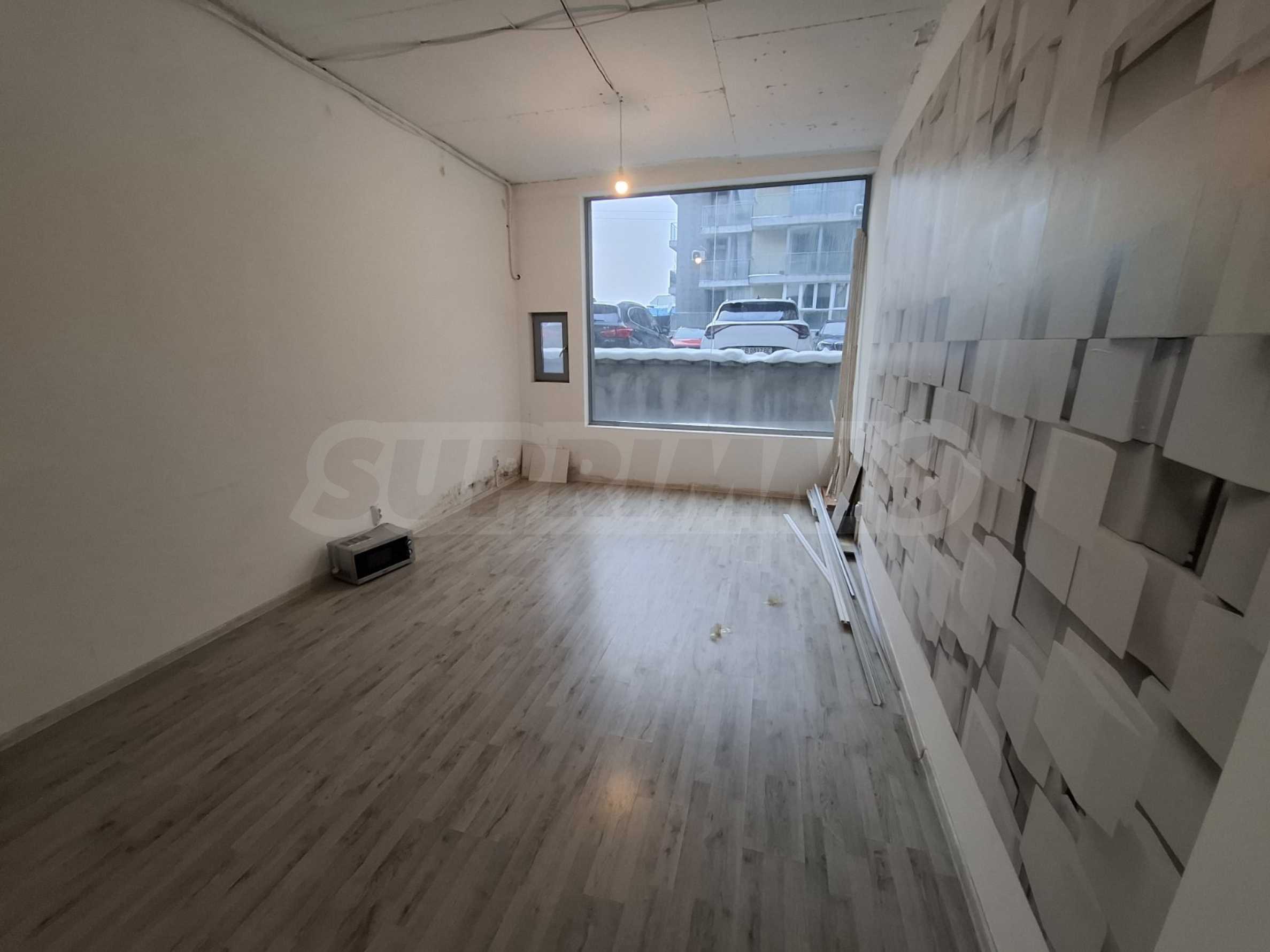 Помещение с отделкой «под ключ», с двумя санузлами, на полу ламинат и высокопрочное напольное покрытие. Он расположен на уровне улицы, с видом на восток, с двумя входными дверями.