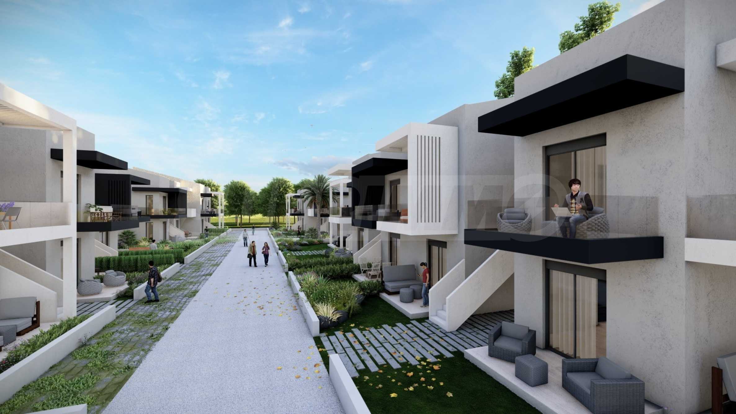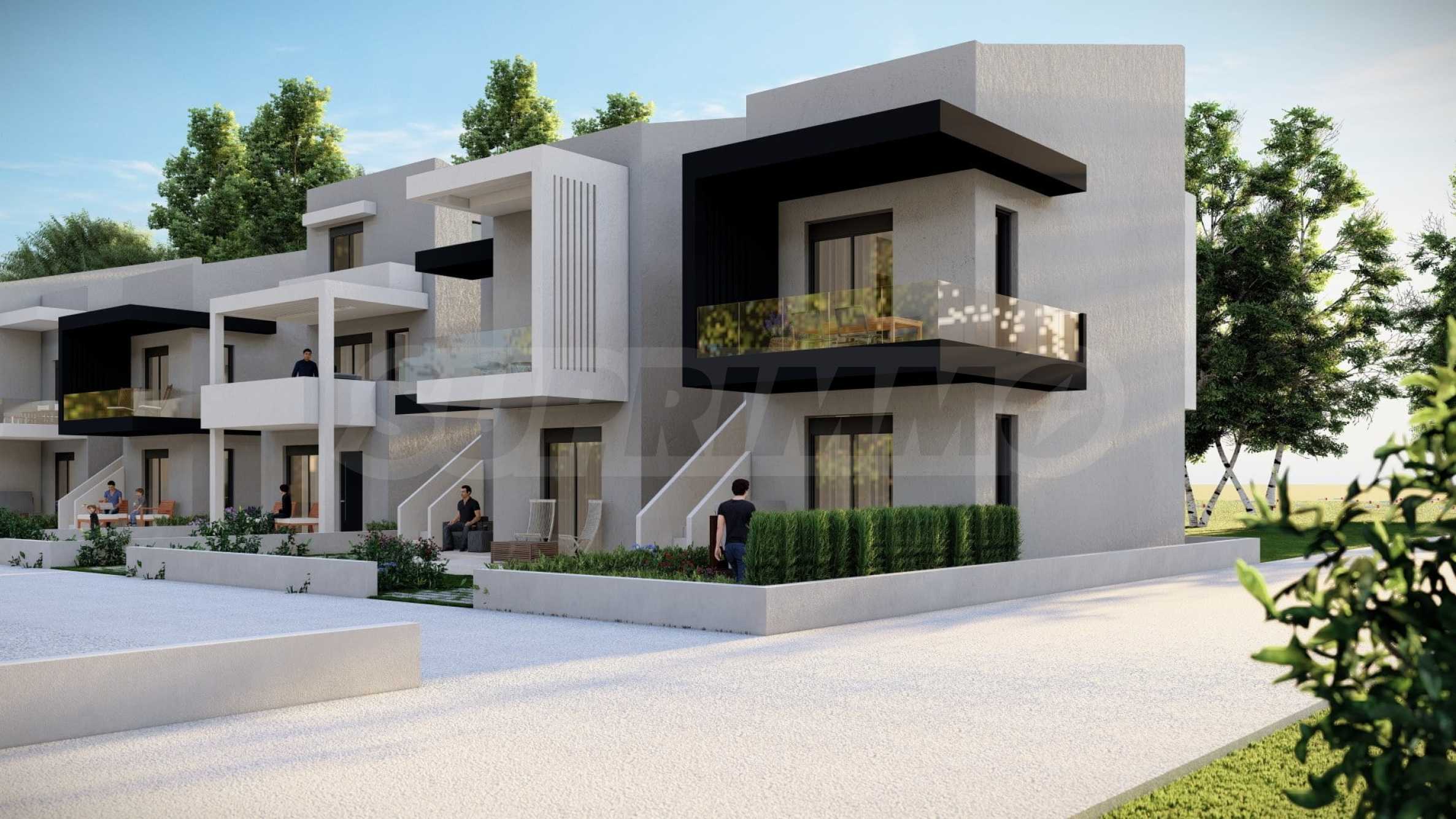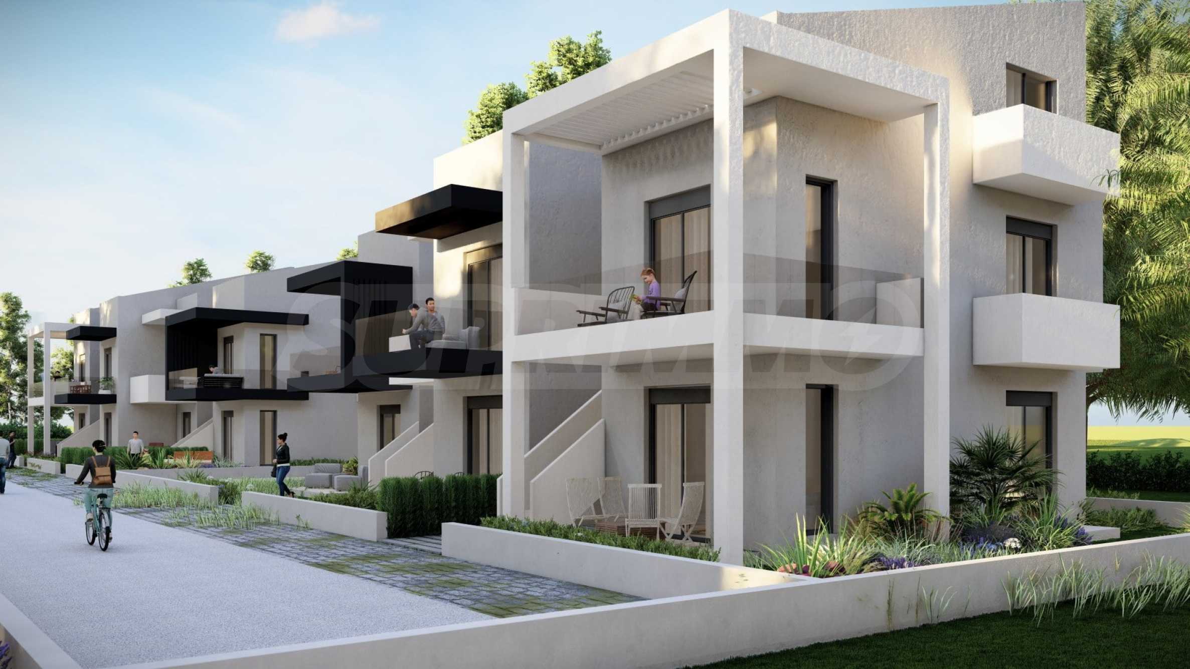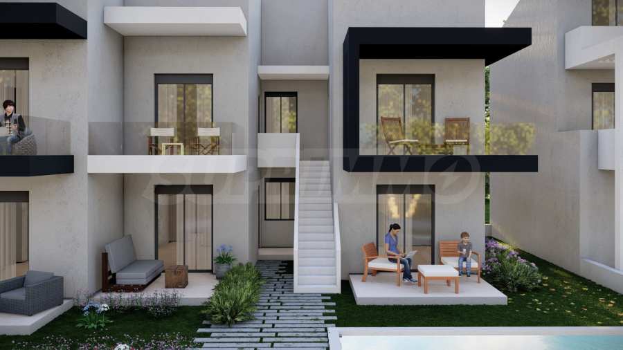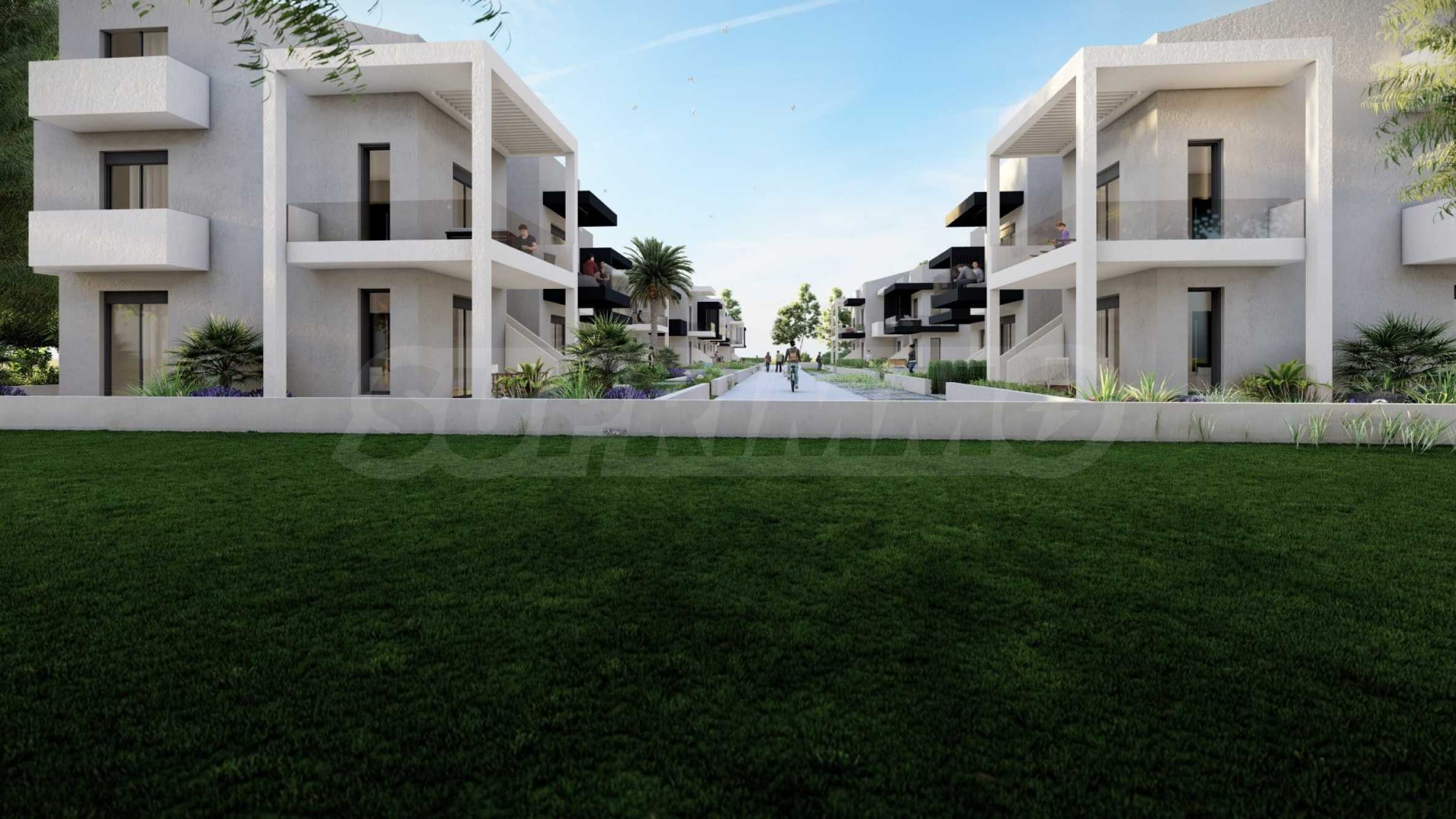 Комплекс включает в себя 47 современных и практичных домов, отличающихся элегантностью и чистотой архитектурных форм. Спроектированные в соответствии с последними тенденциями в архитектуре, эти пространства обеспечивают максимальный доступ естественного света и подчеркивают гармоничность интерьерных решений. Стеклянные элементы на балконах добавляют ощущение легкости и простора, делая их идеальным местом для отдыха и уединения. В настоящее время предлагается ограниченное количество объектов недвижимости — 23 квартиры, расположенные на двух уровнях. В каждом из них есть просторная гостиная с мини-кухней, две спальни, ванная комната и кладовая. Квартиры сдаются полностью «под ключ», включая напольное покрытие, входные и межкомнатные двери, встроенные кухни и оборудованные санузлы.
