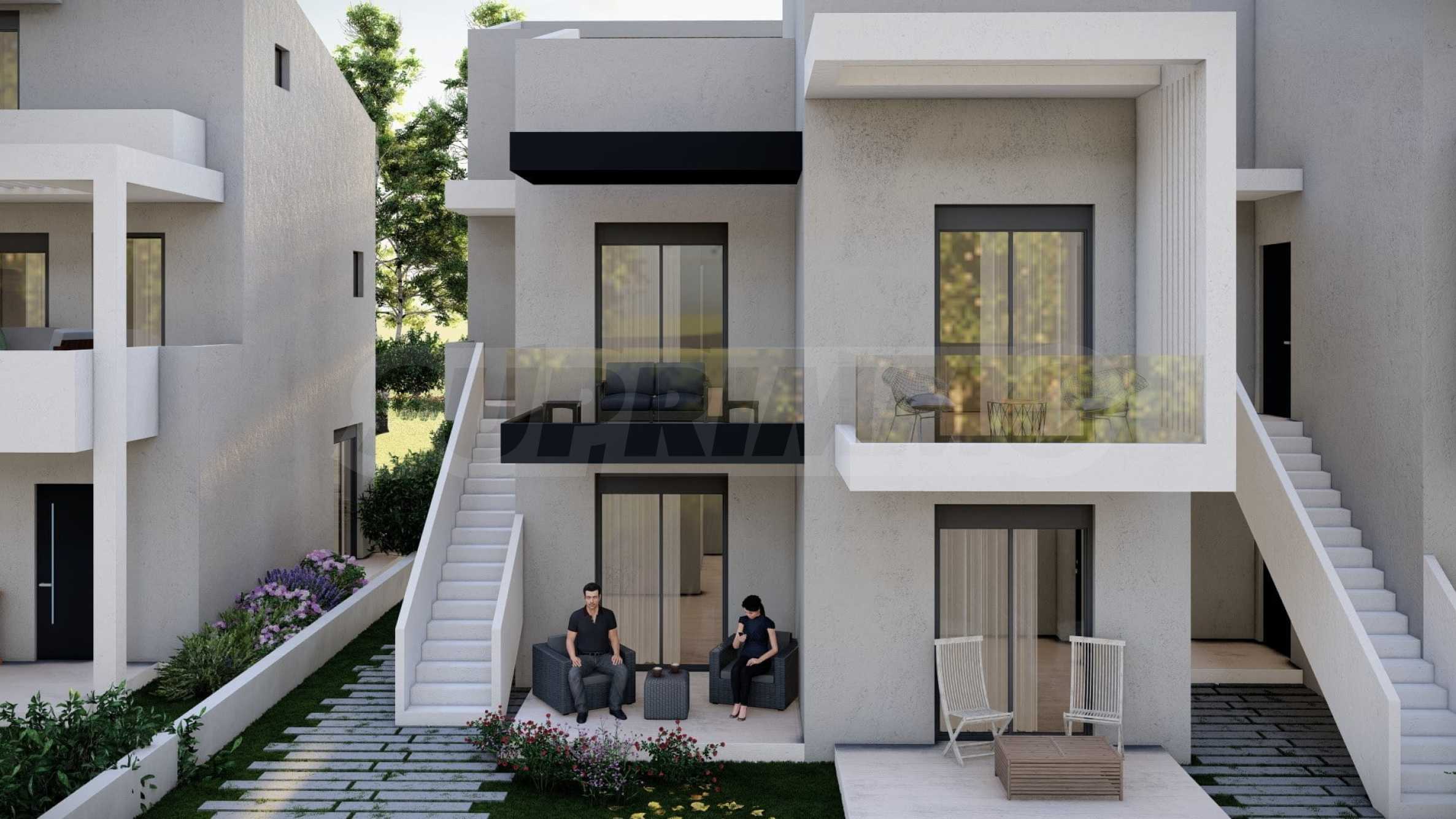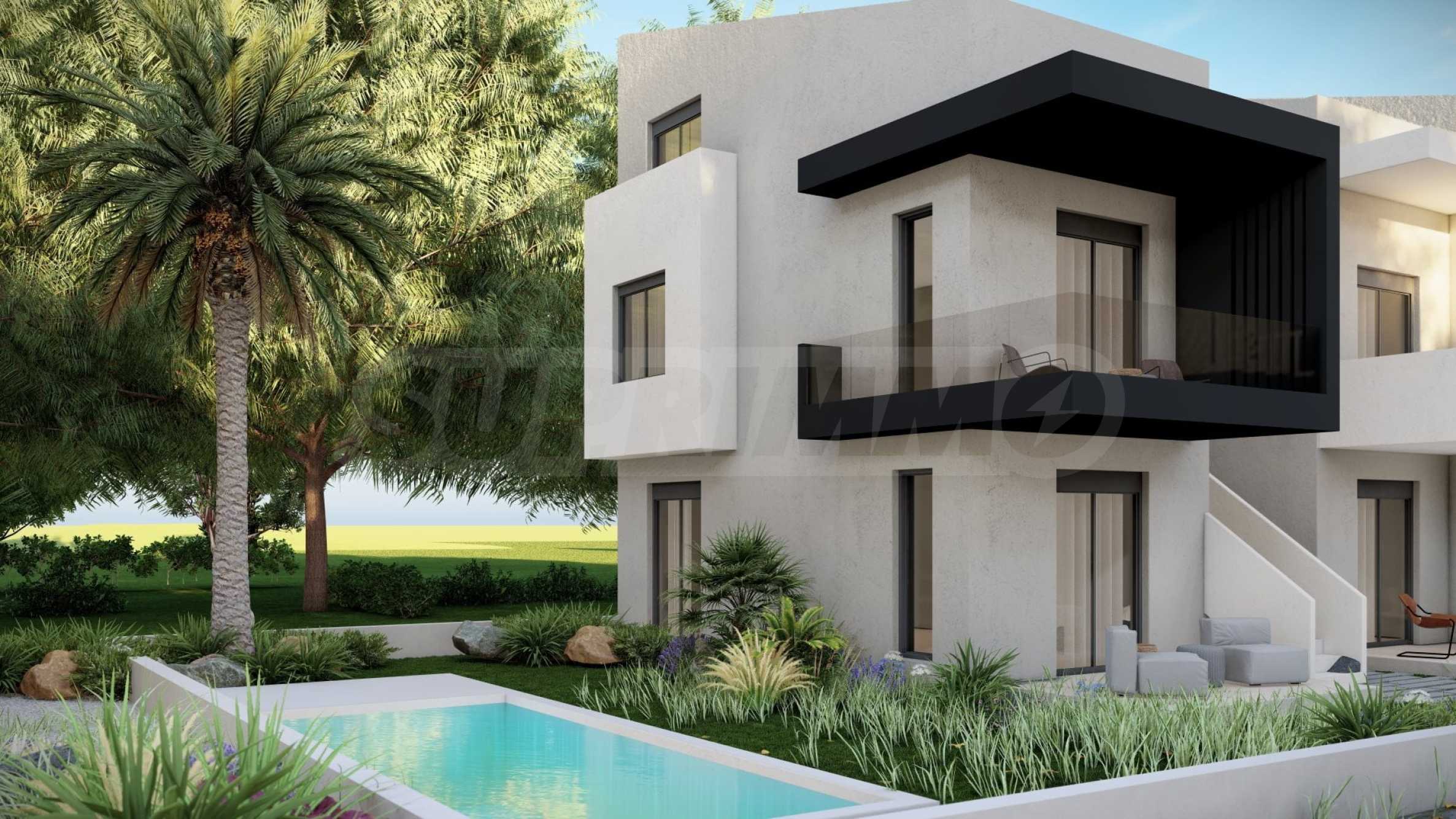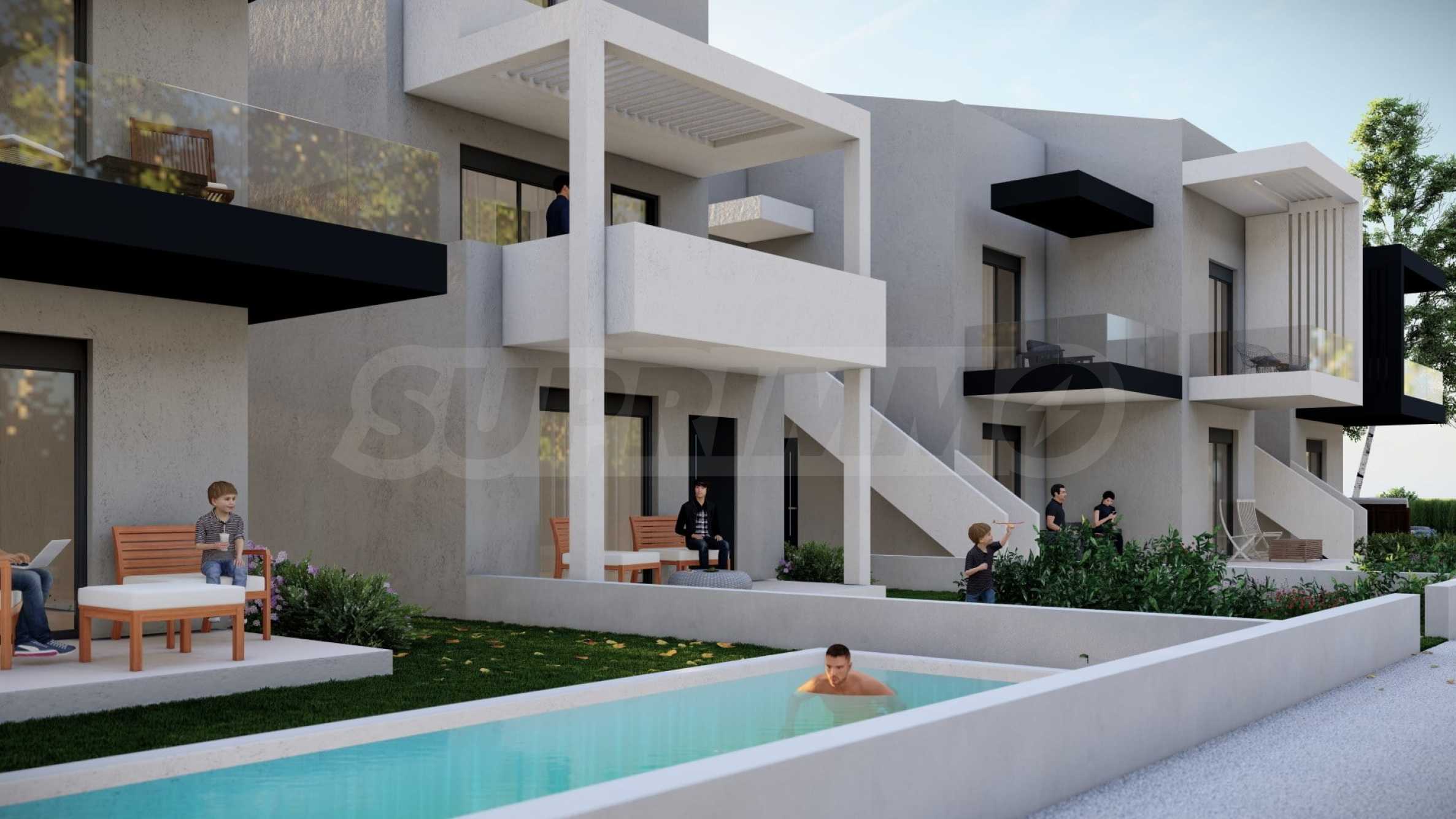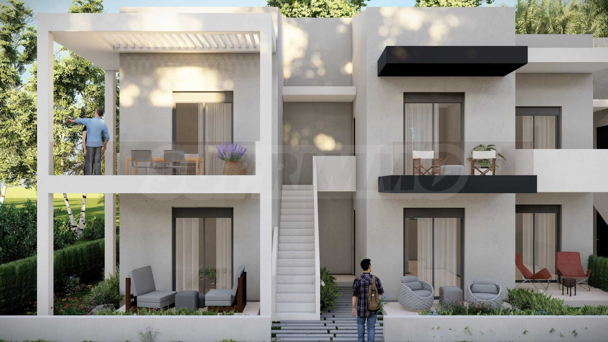 Комплекс включает в себя 47 современных и практичных домов, отличающихся элегантностью и чистотой архитектурных форм. Спроектированные в соответствии с последними тенденциями в архитектуре, эти пространства обеспечивают максимальный доступ естественного света и подчеркивают гармоничность интерьерных решений. Стеклянные элементы на балконах добавляют ощущение легкости и простора, делая их идеальным местом для отдыха и уединения. В настоящее время предлагается ограниченное количество объектов недвижимости — 23 квартиры, расположенные на двух уровнях. В каждом из них есть просторная гостиная с мини-кухней, две спальни, ванная комната и кладовая. Квартиры сдаются полностью «под ключ», включая напольное покрытие, входные и межкомнатные двери, встроенные кухни и оборудованные санузлы.