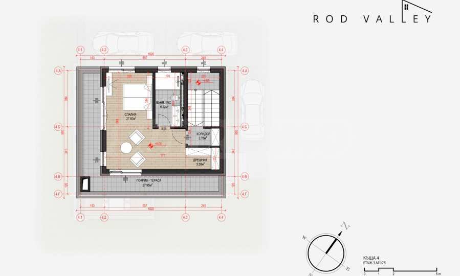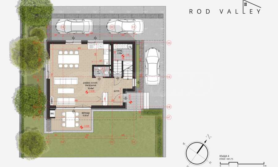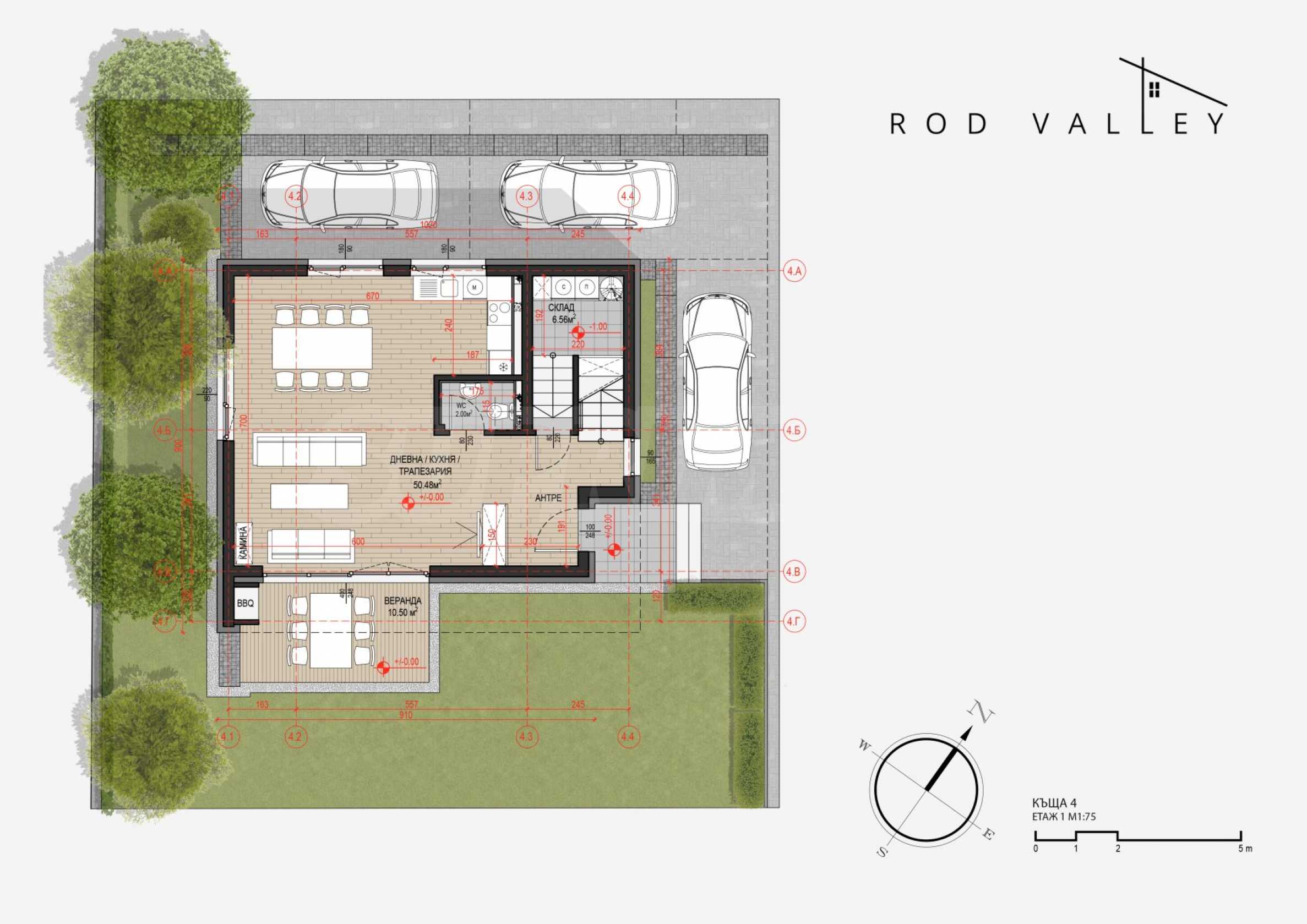 Планировка дома обеспечивает удобство и функциональность. На первом этаже находится просторная гостиная со столовой и кухней, гостевой туалет, кладовая и веранда с зоной барбекю. На втором этаже находится главная спальня с собственной ванной комнатой и туалетом, две дополнительные спальни и еще одна ванная комната с туалетом. Третий этаж предназначен для спальни с ванной, туалетом и гардеробной, а также террасы на крыше.