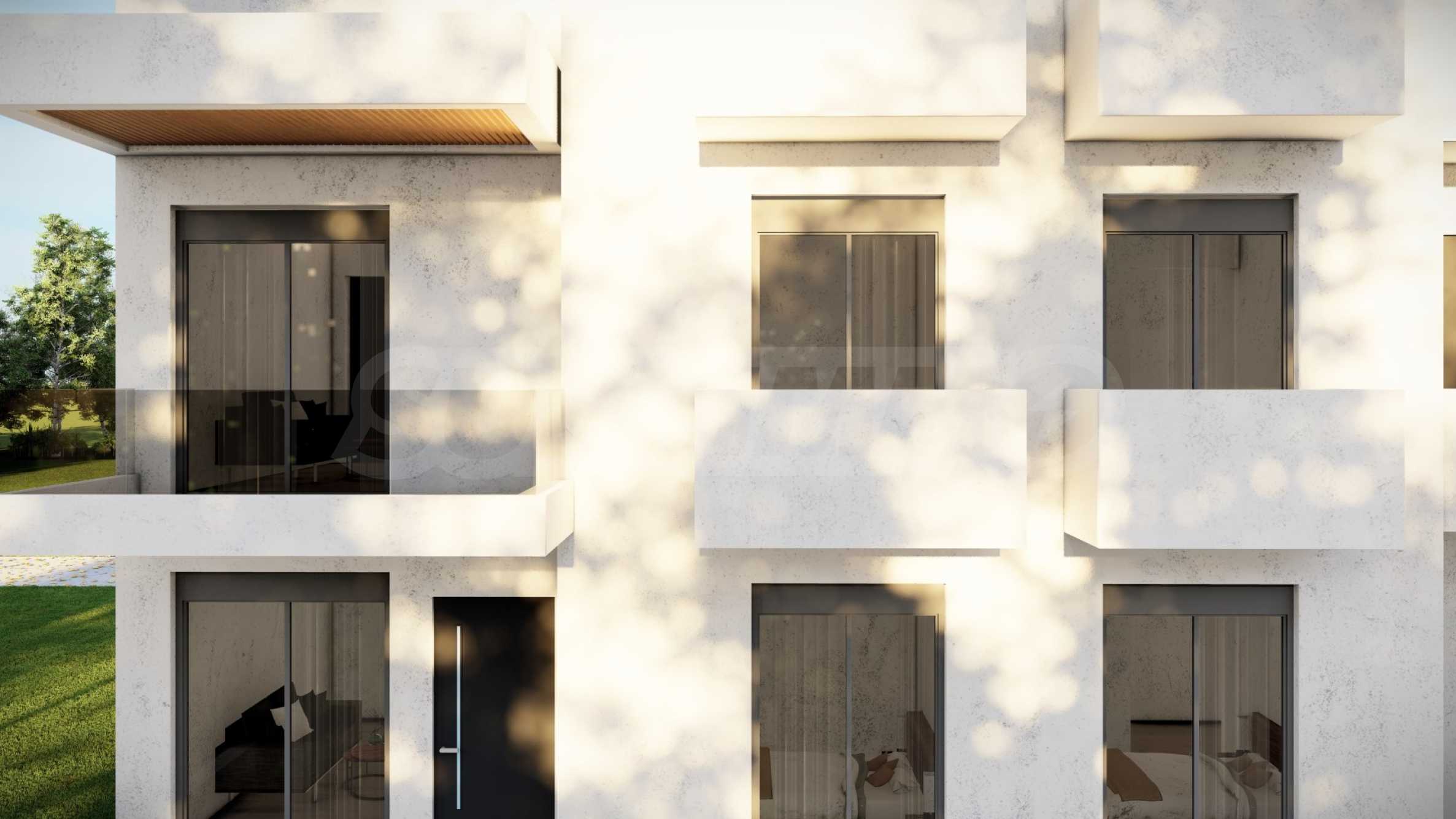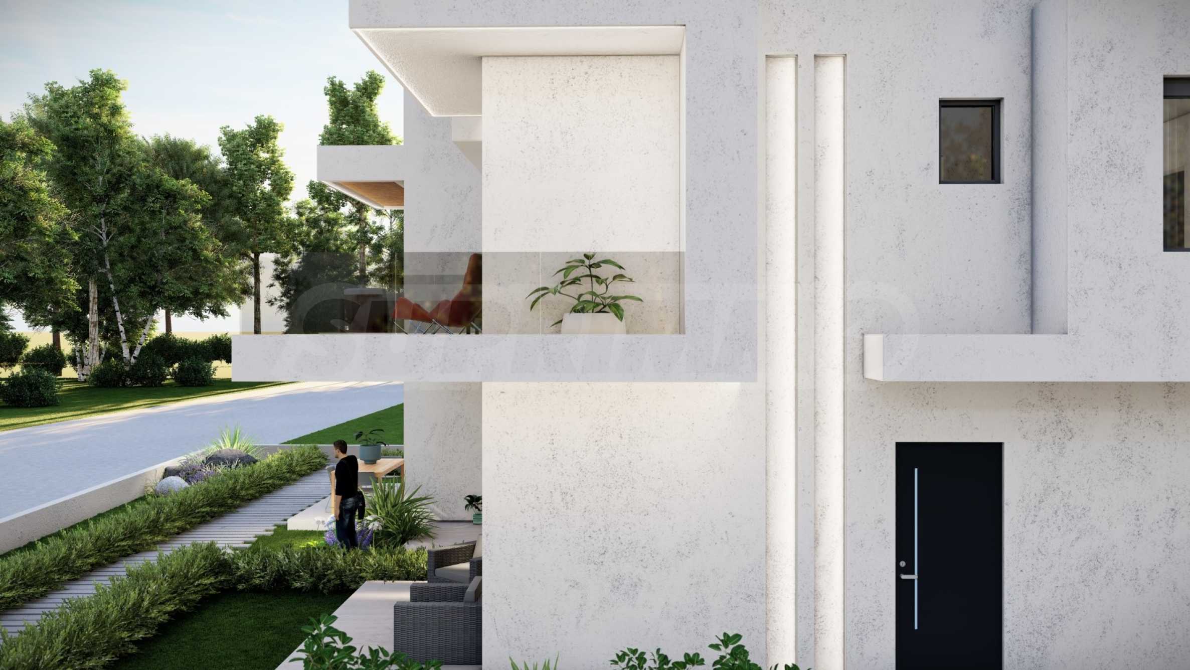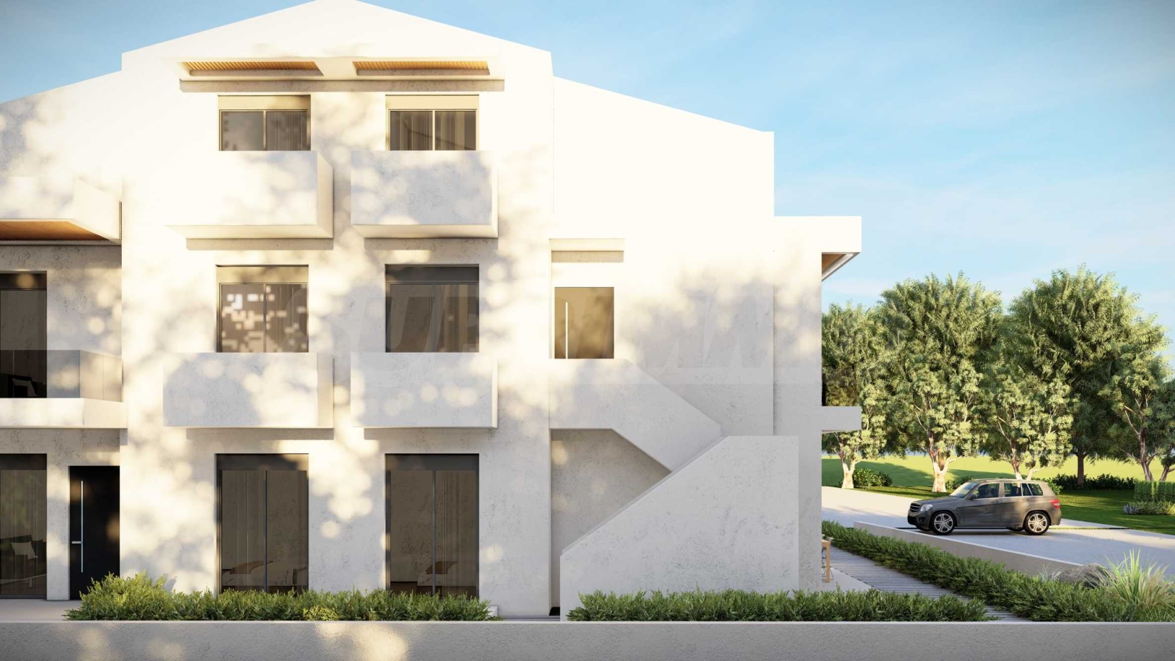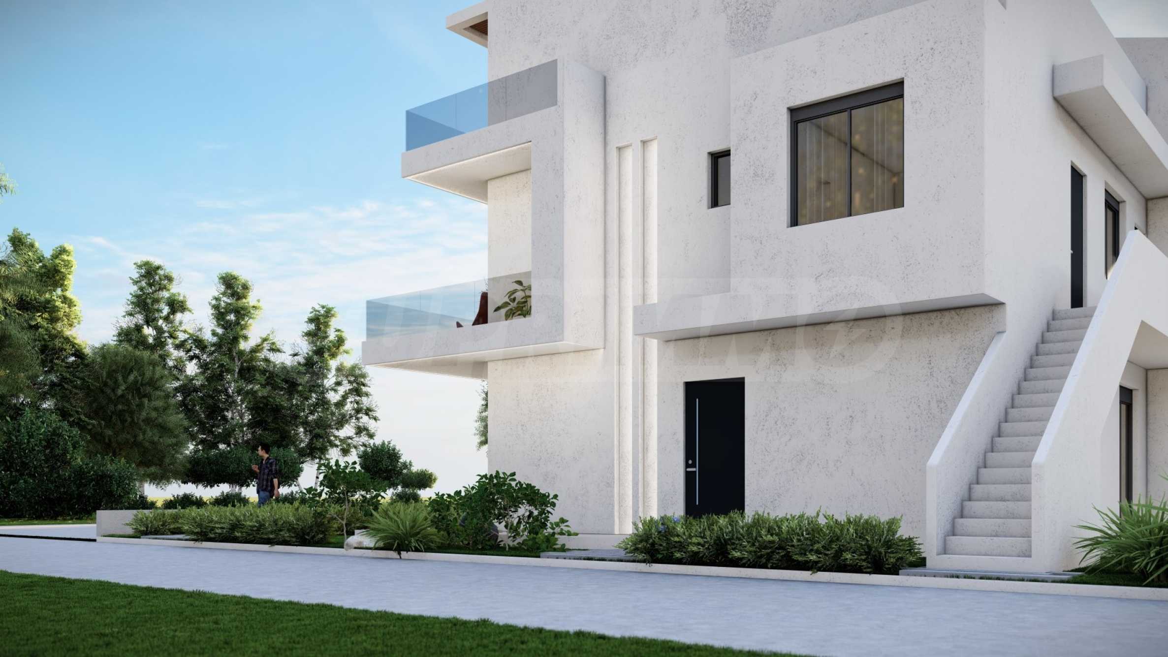 Внешний вид здания соответствует последним тенденциям современного строительства — чистые линии, светлые тона фасадов и элегантные застекленные террасы. Внешние лестницы, ведущие на второй этаж, спроектированы так, чтобы обеспечить максимальный комфорт и приватность.