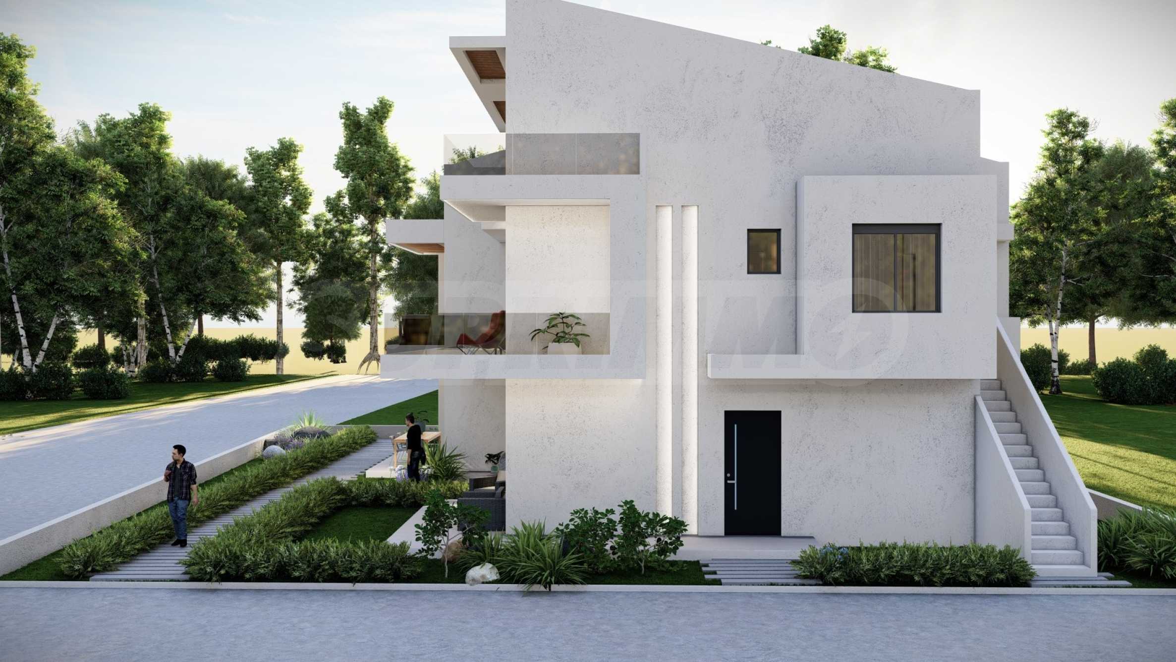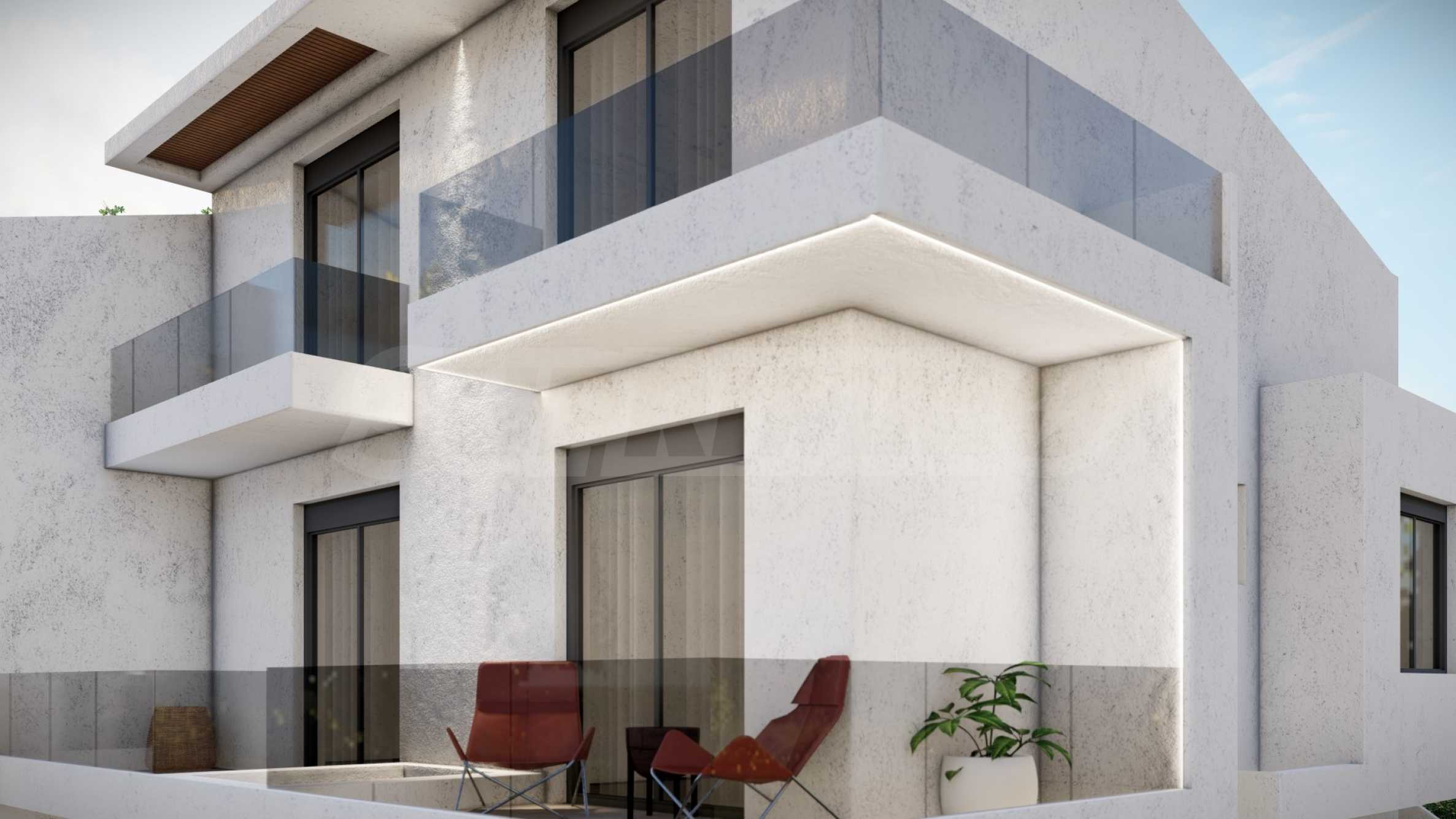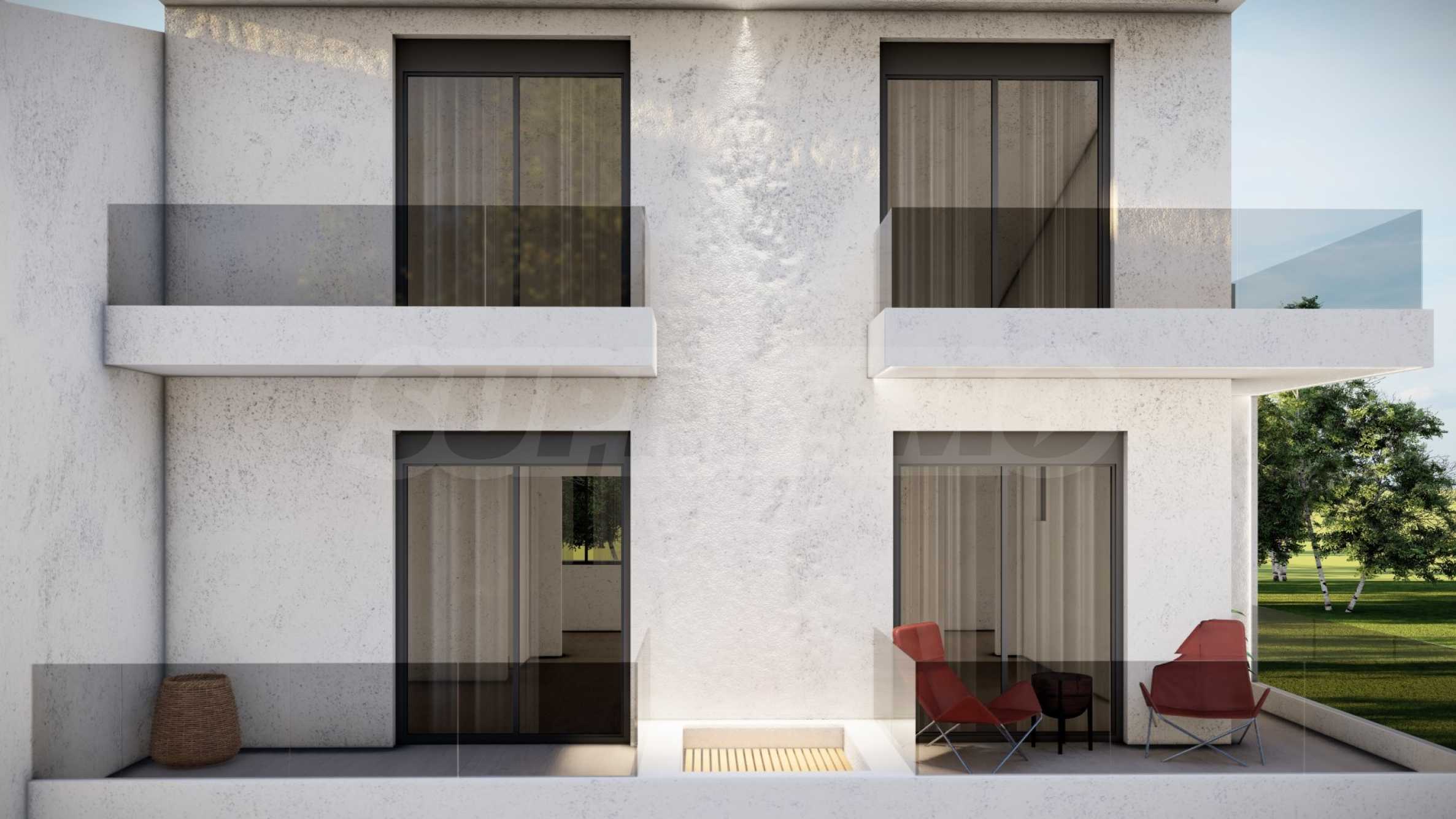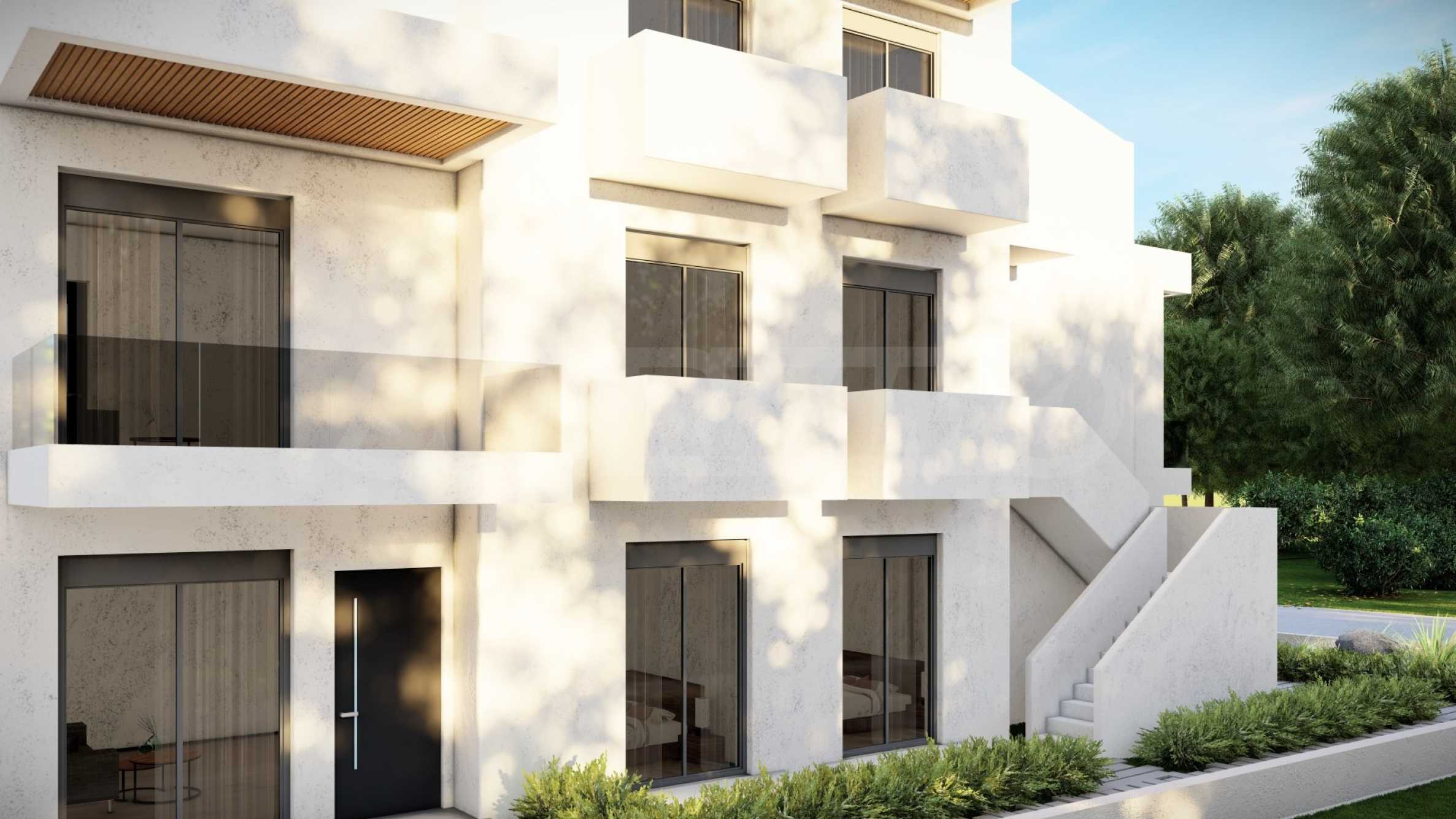 Внешний вид здания соответствует последним тенденциям современного строительства — чистые линии, светлые тона фасадов и элегантные застекленные террасы. Внешние лестницы, ведущие на второй этаж, спроектированы так, чтобы обеспечить максимальный комфорт и приватность.