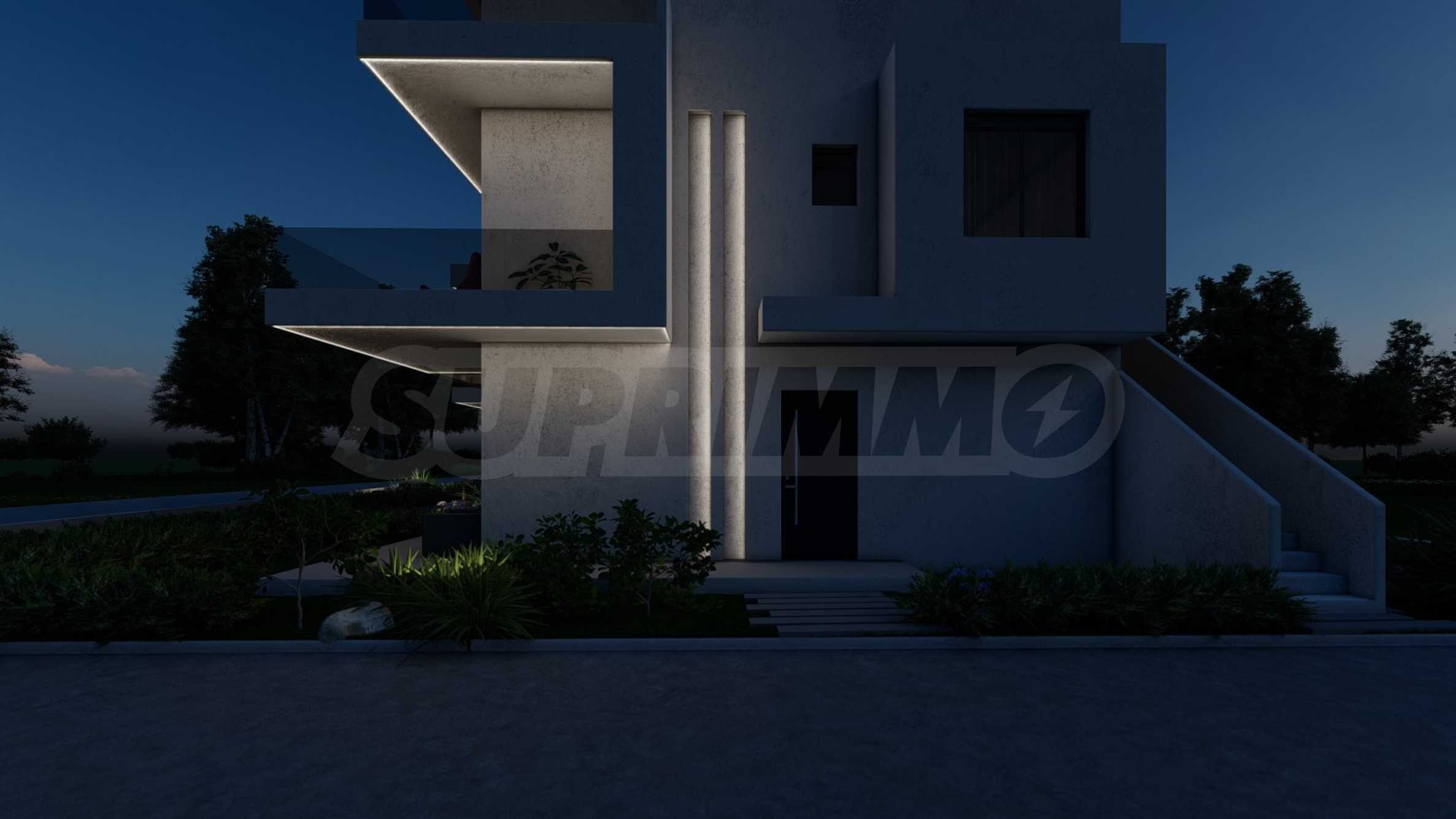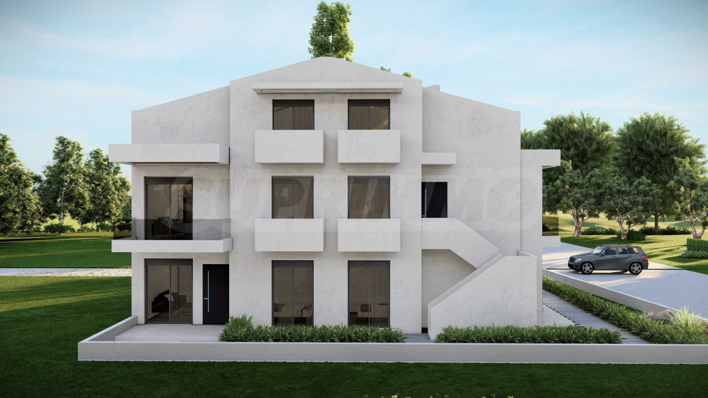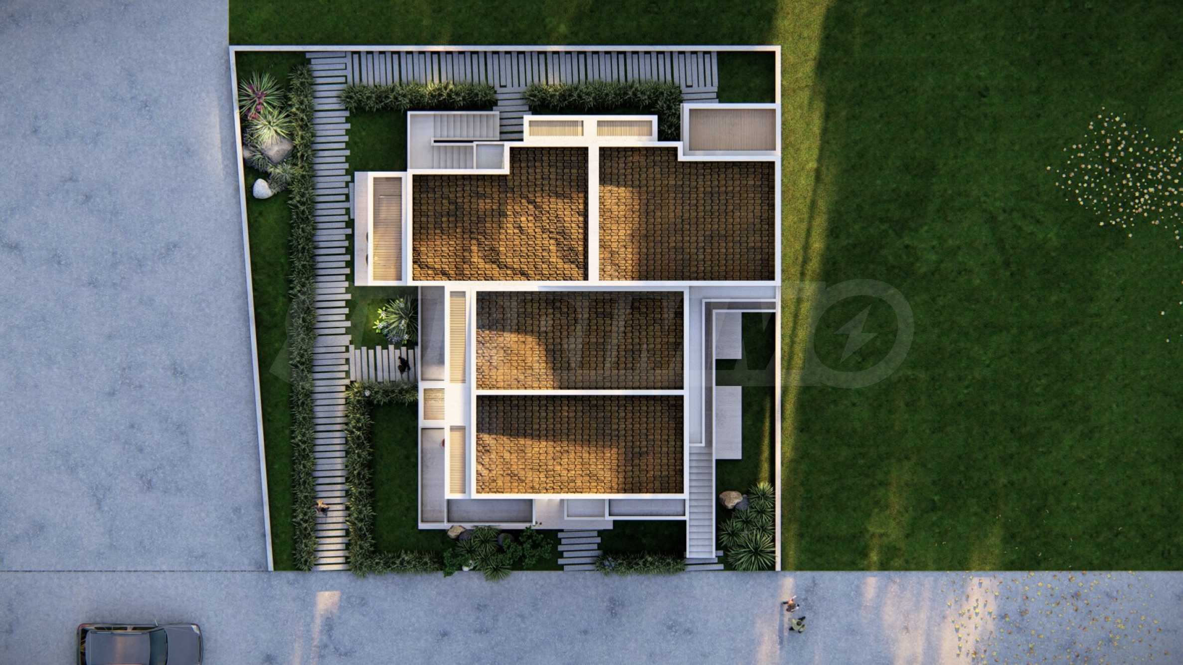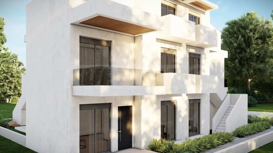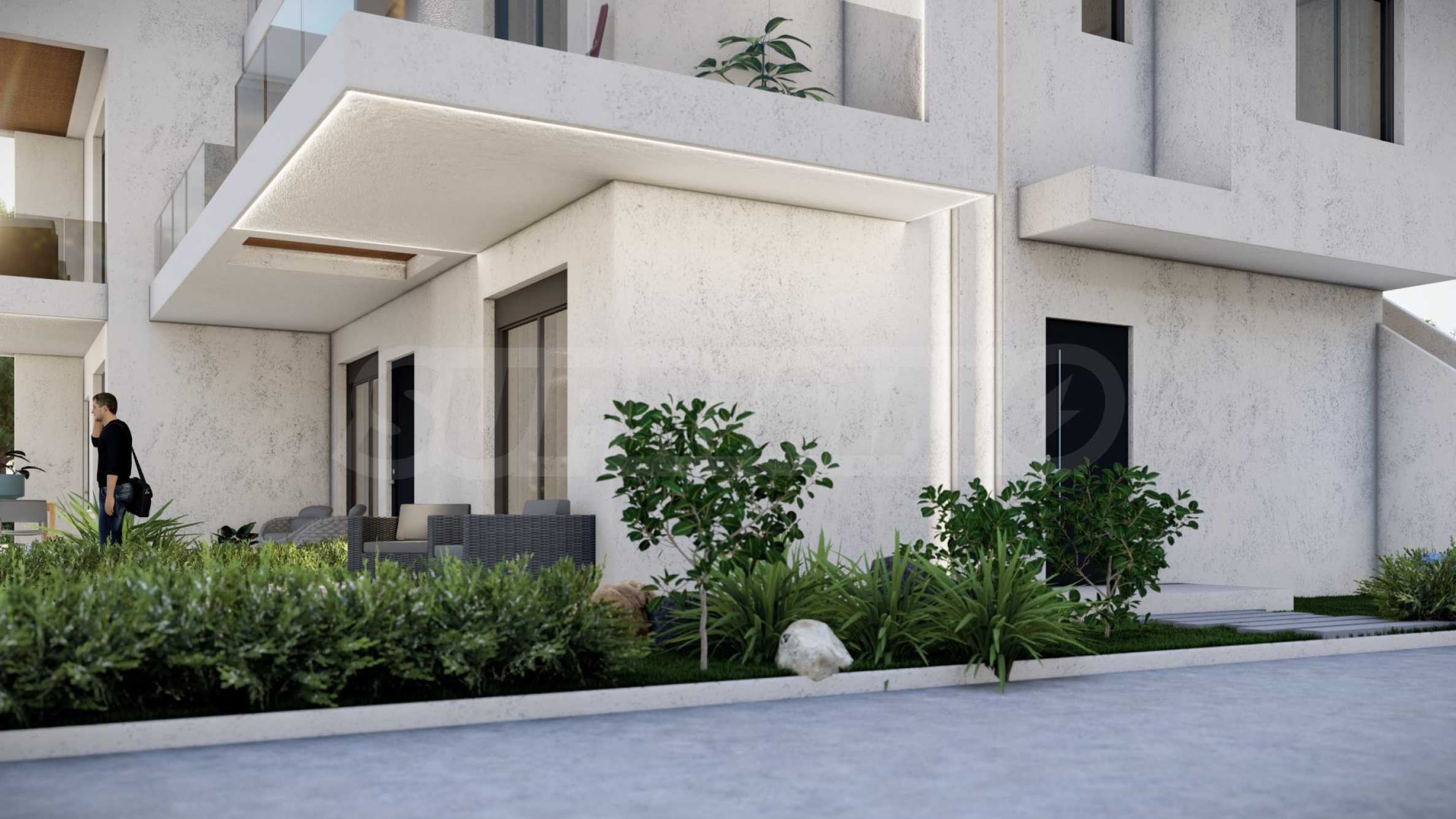 Внешний вид здания соответствует последним тенденциям современного строительства — чистые линии, светлые тона фасадов и элегантные застекленные террасы. Внешние лестницы, ведущие на второй этаж, спроектированы так, чтобы обеспечить максимальный комфорт и приватность.