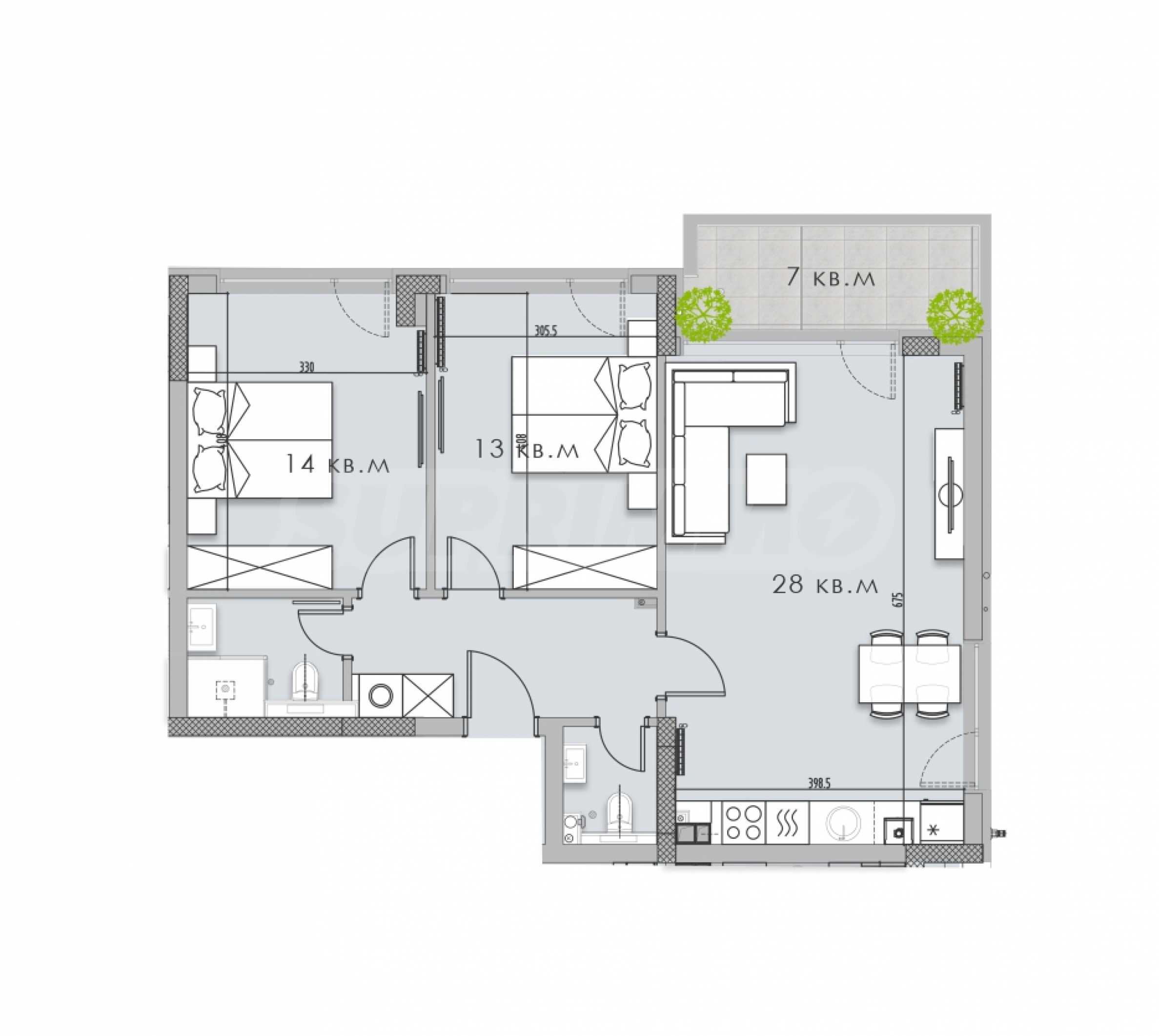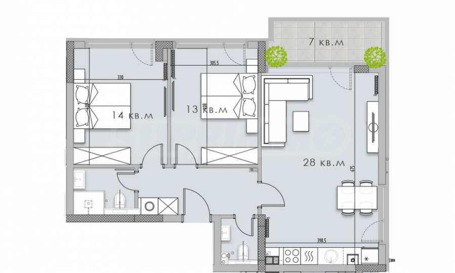 - две спальни;