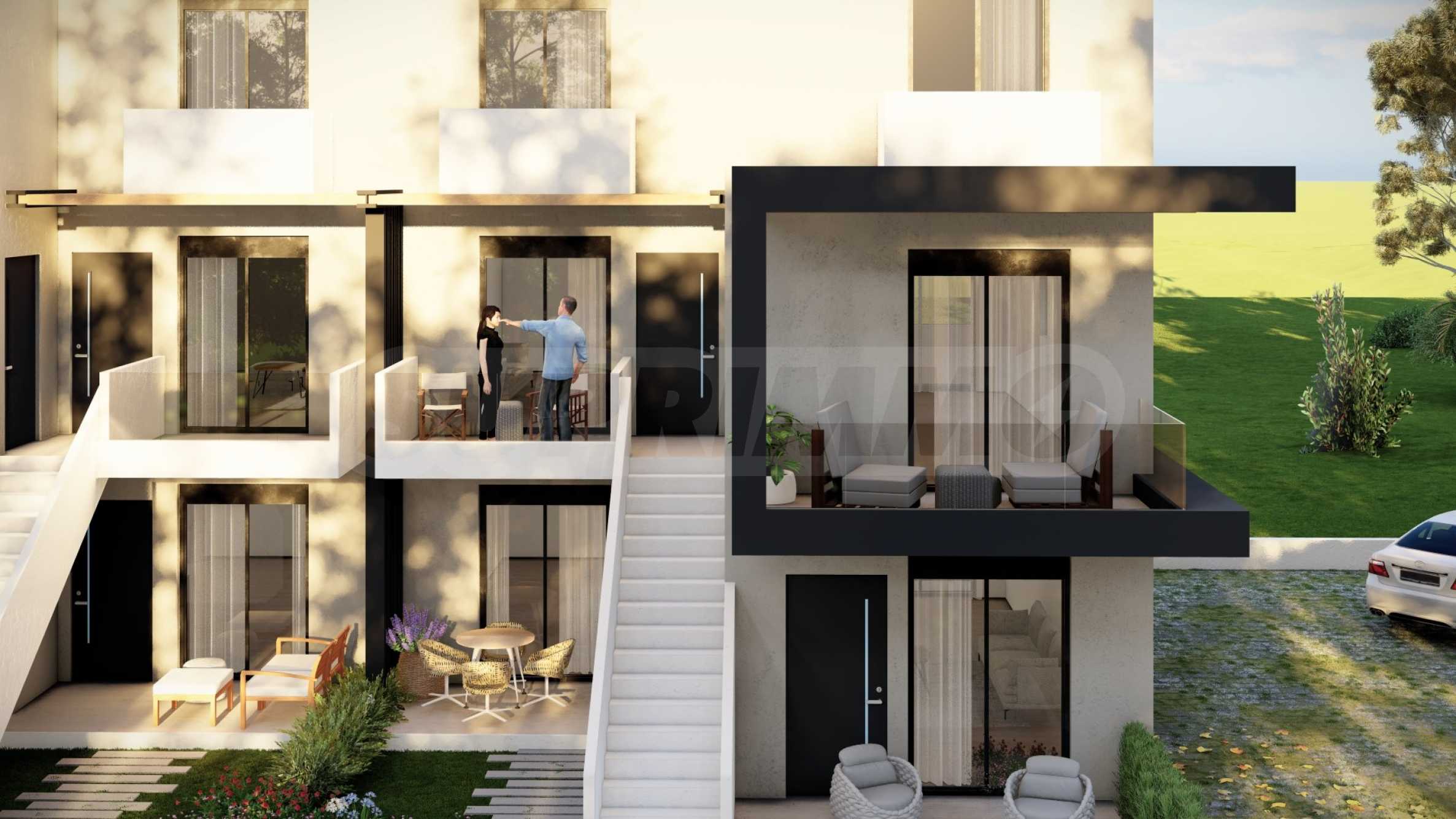 - Планировка включает в себя гостиную с отдельной кухонной зоной, спальню и ванную комнату с туалетом на одном уровне и главную спальню с собственной ванной комнатой и террасой на втором уровне.
