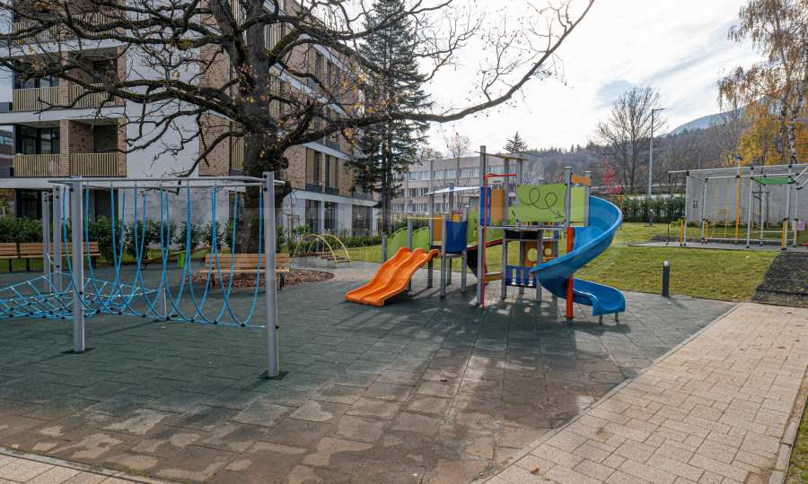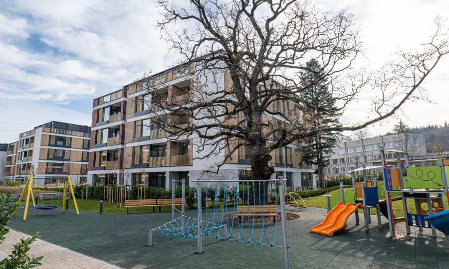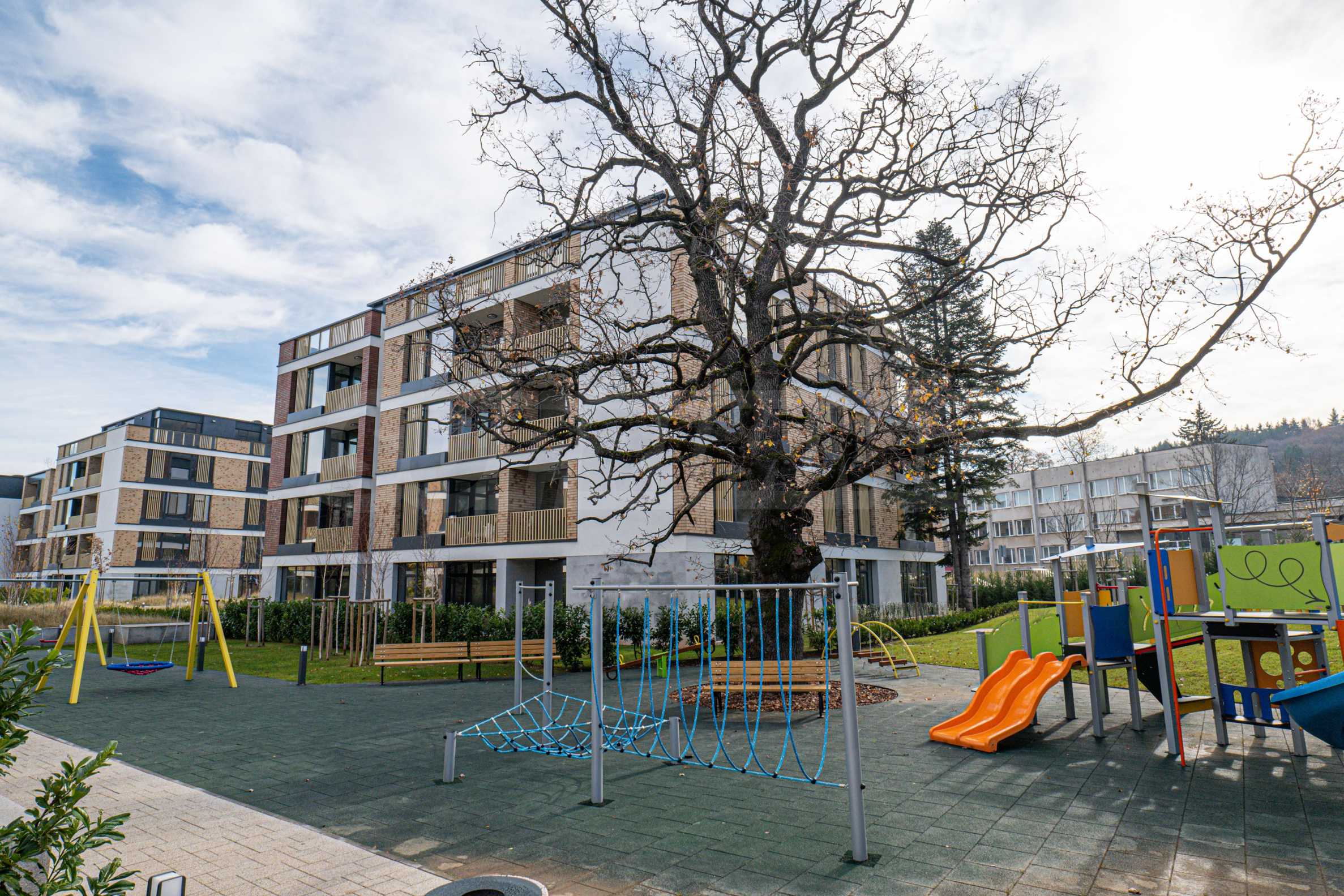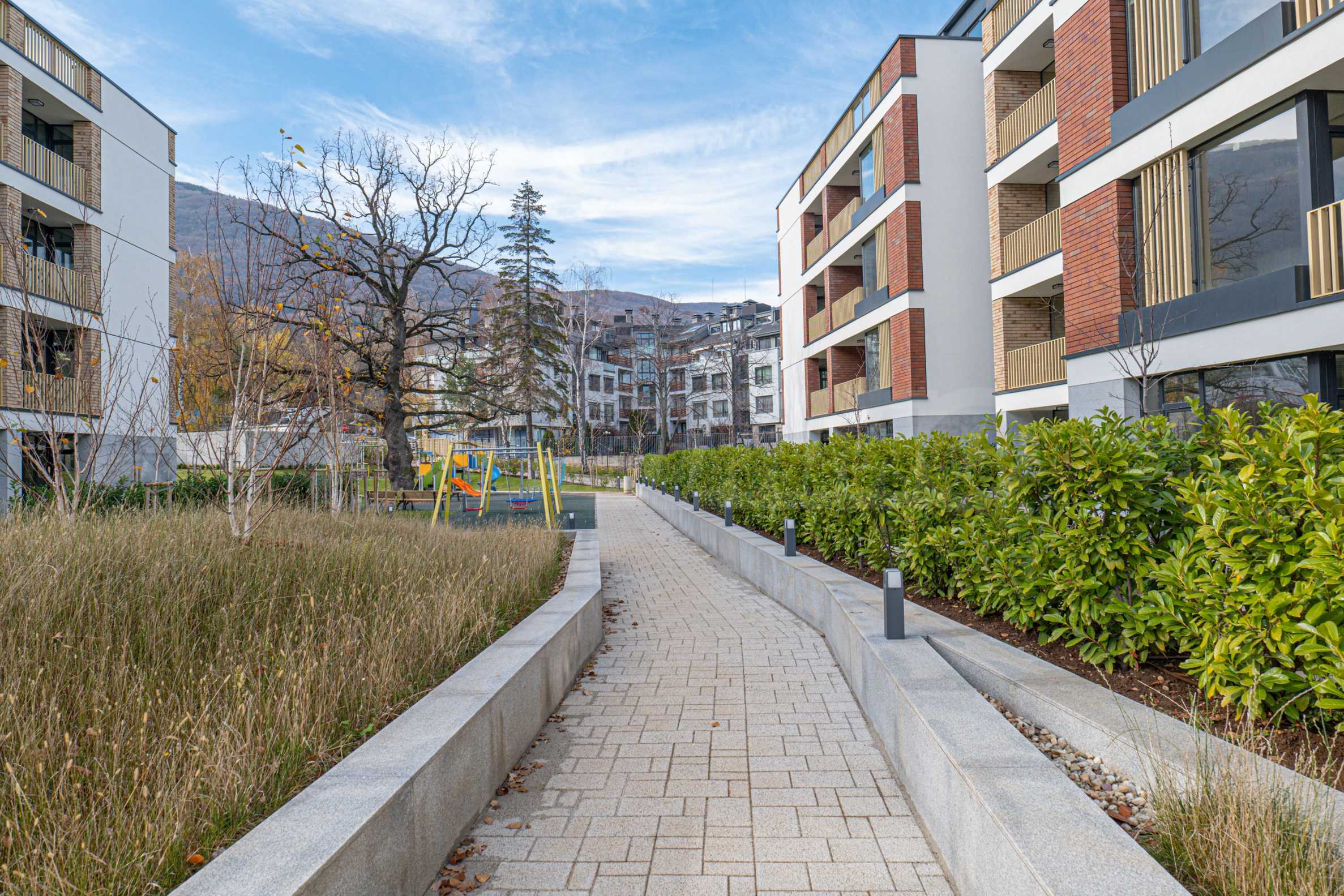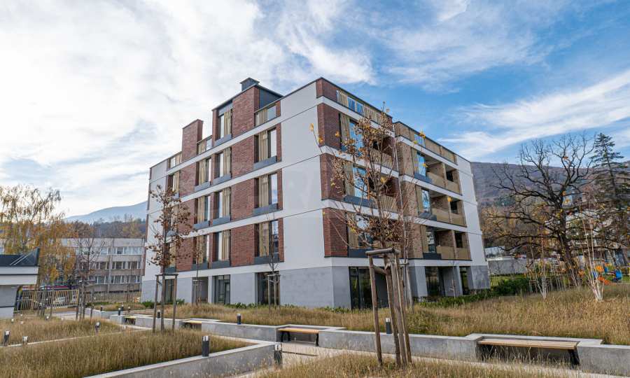 Архитектура комплекса гармонирует с окружающей средой, а фасады отделаны натуральными материалами, такими как дерево и камень, что обеспечивает современный вид, отличную изоляцию и долговечность.