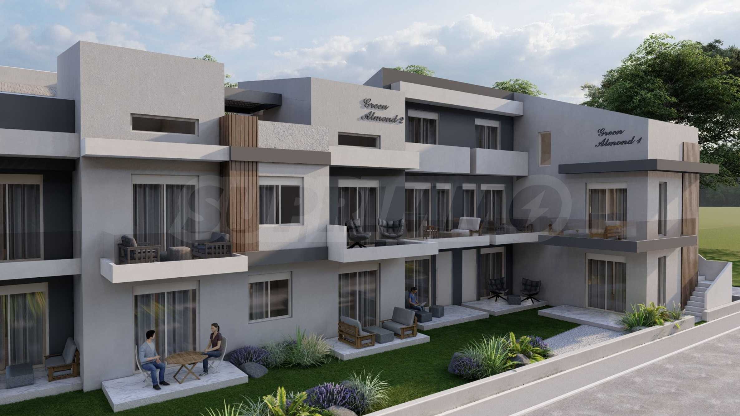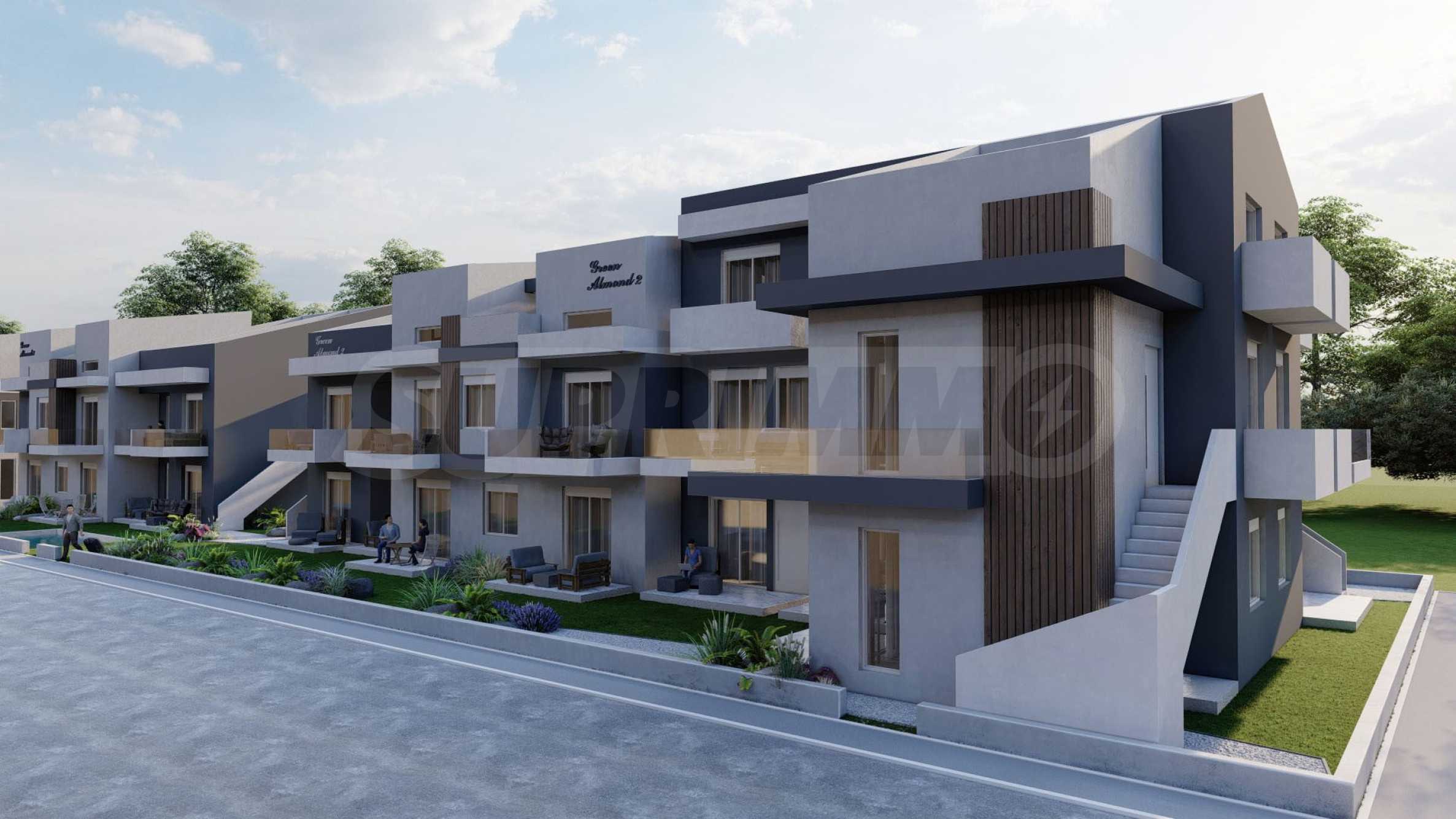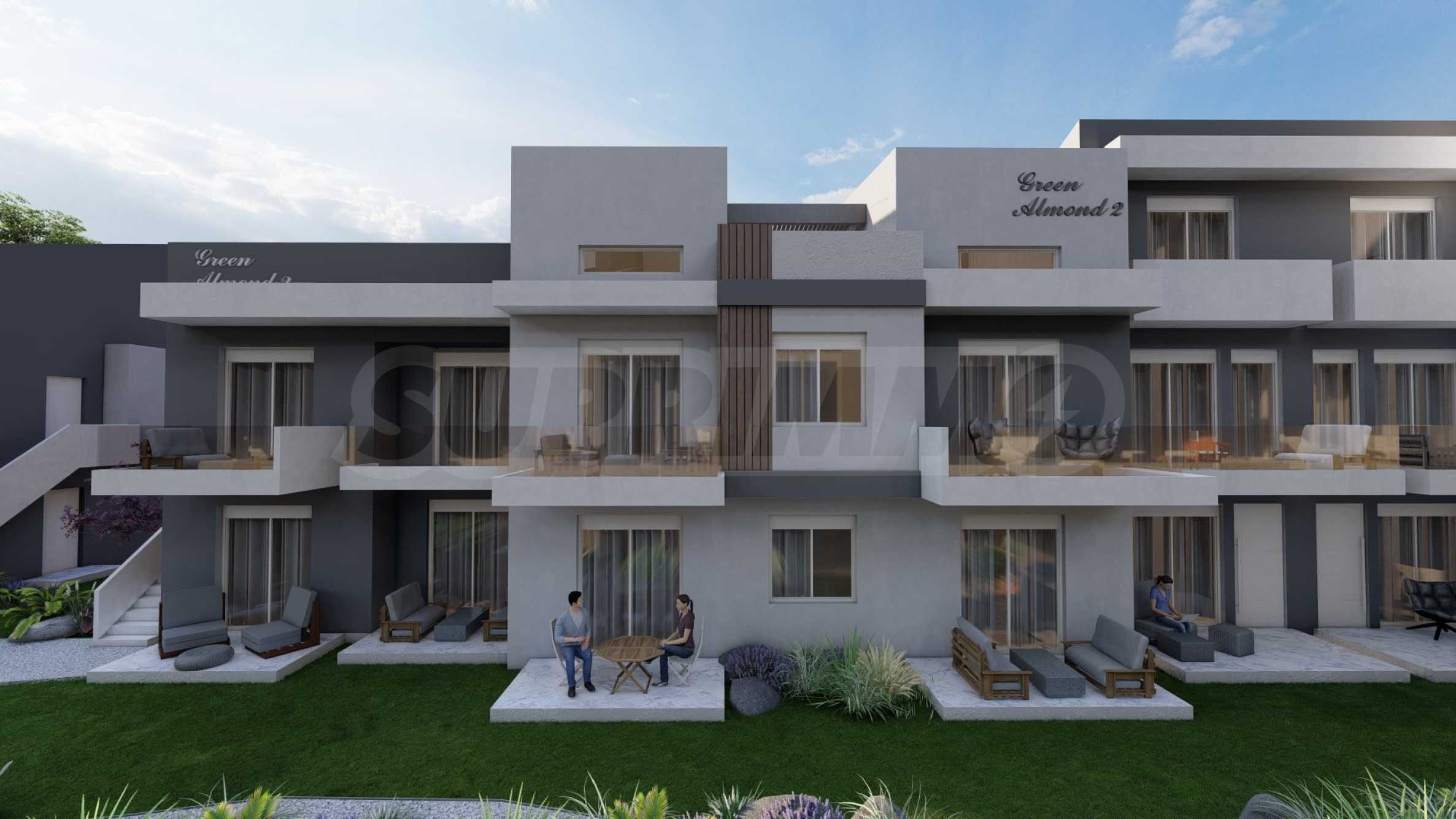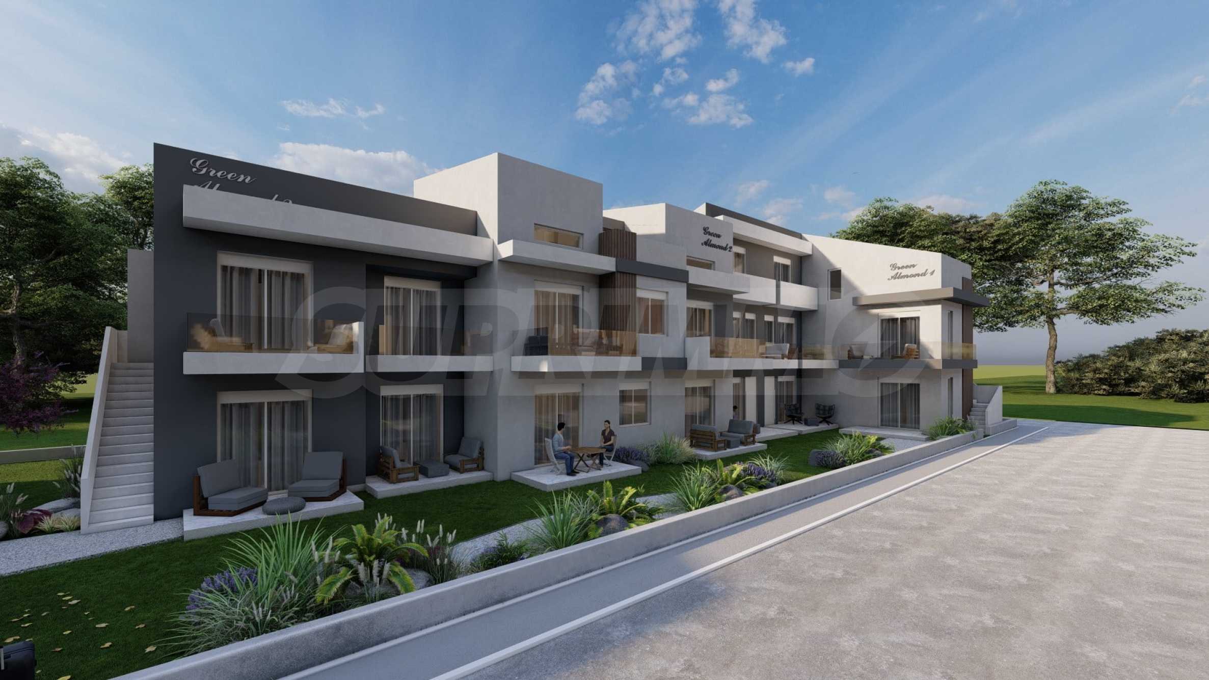 Green Almond — это комплекс из 8 зданий и 70 квартир с высококачественным строительством и инновационными архитектурными решениями, предлагающий жилую среду, сочетающую роскошь и комфорт. Здания имеют современные фасады, контрастные цвета и фактуры, что придает им стильный и вневременной облик. Пространство между зданиями используется рационально, для жильцов предусмотрены парковочные места. К вашим услугам три открытых бассейна, где вы можете наслаждаться водой и загорать, не выходя из дома.