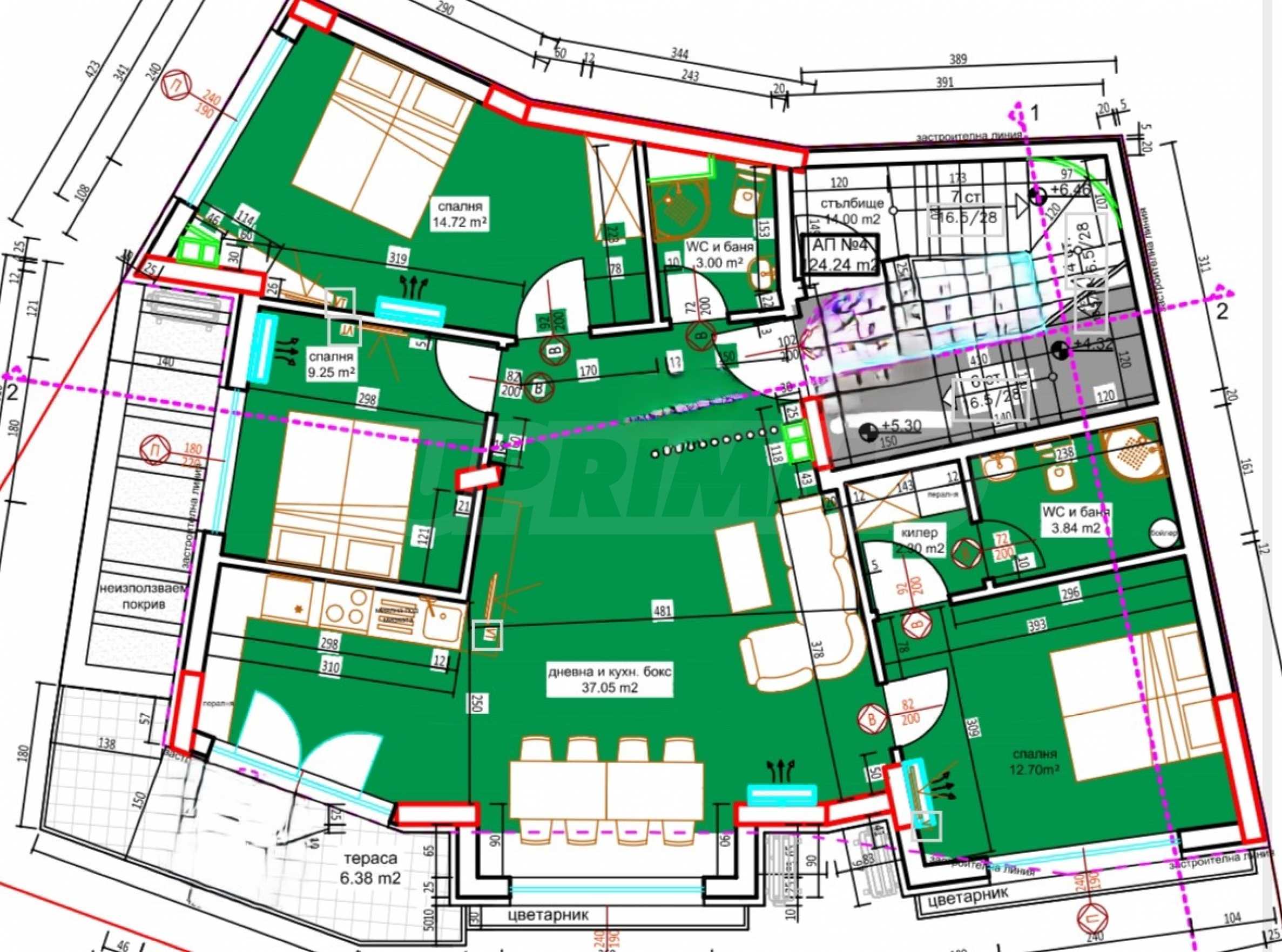 Представляем вам многокомнатную квартиру в изысканном здании, расположенном в самом центре Пловдива, в непосредственной близости от парка Бунарджик, центральной части города и торгового центра Марково Тепе. Местоположение сочетает в себе спокойствие природы и динамику городской жизни, обеспечивая своим жителям удобство, комфорт и престиж.
